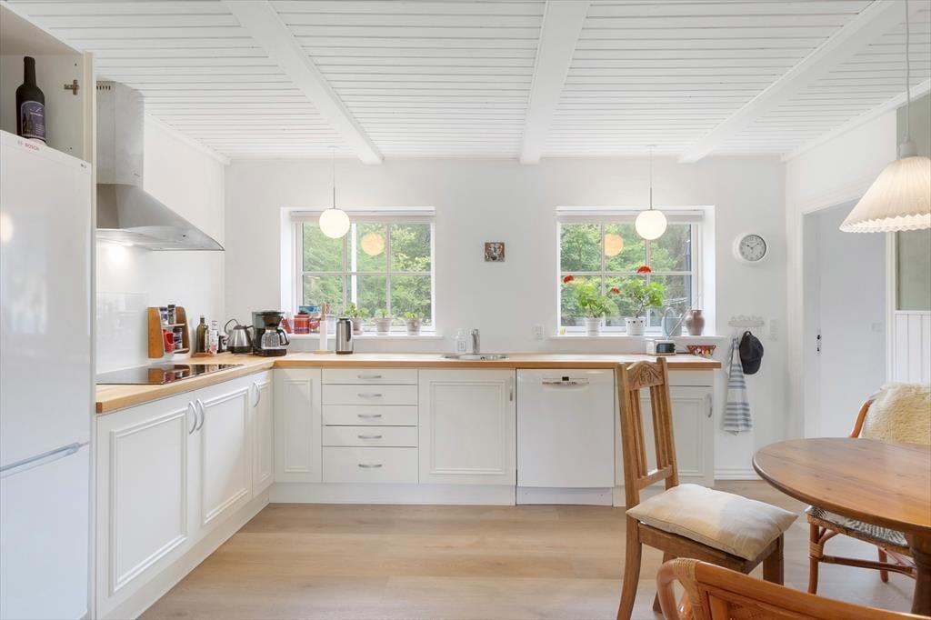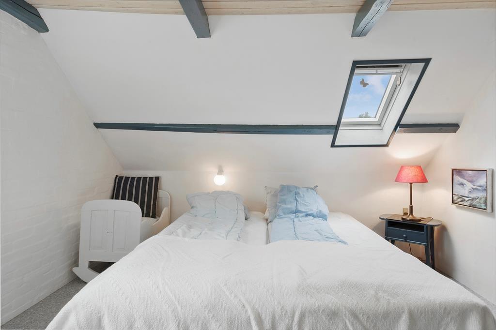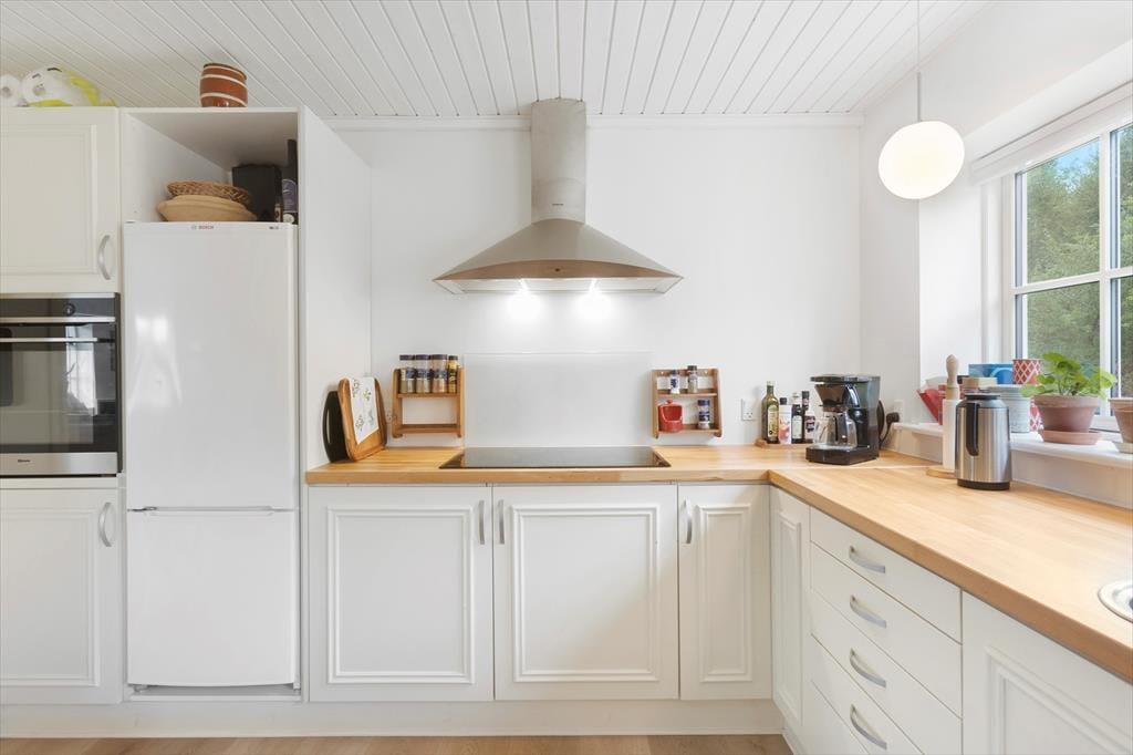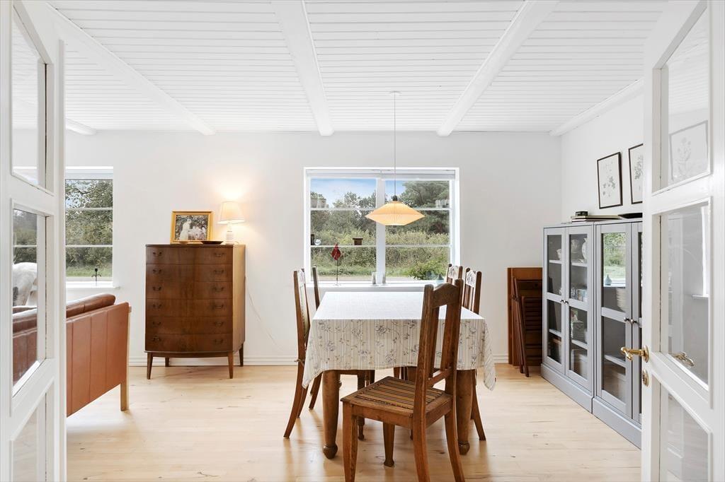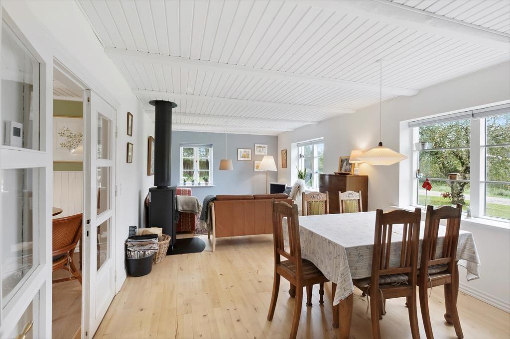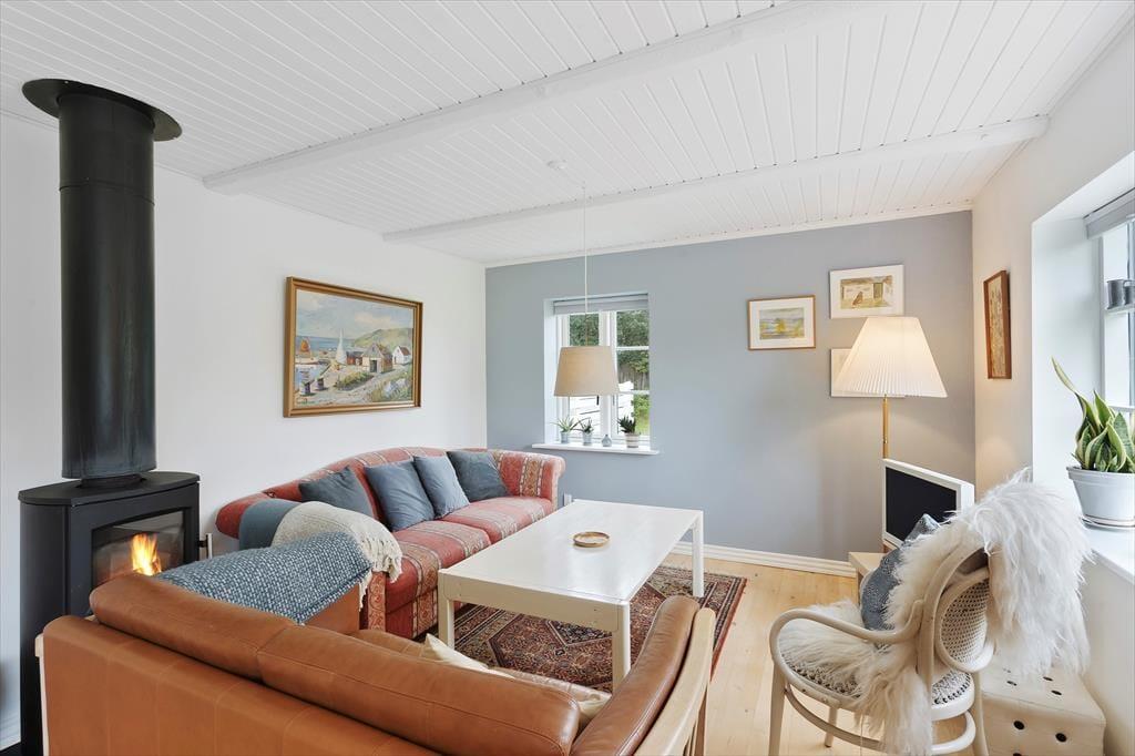 Indenfor mødes du af en varm og indbydende stemning, hvor lyset strømmer ind gennem de store vinduer, og loftet åbner sig højt over opholdsrummet. Det lyse køkken-alrum danner rammen om hyggelige måltider og lange samtaler ved spisebordet, mens brændeovnen knitrer i baggrunden og spreder dejlig varme på kølige dage. Her kan børnene lege, mens de voksne nyder en kop kaffe – og når mørket falder på, indbyder sofahjørnet til film, spil og familiehygge. Indretningen er enkel og behagelig med fokus på komfort og tidløs sommerhusstemning, så du hurtigt føler dig hjemme.