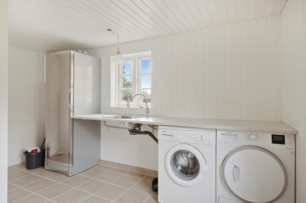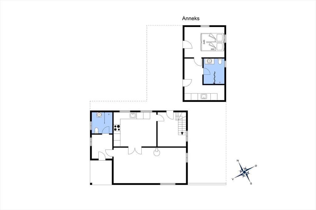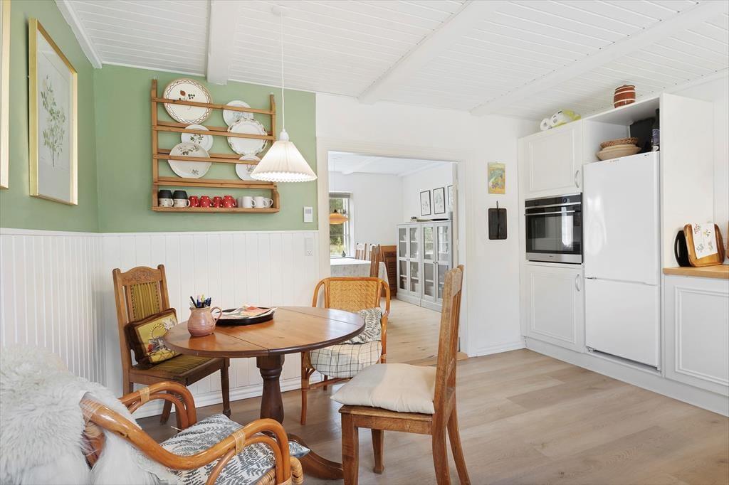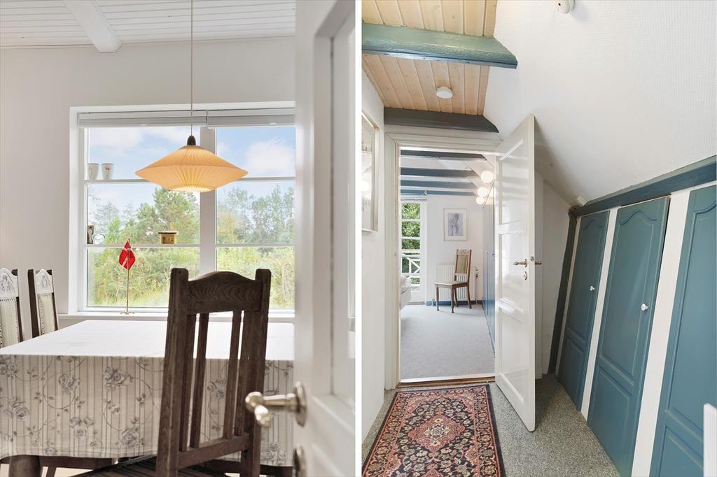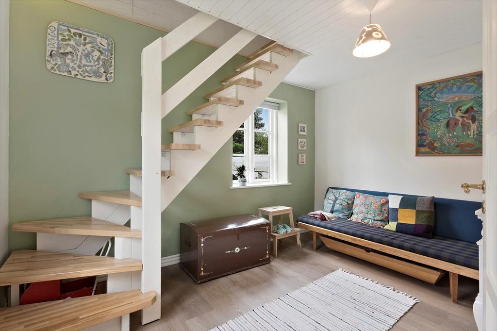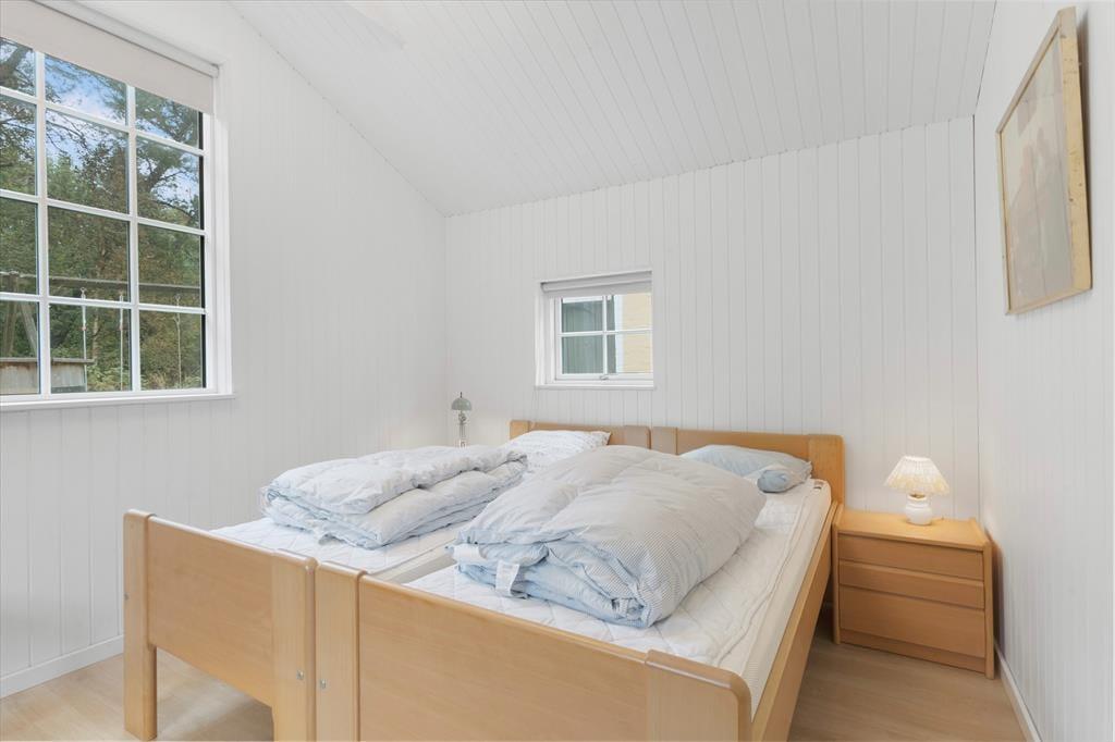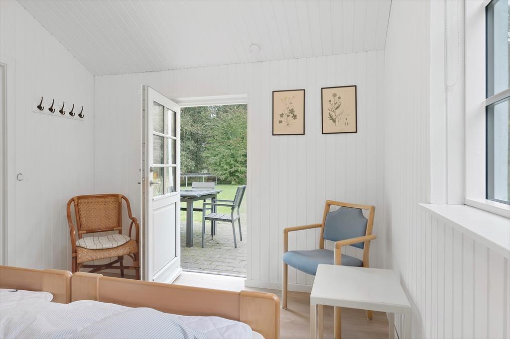 Indenfor mødes du af en varm og indbydende stemning, hvor lyset strømmer ind gennem de store vinduer, og loftet åbner sig højt over opholdsrummet. Det lyse køkken-alrum danner rammen om hyggelige måltider og lange samtaler ved spisebordet, mens brændeovnen knitrer i baggrunden og spreder dejlig varme på kølige dage. Her kan børnene lege, mens de voksne nyder en kop kaffe – og når mørket falder på, indbyder sofahjørnet til film, spil og familiehygge. Indretningen er enkel og behagelig med fokus på komfort og tidløs sommerhusstemning, så du hurtigt føler dig hjemme.