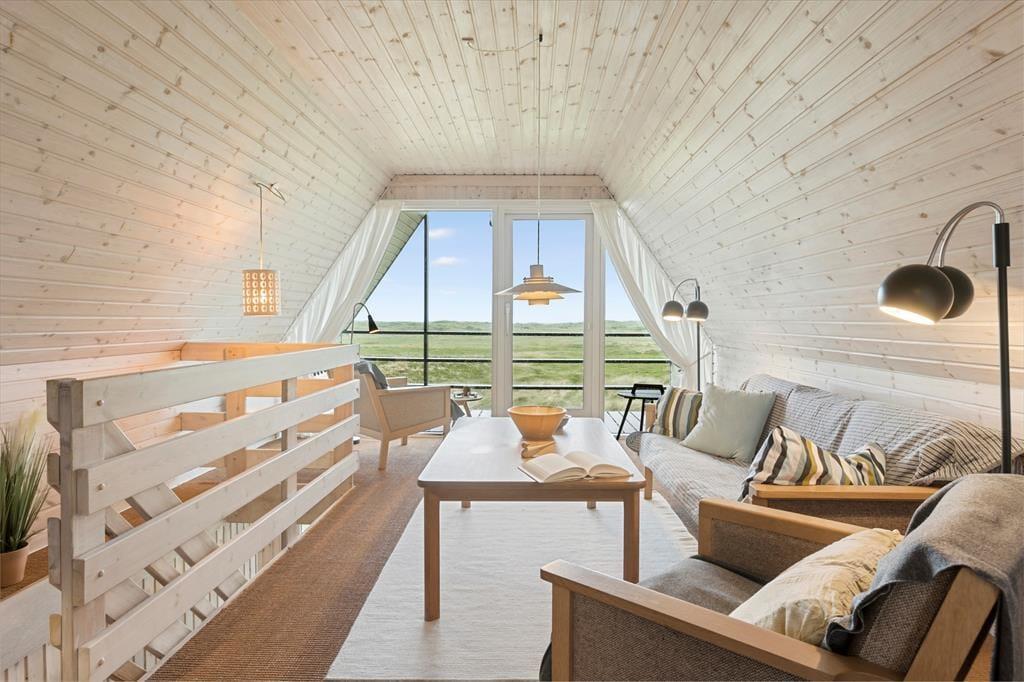 Udenfor venter to dejlige terrasser, hvor du kan nyde solen hele dagen. Den ene terrasse er sydvendt og ideel til morgenkaffen, mens den anden vender mod vest og indbyder til middag i solnedgangen. Begge terrasser er udstyret med havemøbler og parasol, så du kan slappe af og nyde den friske luft i fulde drag. Grunden er omgivet af klitter og højt græs, hvilket giver en følelse af at være helt tæt på naturen. Fra første sal har du desuden en balkon, hvor du kan nyde den ugenerede udsigt over landskabet og Vesterhavet.