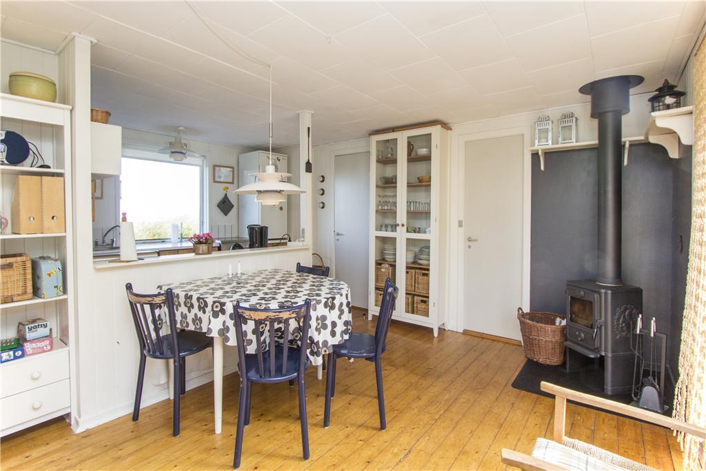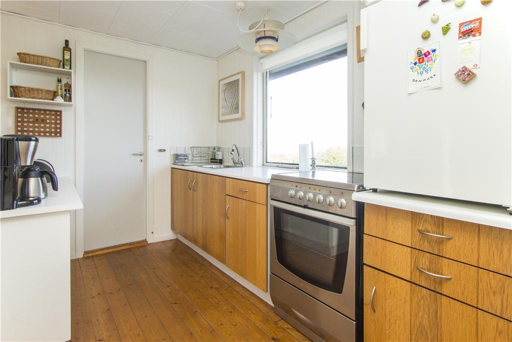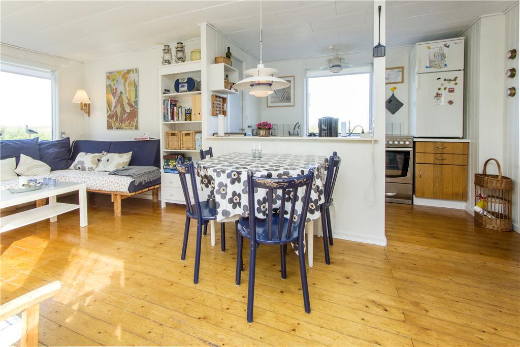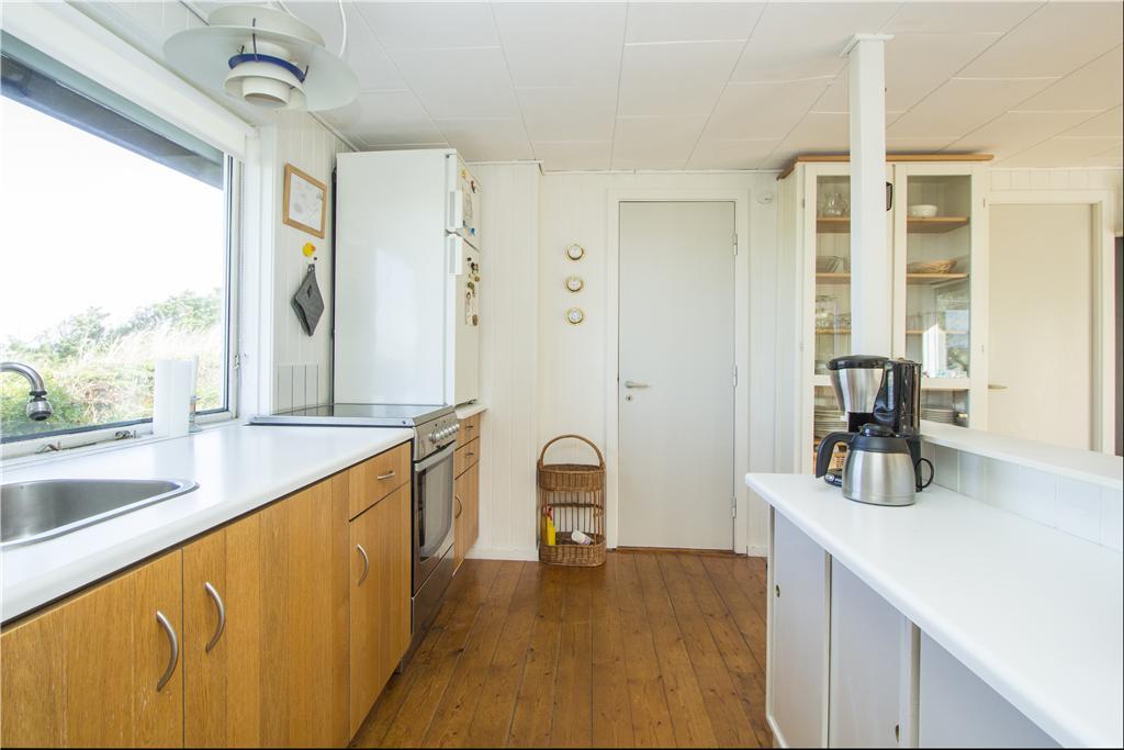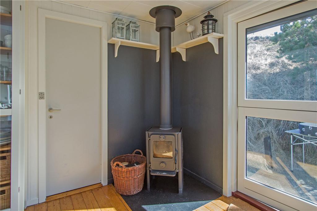 Indendørs byder sommerhuset på en lys og rummelig stue, hvor store vinduespartier trækker naturens skønhed ind i rummet. Brændeovnen står klar til at skabe hygge på de køligere dage, og her er der rig mulighed for at samles som familie til en god film eller et brætspil. Det åbne køkken skaber en naturlig forbindelse til spiseområdet, hvor alle kan samles til måltider, mens de nyder den dejlige atmosfære. Med den lyse indretning og de hyggelige detaljer er dette sommerhus et perfekt sted til afslapning og samvær. Der er god plads til at finde sin egen krog og læse en bog, eller man kan samles om en god middag, der laves i det veludstyrede køkken.