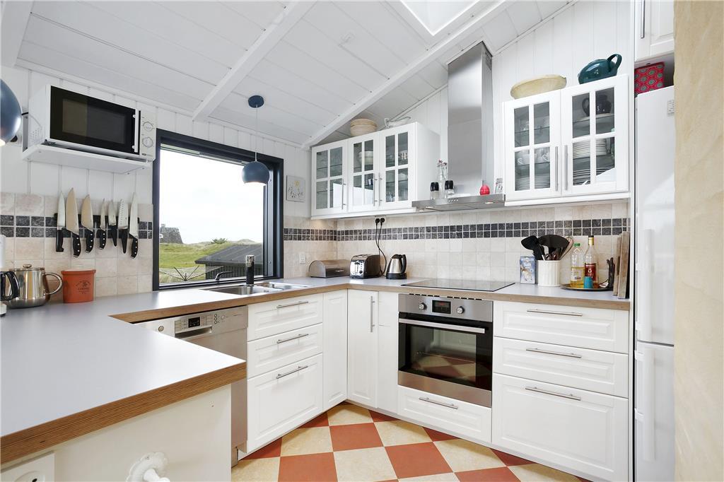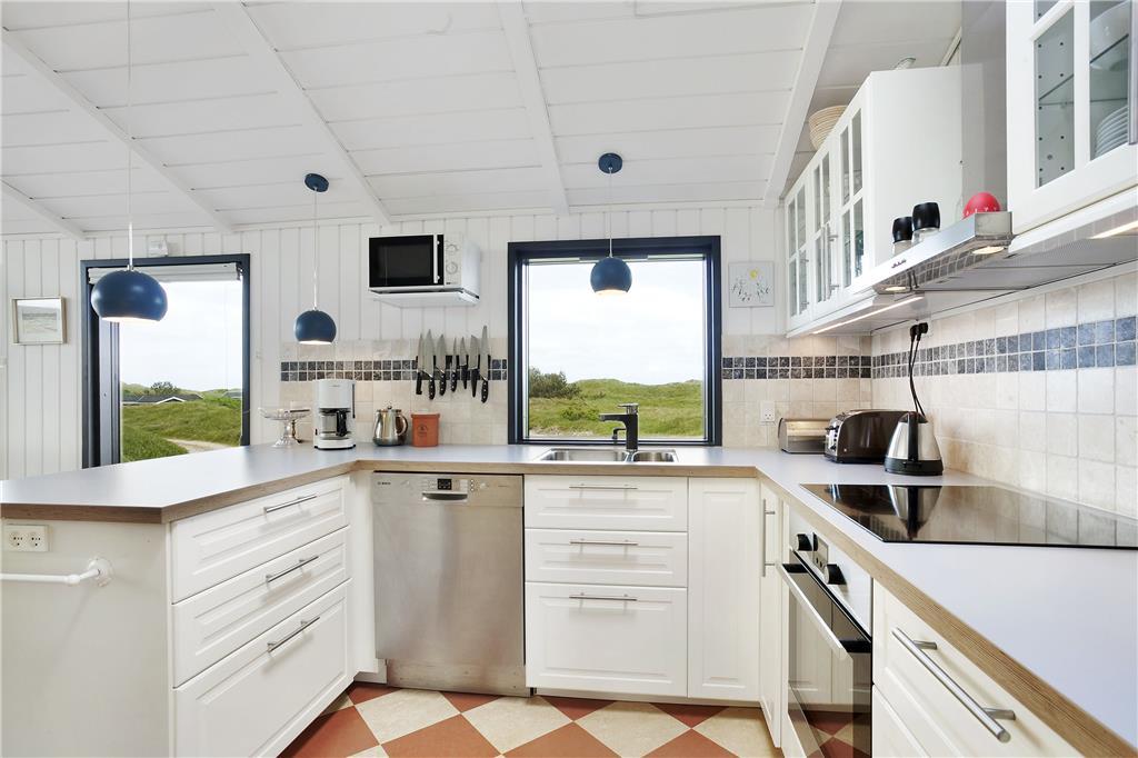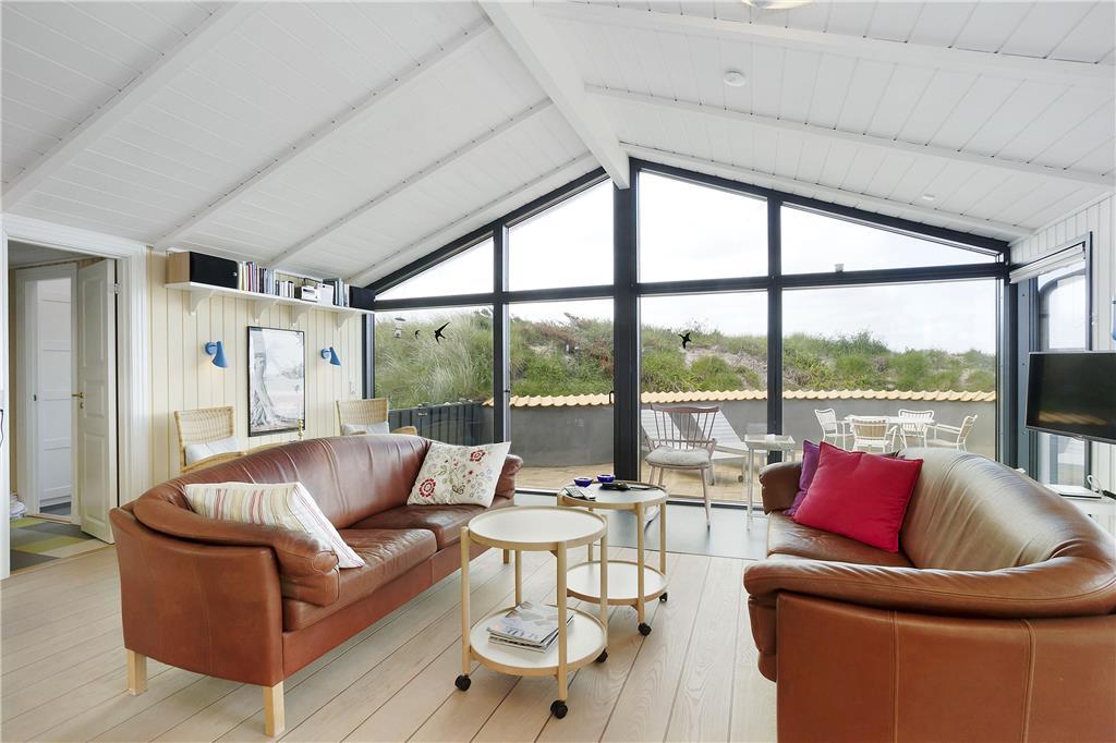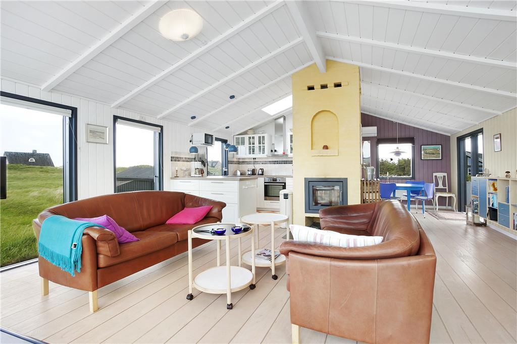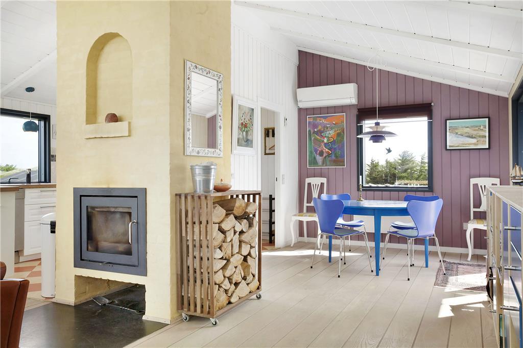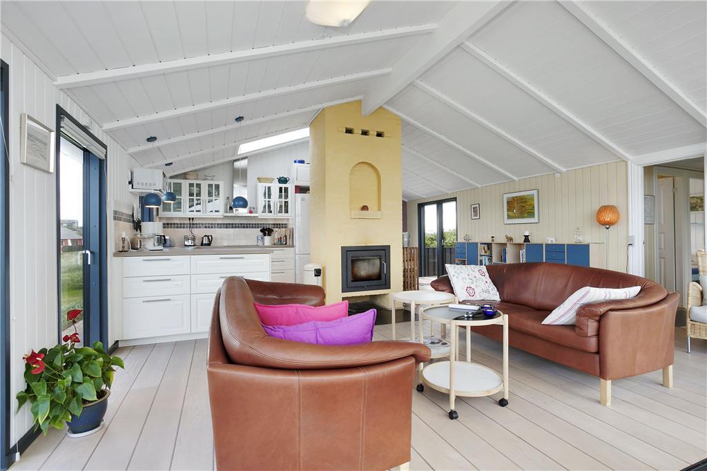 Som du træder ind i sommerhuset, bliver du mødt af en lys og indbydende stue, der har store vinduespartier, som bringer naturen og det smukke lys ind i rummet. Her er den perfekte ramme for afslapning med hele familien. Brændeovnen giver en hyggelig atmosfære, hvor du kan varme dig efter en tur på stranden, eller blot nyde en stille aften med en god bog. Den åbne og luftige planløsning gør huset ideelt til familier, der vil samles og hygge sig sammen. Her er også god plads til afslapning og samvær – hvad enten det er ved spisebordet eller i de komfortable sofamøbler.