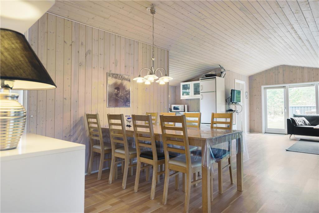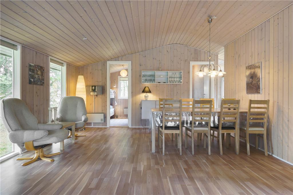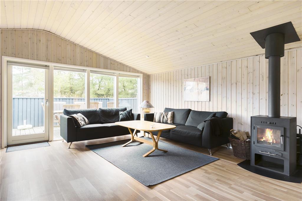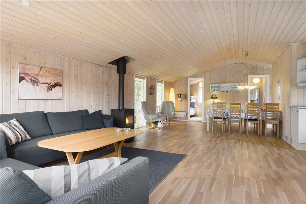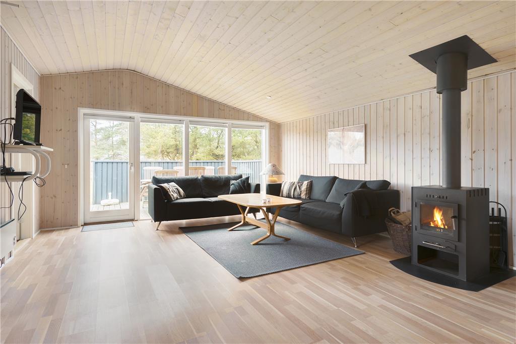 Når du træder indenfor i sommerhuset, mødes du af en lys og indbydende atmosfære. Den hyggelige stue med højt til loftet og en knitrende brændeovn gør det til et perfekt sted at samles med familien eller venner. Her kan du slappe af med en god bog, spille brætspil eller bare nyde varmen fra ilden efter en dag ude i naturen. Det åbne køkken-alrum gør det nemt at tilberede måltider sammen, og den dejlige, lyse indretning understøtter en afslappet ferieoplevelse. Uanset om du vælger at bruge tid på at lave mad eller bare vil nyde hinandens selskab, er her en varm og indbydende atmosfære, der gør det let at trække sig tilbage og finde ro.