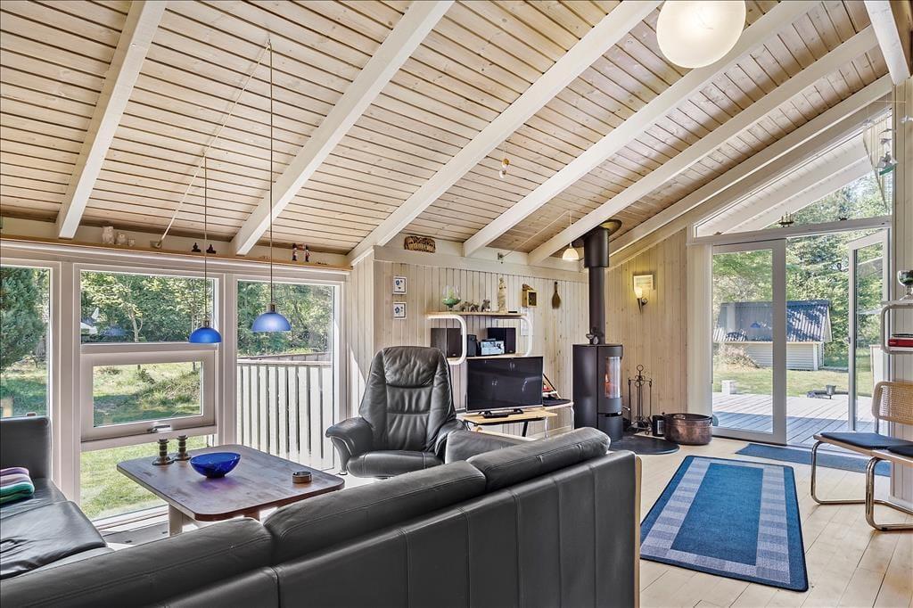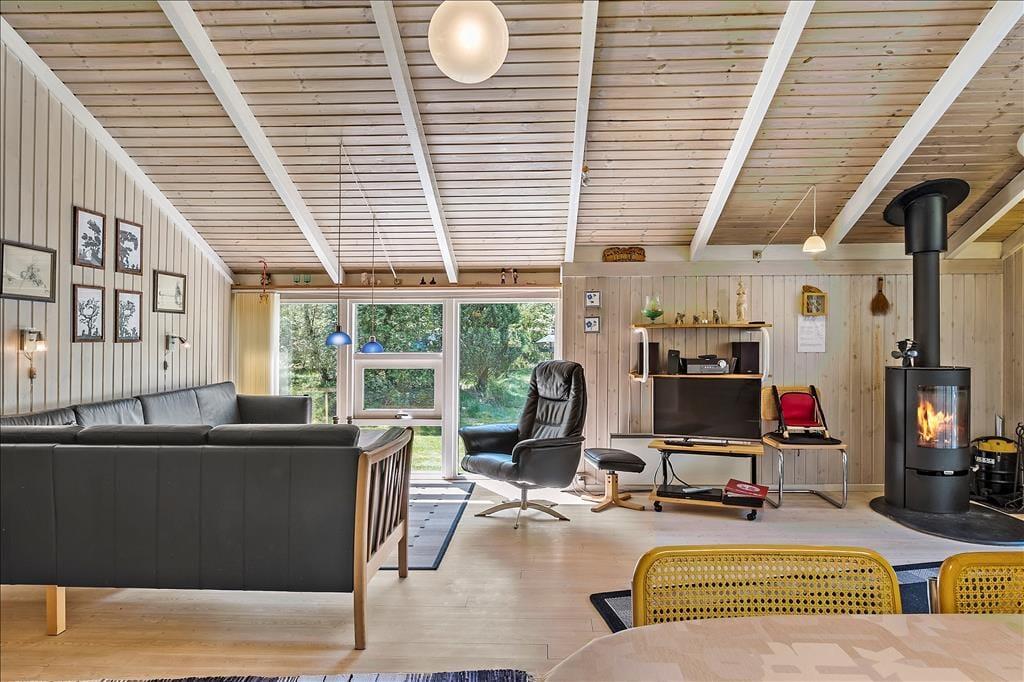 Indendørs byder sommerhuset på en hyggelig og rummelig stue, hvor hele familien kan samles omkring brændeovnen og nyde et spil brætspil eller en god film. Her er plads til både afslapning og fælles aktiviteter. De store vinduer giver et dejligt lysindfald og en skøn udsigt til naturen omkring huset. Køkkenet er praktisk indrettet, så I nemt kan lave måltider sammen. Når maden er klar, kan I samles om spisebordet, som er perfekt til familiens måltider. Sommerhusets badeværelse er også en oplevelse i sig selv, hvor I kan forkæle jer selv med en tur i saunaen eller slappe af i spabadet efter en aktiv dag ude i naturen.