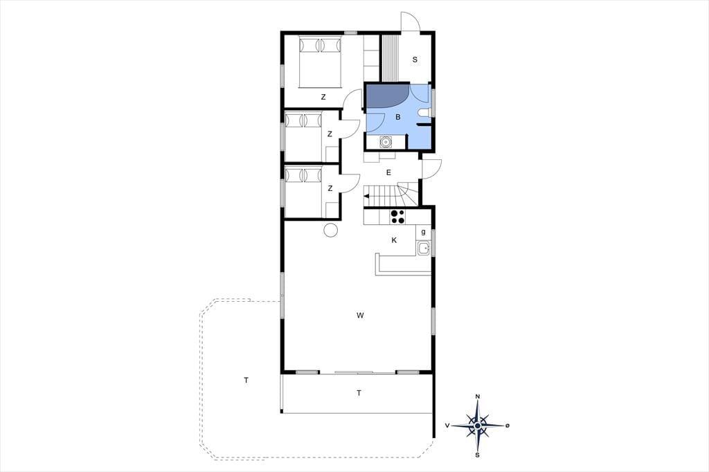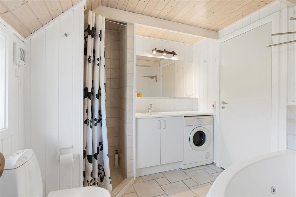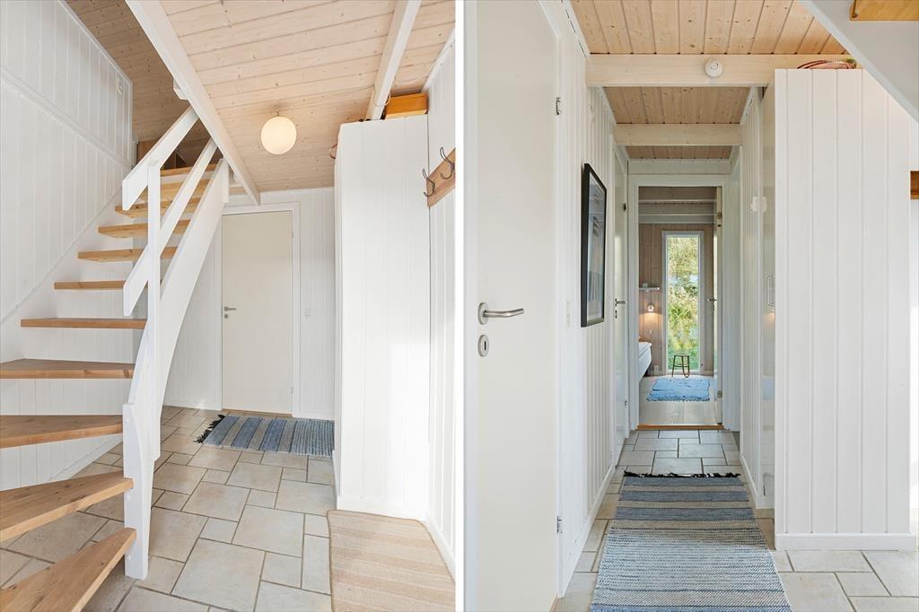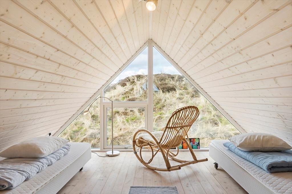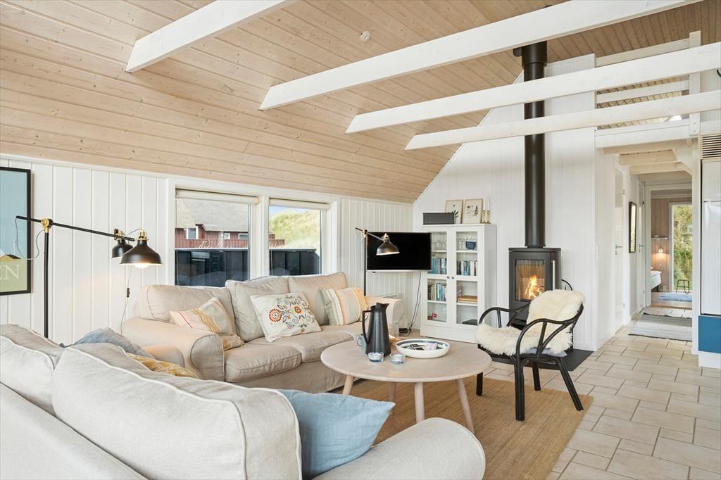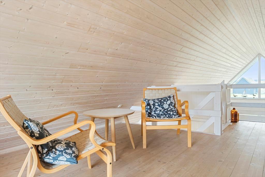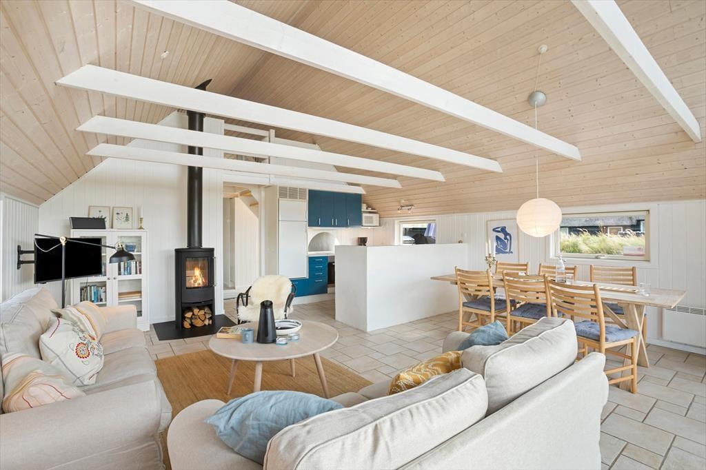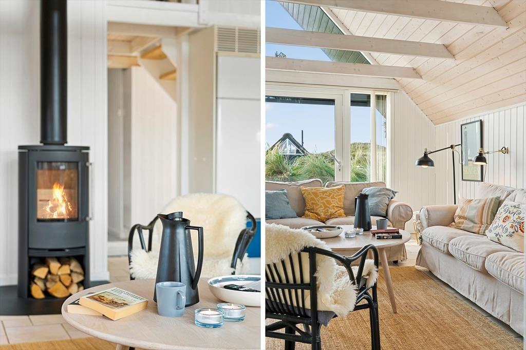 Når du træder ind i dette sommerhus, bliver du mødt af en lys og indbydende stue, hvor brændeovnen skaber en hyggelig atmosfære, der indbyder til afslapning. Her kan du slappe af med en god bog eller nyde en rolig aften foran ilden. De store vinduer giver masser af lys og mulighed for at kigge ud på den omkringliggende natur. Huset har også store hems, som skaber ekstra plads og en særlig atmosfære – perfekt til både børn og voksne, der søger et ekstra rum til at hygge sig eller finde lidt fred og ro. Badeværelset er også et kapitel for sig, hvor du kan forkæle dig selv med et afslappende spabad og en beroligende sauna – den ideelle måde at afslutte en dag i naturen.