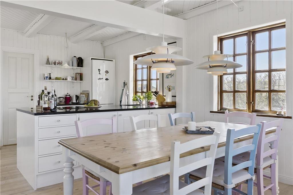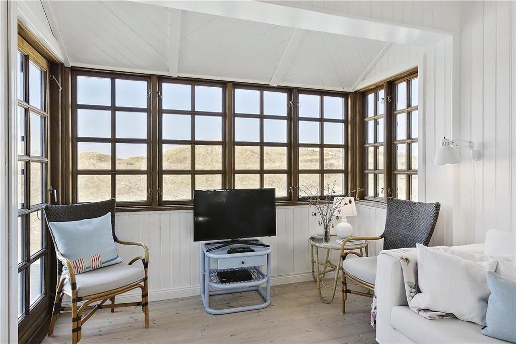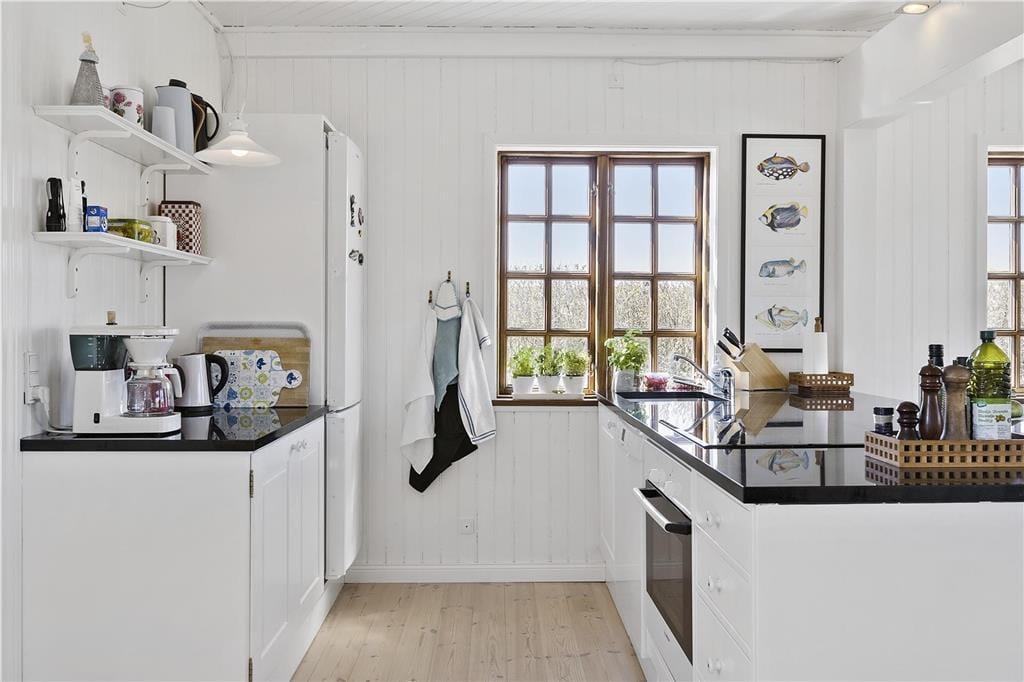 Indenfor bliver du mødt af en lys og indbydende atmosfære, hvor store vinduespartier bringer naturen tættere på. Stuen er både hyggelig og rummelig, og her er plads til at slappe af foran brændeovnen efter en lang dag ved stranden. Køkkenet er funktionelt og åbent, så du kan nyde samværet med dine nærmeste, mens du tilbereder måltider. Huset har en dejlig indretning, der appellerer til både afslapning og socialt samvær, og de rolige farver og lyse rum skaber den perfekte ferieoase, hvor du kan lade op.