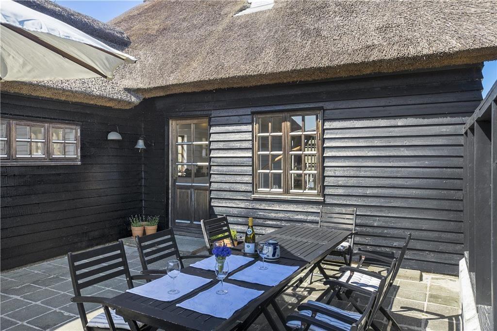 Udenfor er terrassen et fantastisk sted at tilbringe tid. Den vender mod syd, så du kan nyde solen hele dagen, og med udsigt over den idylliske grund kan du virkelig slappe af og være i nuet. Når vejret tillader det, er det et oplagt sted at spise middag under åben himmel eller nyde en god bog i solen. Den rolige grund er skærmet af høje træer og giver en dejlig følelse af privatliv, samtidig med at du har god plads til at udforske området omkring sommerhuset.