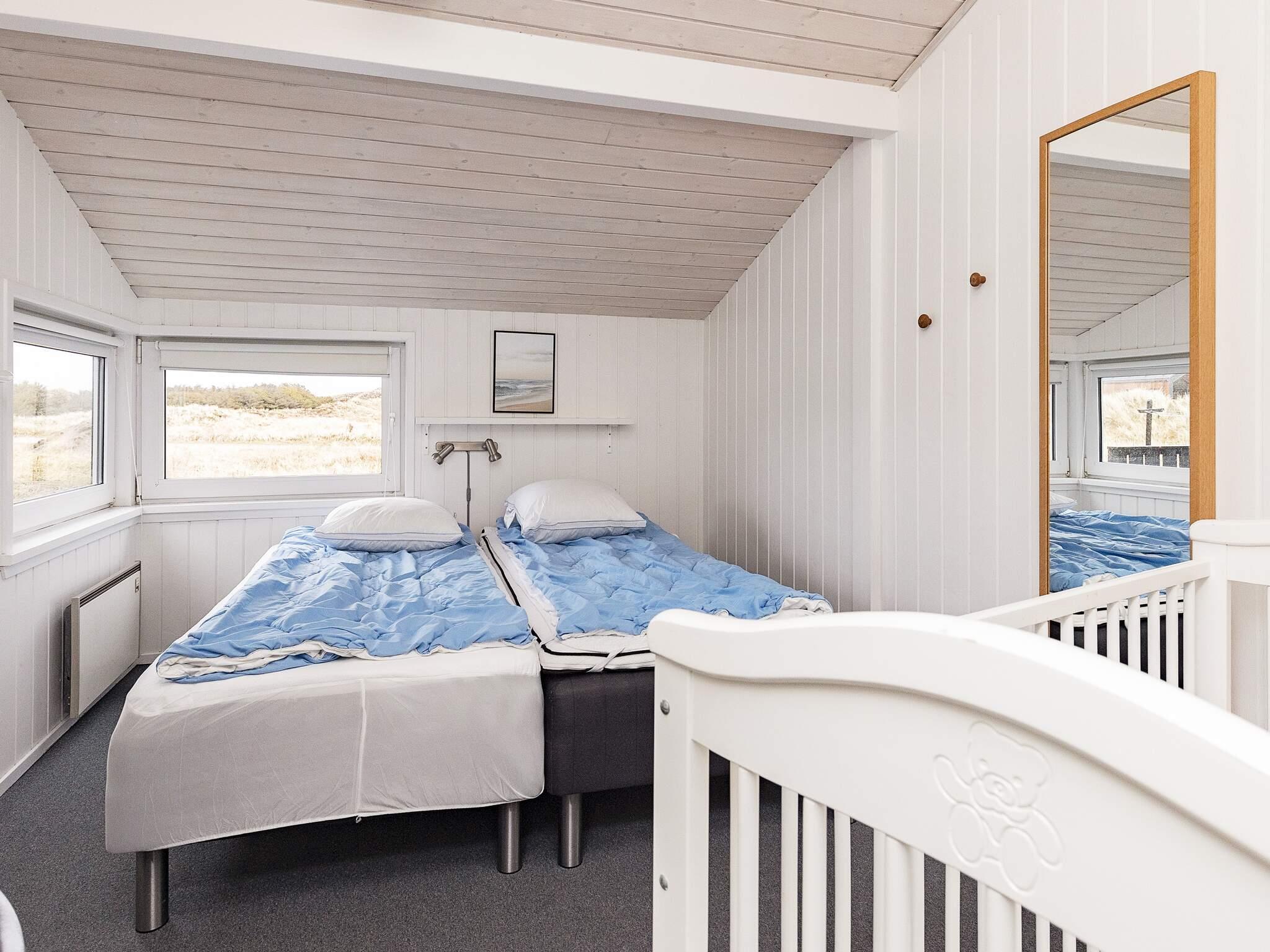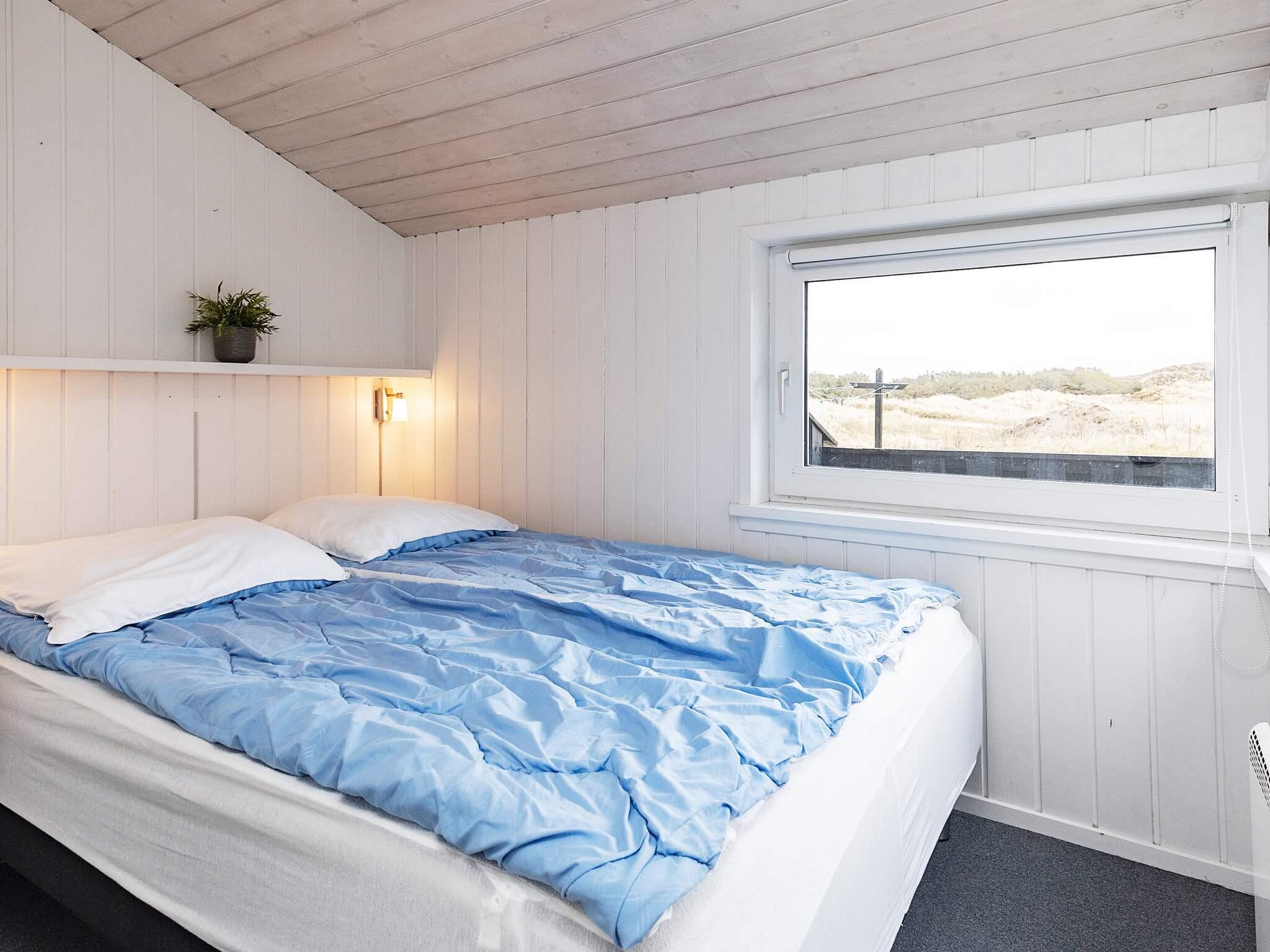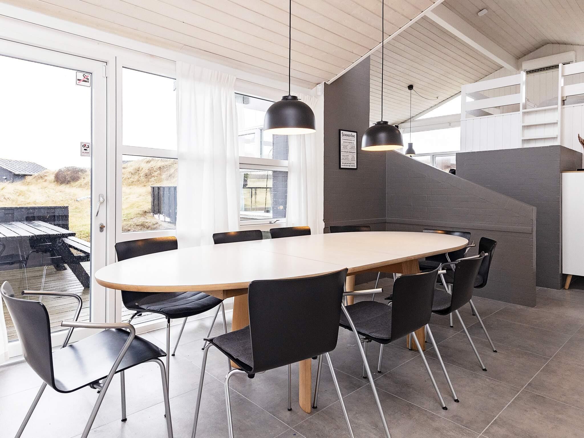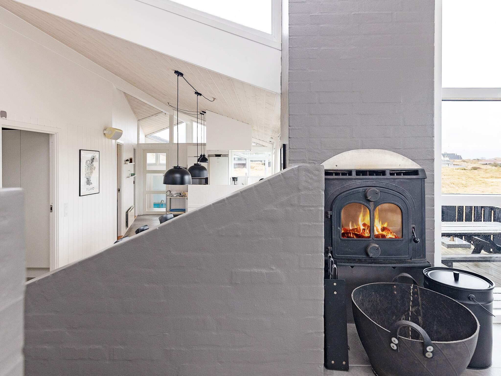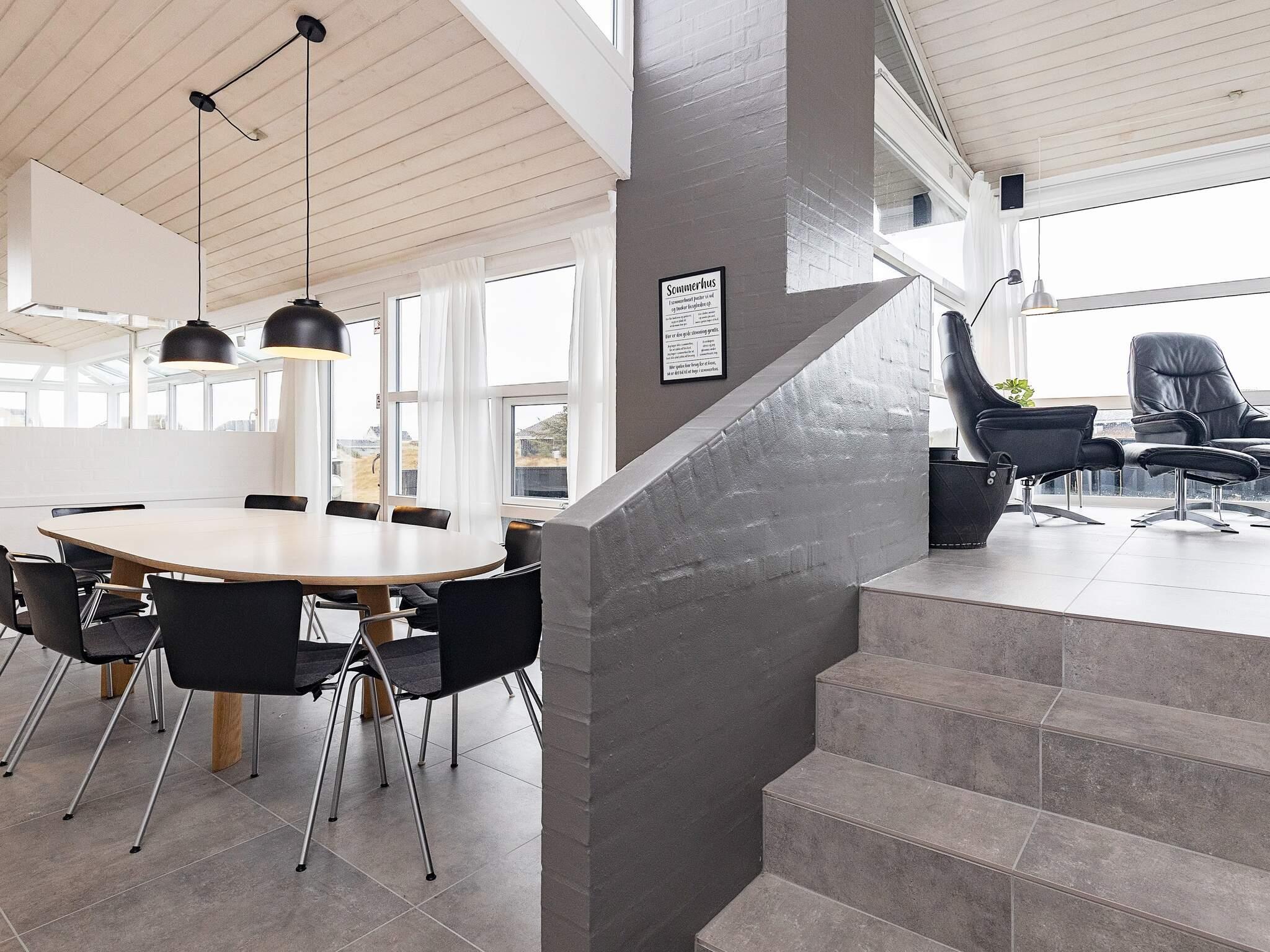 Indretningen er lys og moderne i den kendte sommerhusstil. Der er flere store vinduespartier, hvilket sikrer et flot lysindfald dagen igennem og som sikrer udsigt over klitområdet og et ganske lille havkig.