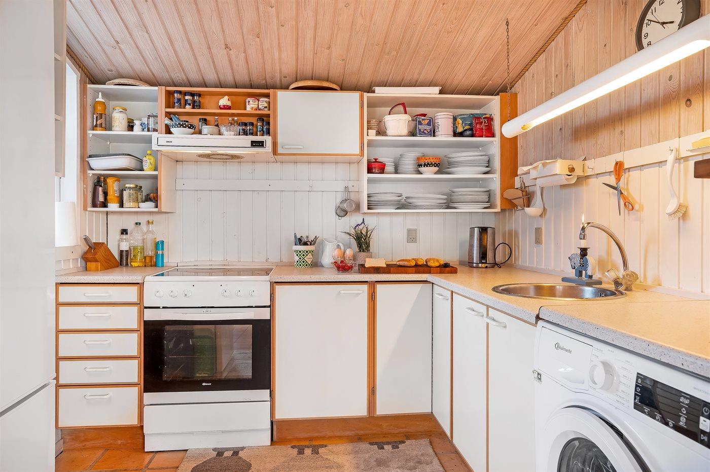 Køkkenet er udstyret med 1 køleskab. Der er 4 keramiske kogeplader, varmluftovn.