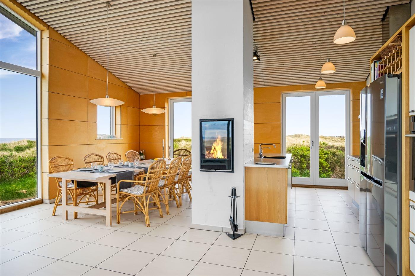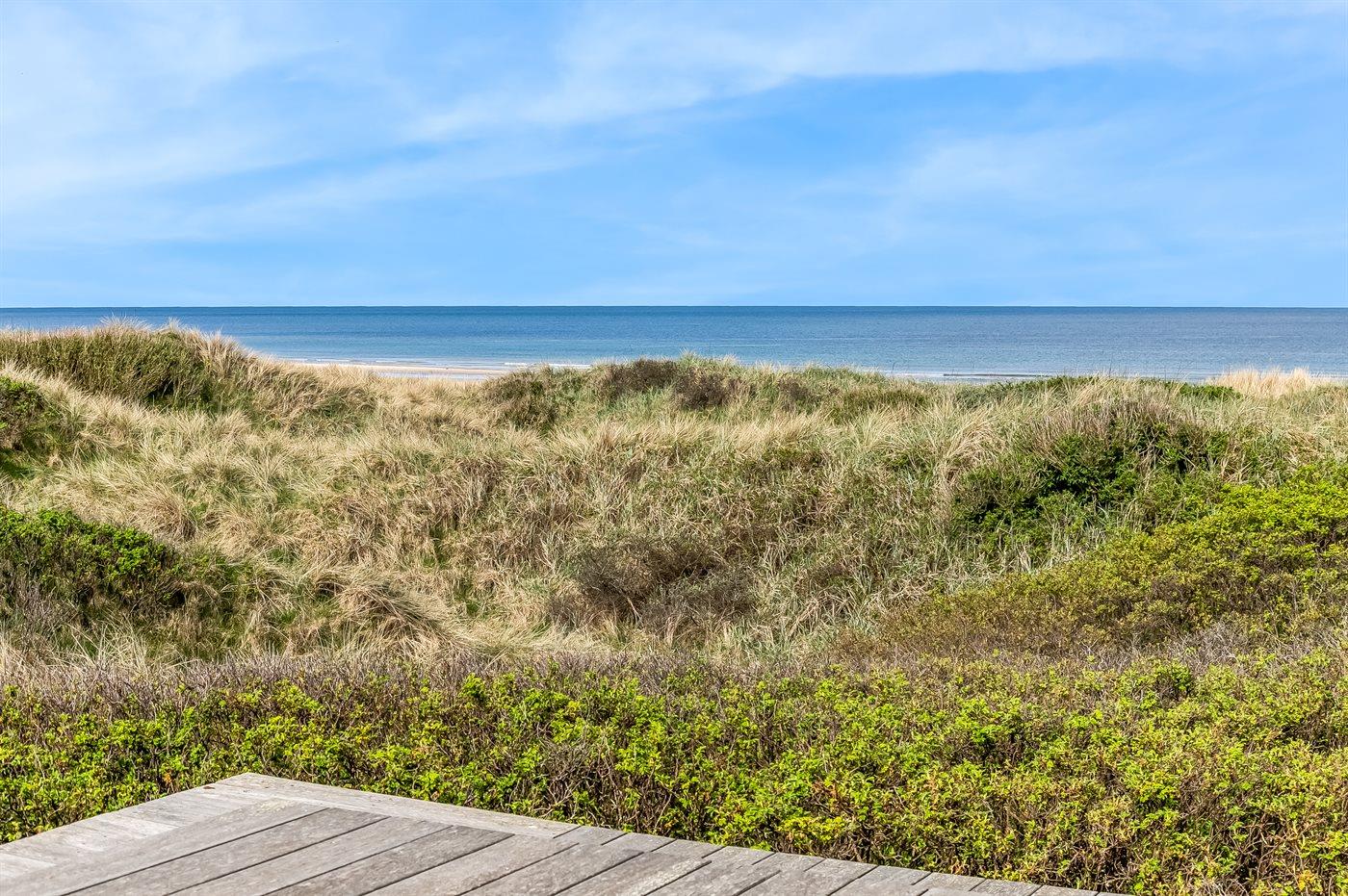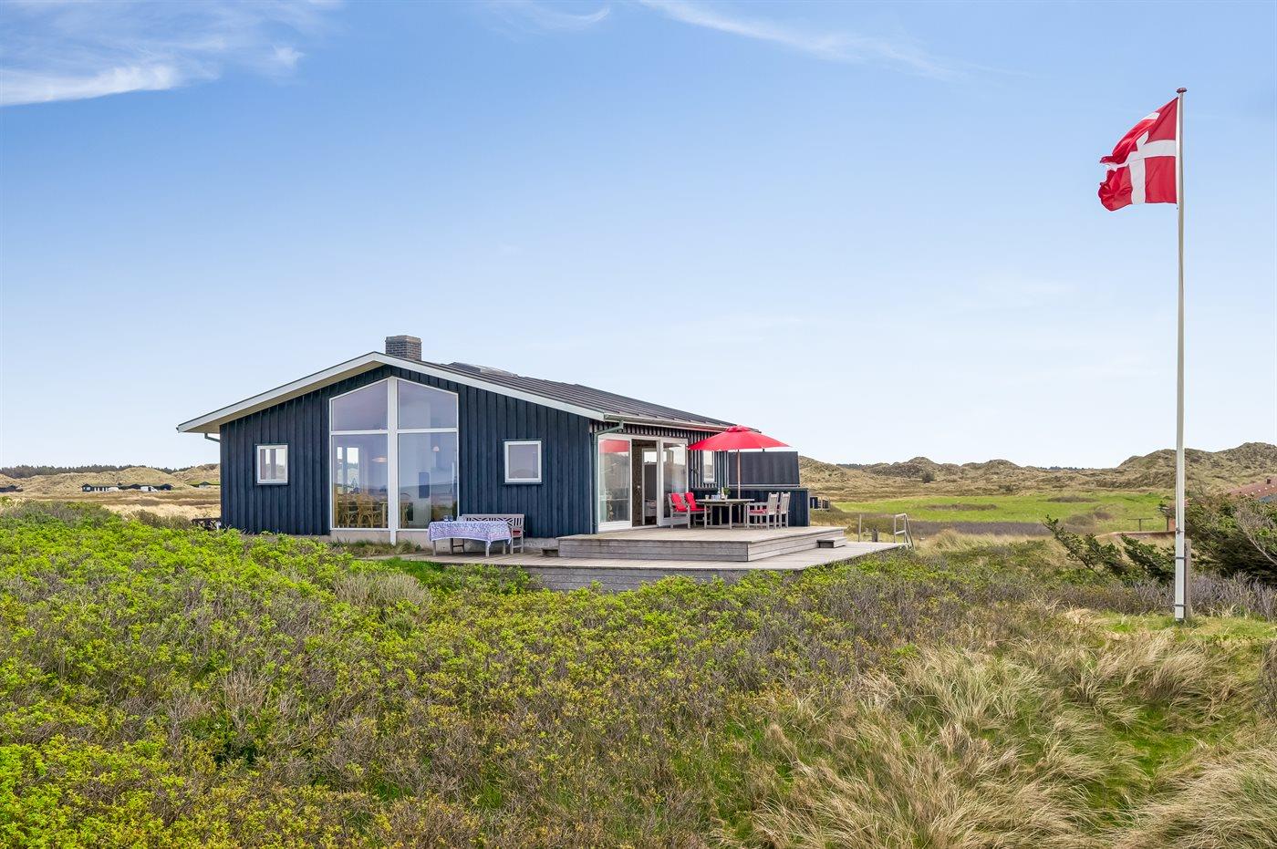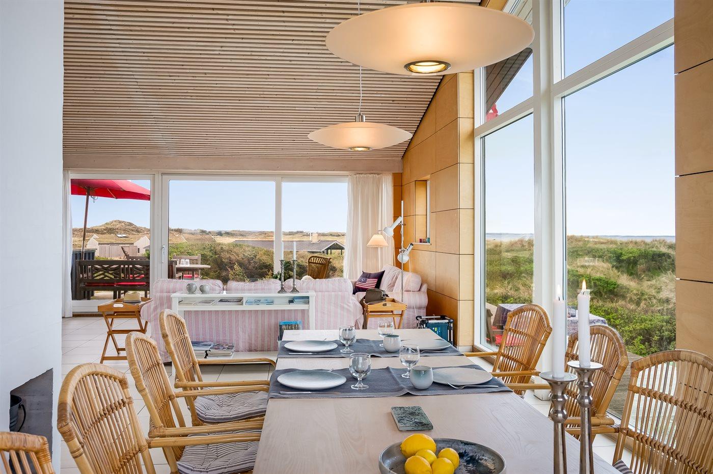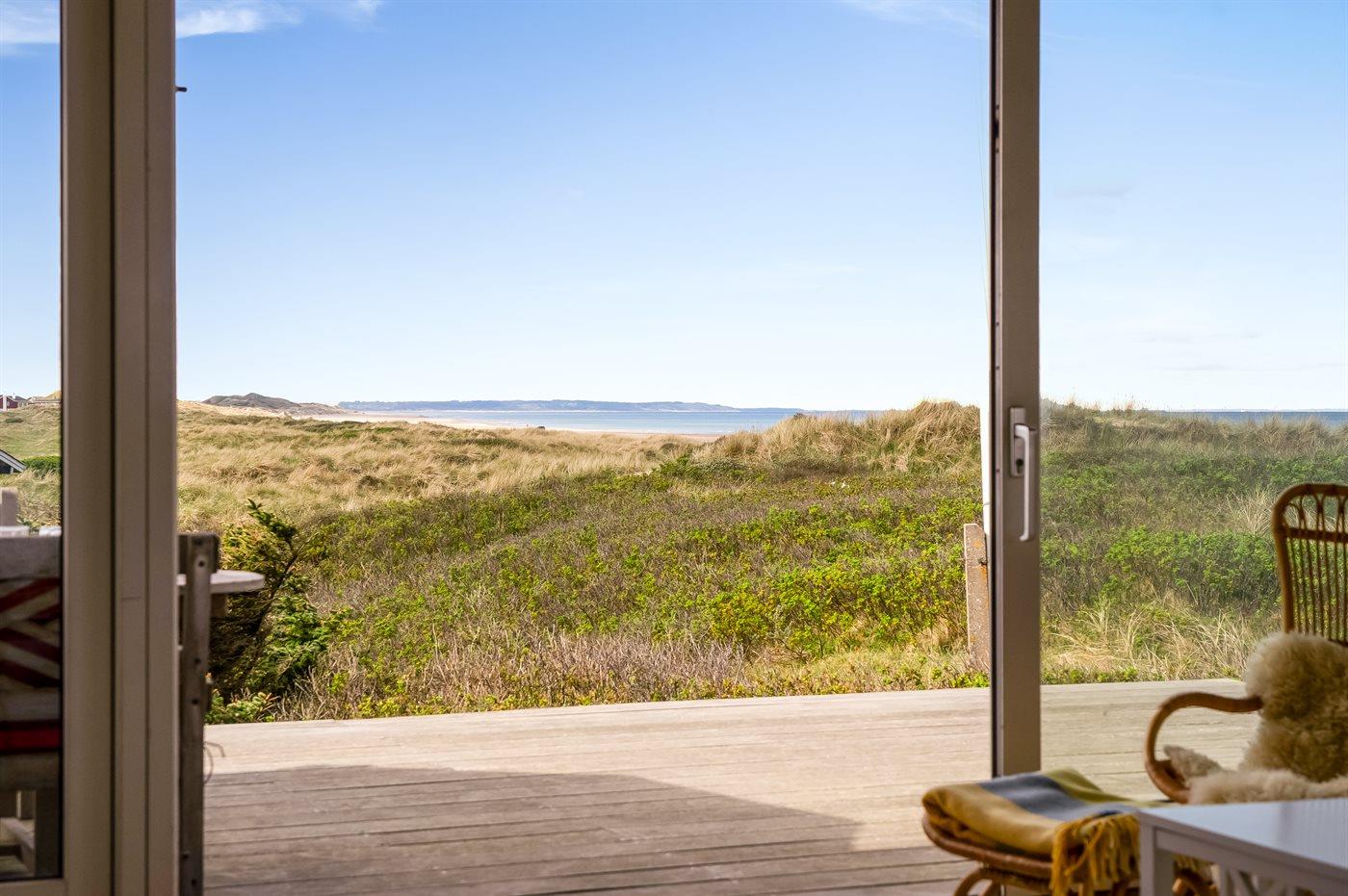 Fantastisk flot sommerhus i 2 etager, renoveret i 2009, beliggende på en stor klitgrund, kun 50 m fra stranden og med en helt enestående panoramaudsigt til Rubjerg Knude i nord og Bulbjerg i syd. Huset er totalrenoveret og fremstår i dag som nyt. Til huset hører et stor terrasseareal med havemøbler - herfra kan I nyde udsigten i fulde drag. Indvendig er der opvarmede klinkegulve. 2 dejlige badeværelser, begge med bruseniche. På husets 1. sal finder I det flotte køkken som bl.a. er udstyret med opvaskemaskine, amerikansk køleskab med isterningmaskine og fryser, varmluftovn samt komfur med keramiske kogeplader. Den smagfuldt indrettede opholdsstue med brændeovn, stereoanlæg med CD-afspiller, DVD-afspiller og TV samt 1 soveværelser med dobbeltseng. I stueetagen findes der stort opholdsstue/aktivitetsrum med brændeovn, bobspil samt flere andre spil. I stueetagen finder I ligeledes 3 soveværelser, alle med dobbeltseng. Af yderligere udstyr kan vaskemaskine, tørretumbler, ekstra køleskab og fryser, barneseng og høj barnestol nævnes. Derudover er der trådløst internet til rådighed. Huset er helårsisoleret og der er installeret et energibesparende varmegenvindingsanlæg. Et fantastisk sommerhus med en hel unik beliggenhed - til en dejlig og afslappende ferie uanset årstiden. Huset ligger ca. 8 km fra 18-hullers golfbane.