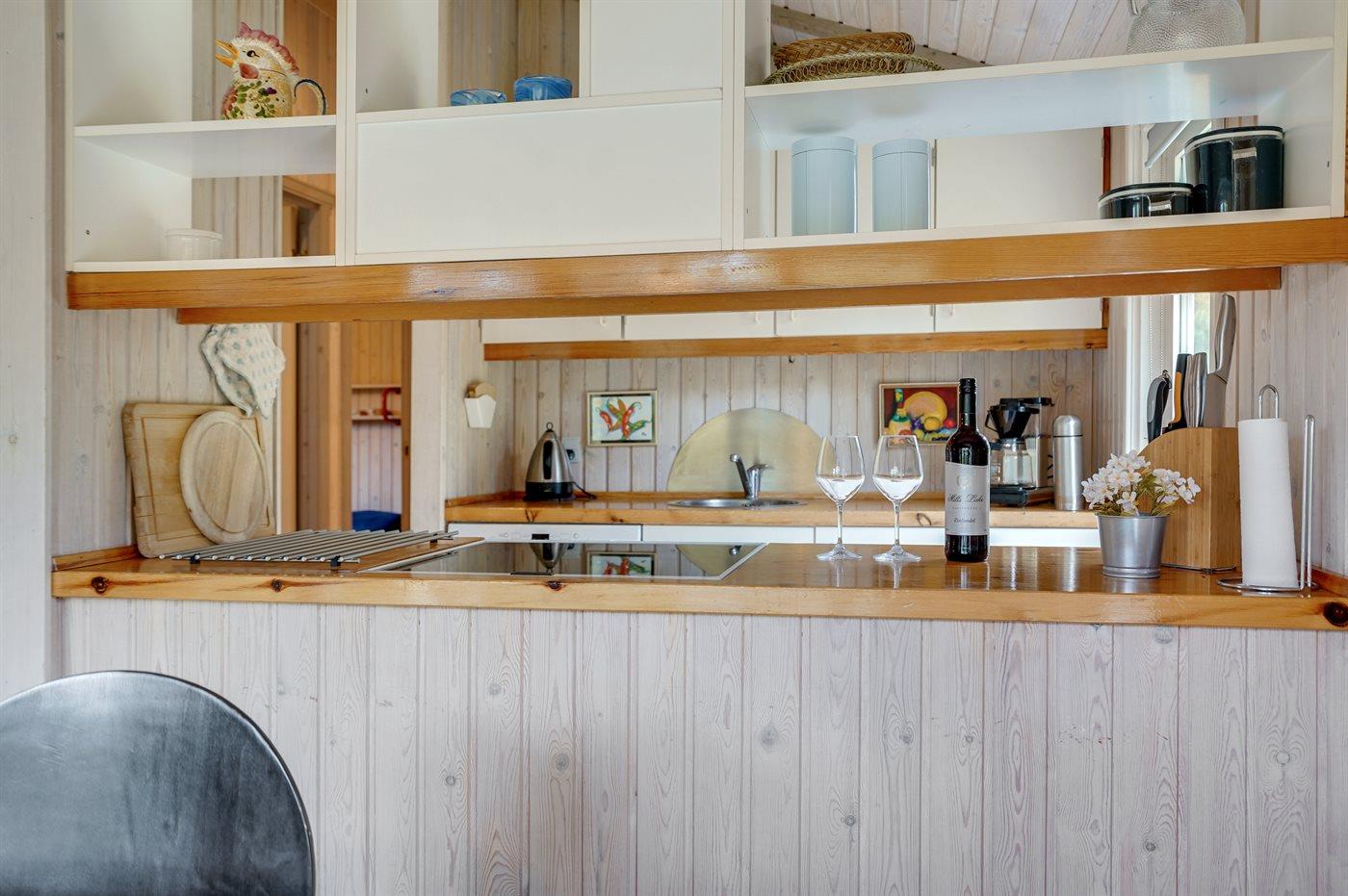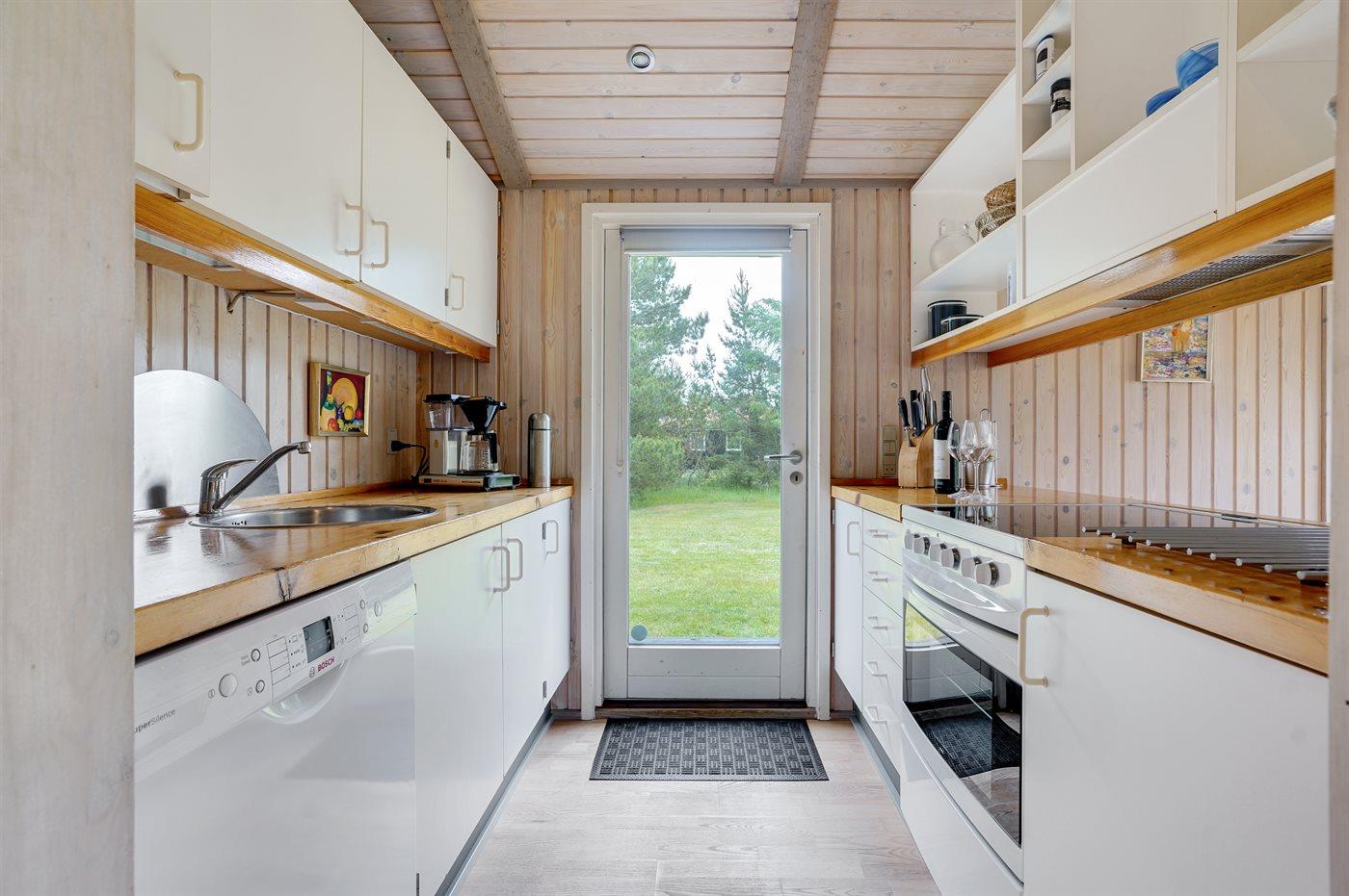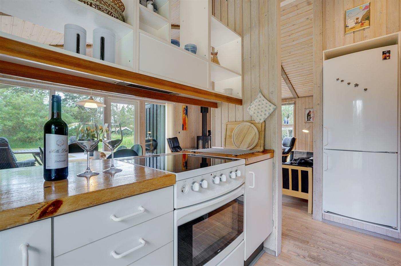 Køkkenet er udstyret med 1 køleskab. Der er 4 keramiske kogeplader, varmluftovn samt opvaskemaskine.