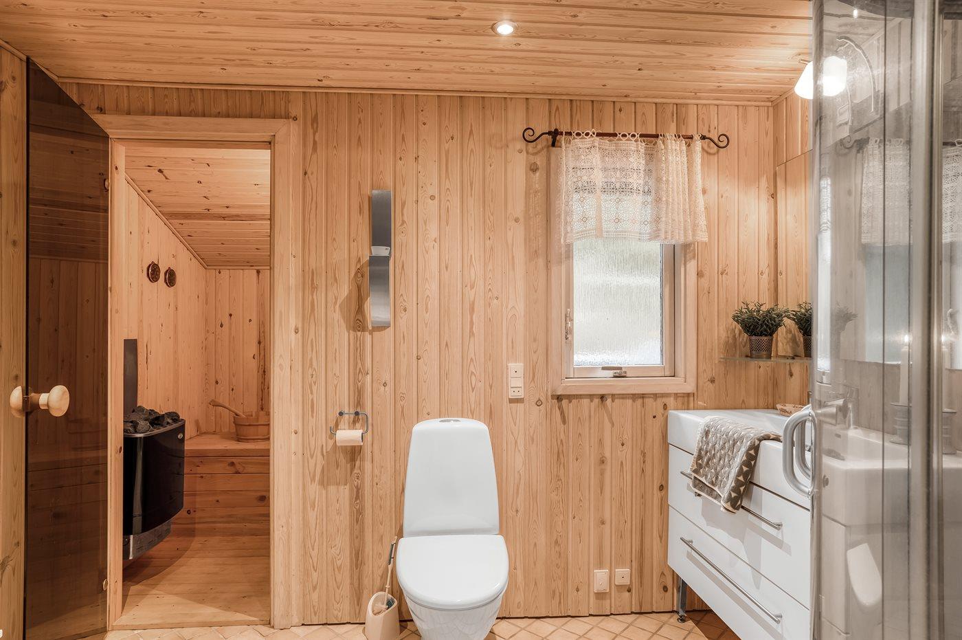 Der er 1 badeværelse med bruser og 1 toilet.. Der er gulvvarme på 1 badeværelse. I saunaen er der mulighed for afslapning.