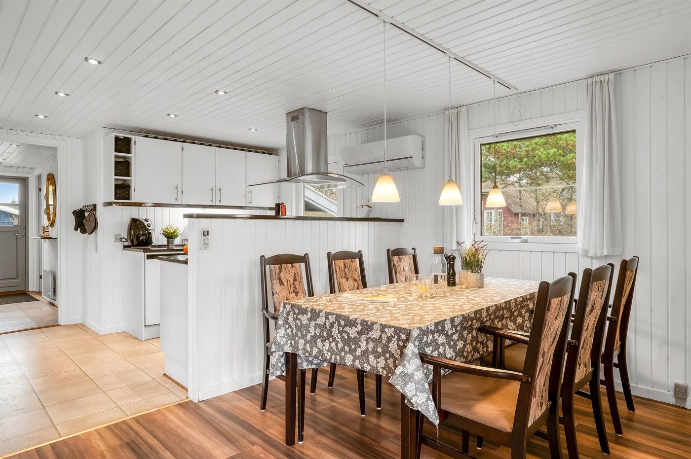 Køkkenet er udstyret med 1 køleskab. Der er 4 keramiske kogeplader, varmluftovn, mikrobølgeovn samt opvaskemaskine.