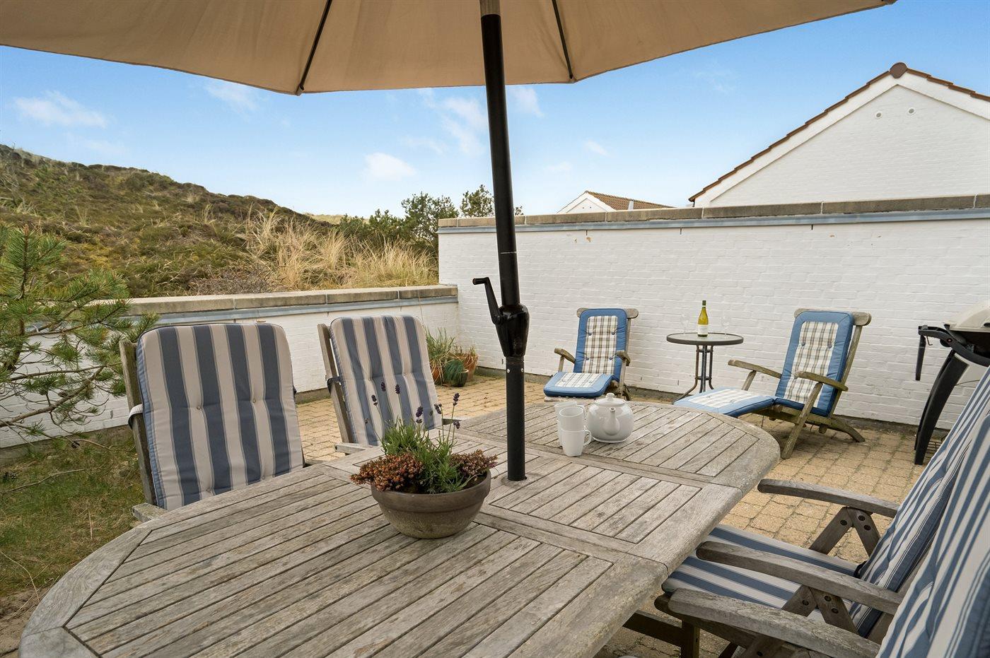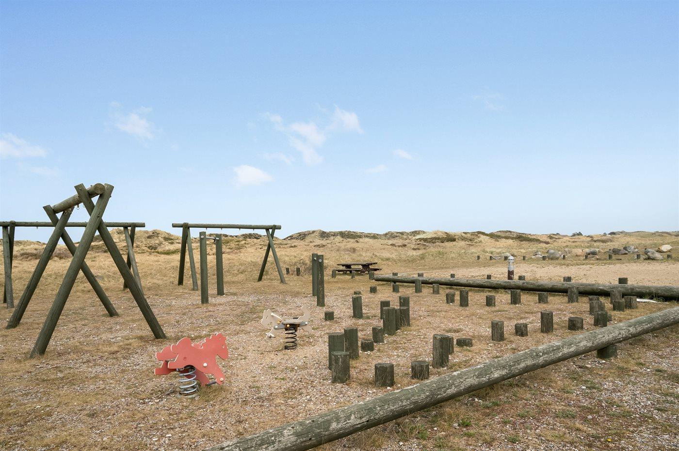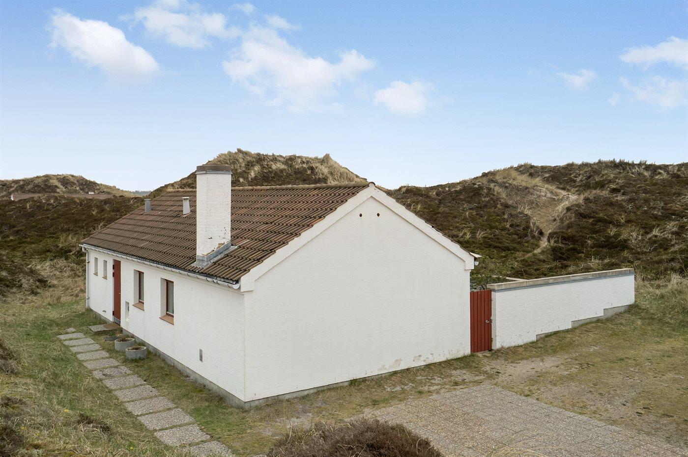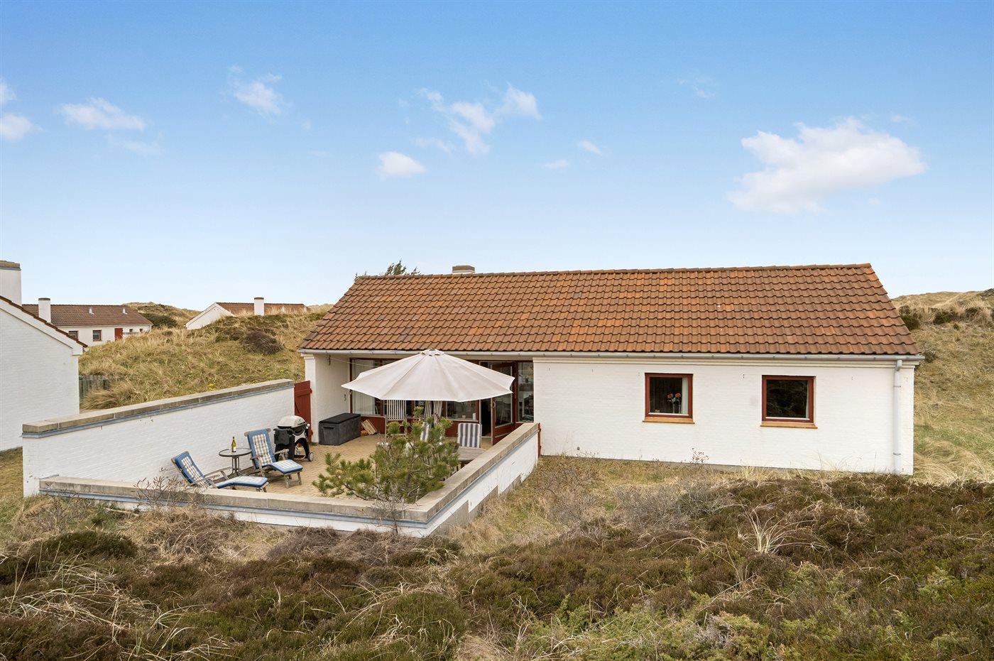 Velindrettet og rummelig feriebolig beliggende i ferieby lige bag klitterne til stranden og Vesterhavet i et naturskønt og kuperet område. Boligen ligger i udkanten af feriebyen, hvilket giver en flot udsigt til de høje omkringliggende klitter fra såvel bolig som terrasse. Fra toppen af klitten nær boligen er der udsigt til vandet. Fælles legeplads i området.