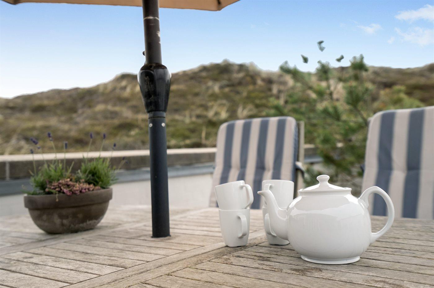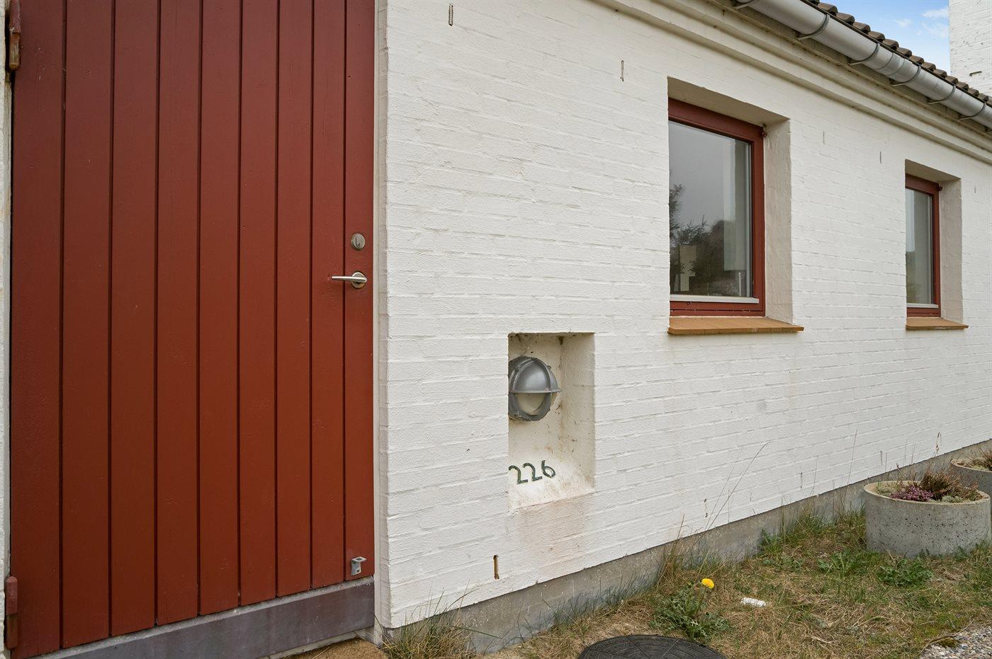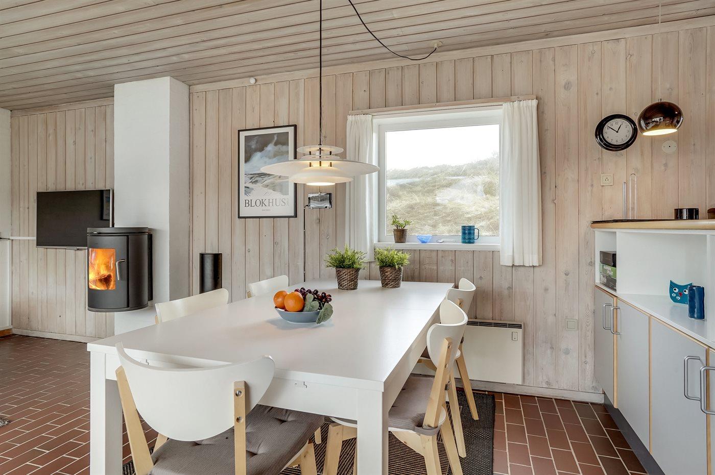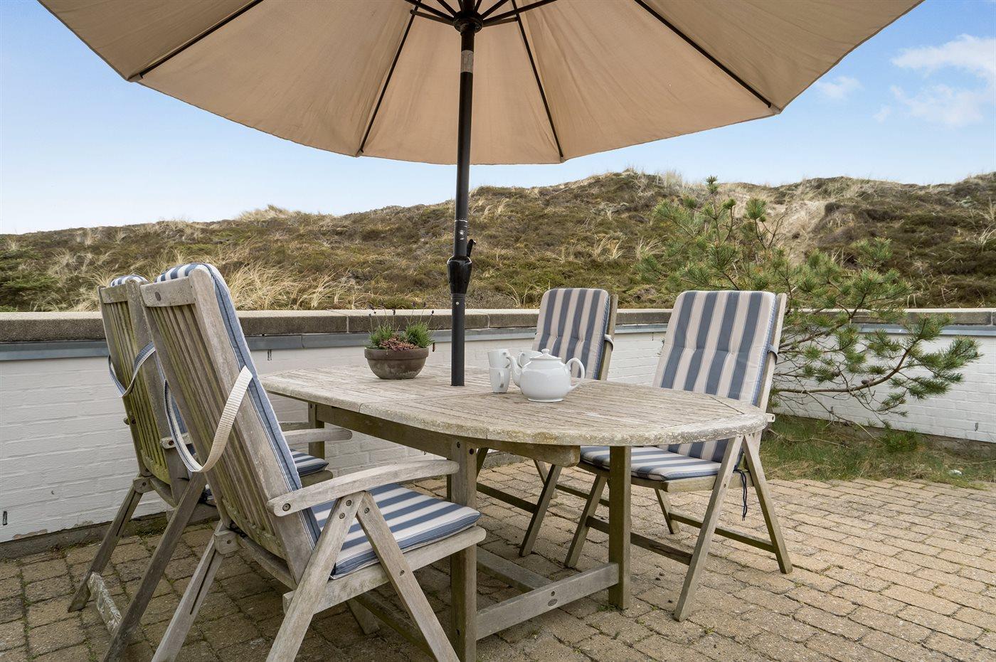 Velindrettet og rummelig feriebolig beliggende i ferieby lige bag klitterne til stranden og Vesterhavet i et naturskønt og kuperet område. Boligen ligger i udkanten af feriebyen, hvilket giver en flot udsigt til de høje omkringliggende klitter fra såvel bolig som terrasse. Fra toppen af klitten nær boligen er der udsigt til vandet. Fælles legeplads i området.