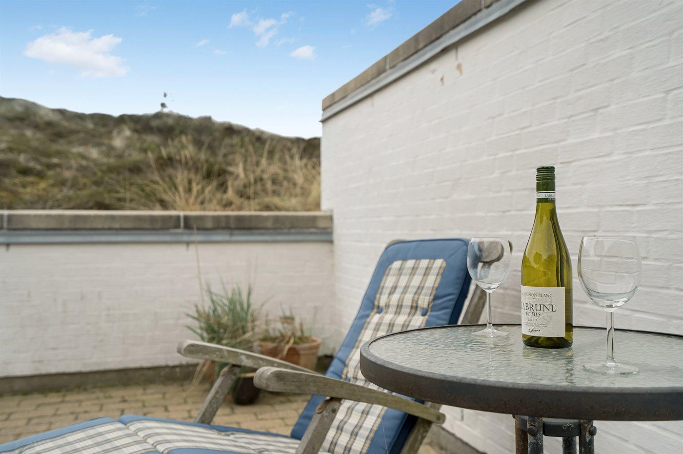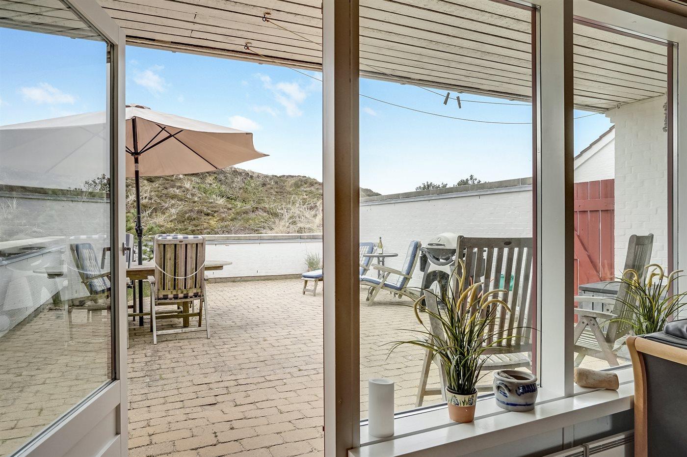Rummeligt feriehus med havudsigt og lukket terrasse tæt på Vesterhavet i naturskønne klitområder.