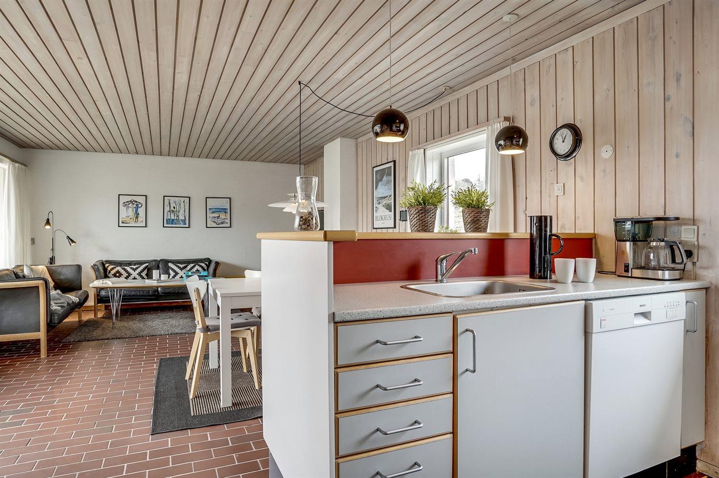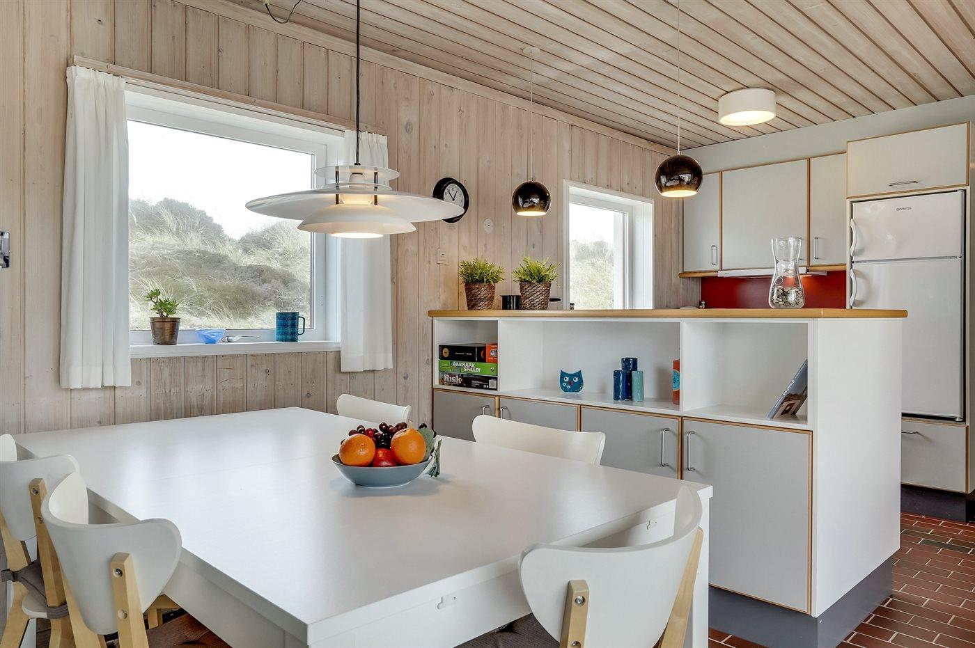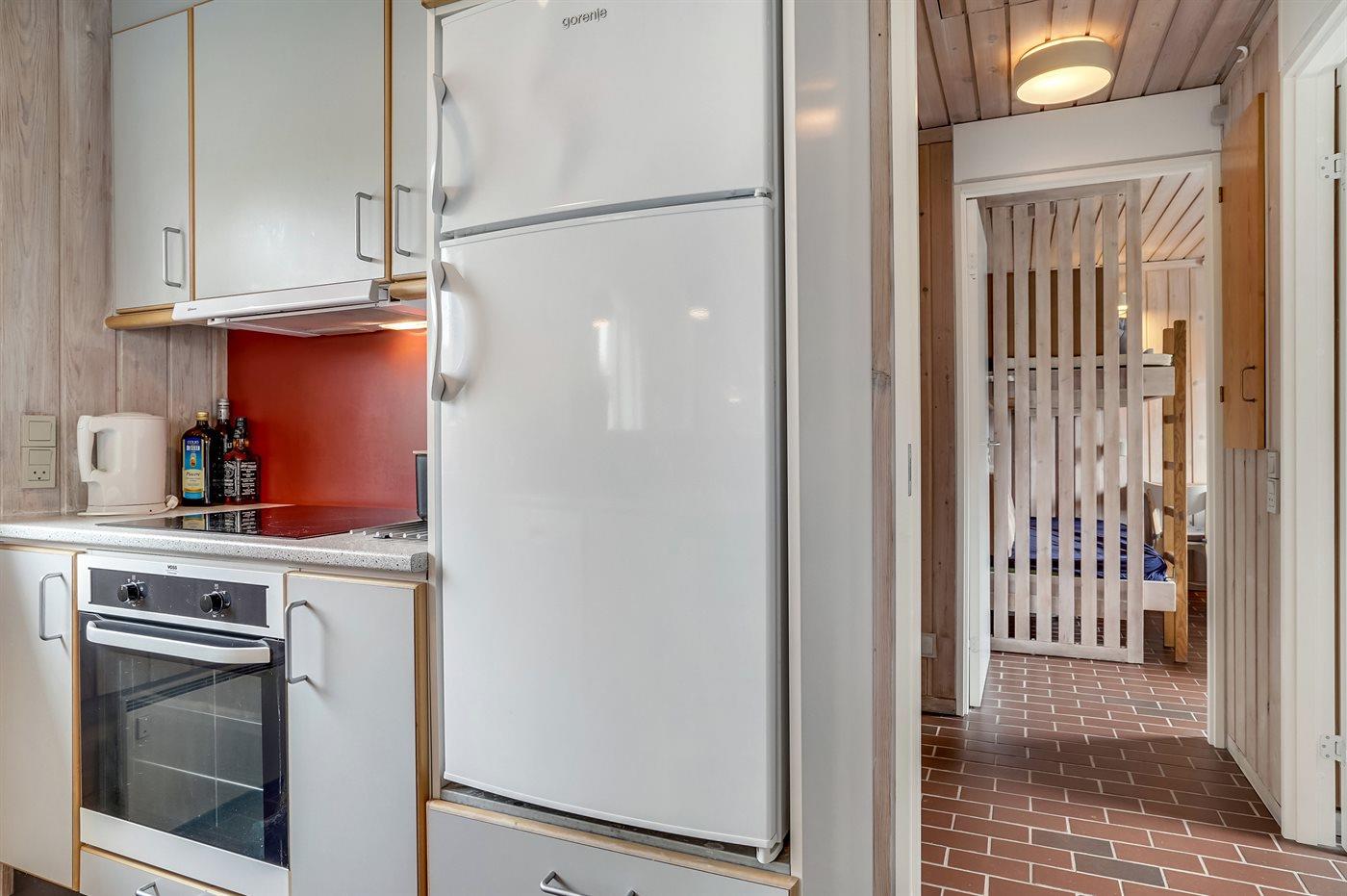 Køkkenet er udstyret med 1 køleskab. Der er 4 keramiske kogeplader, varmluftovn samt opvaskemaskine.