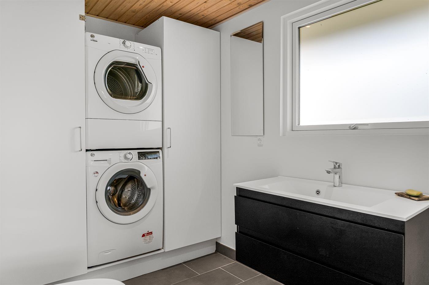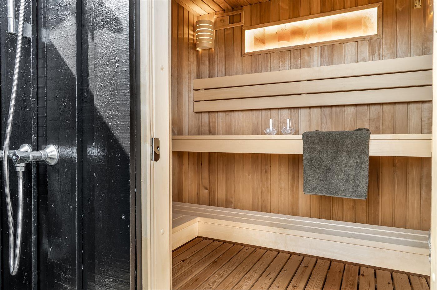 Der er 2 badeværelser med bruseniche og 2 toiletter. Der er gulvvarme på 1 badeværelse. I saunaen er der mulighed for afslapning.