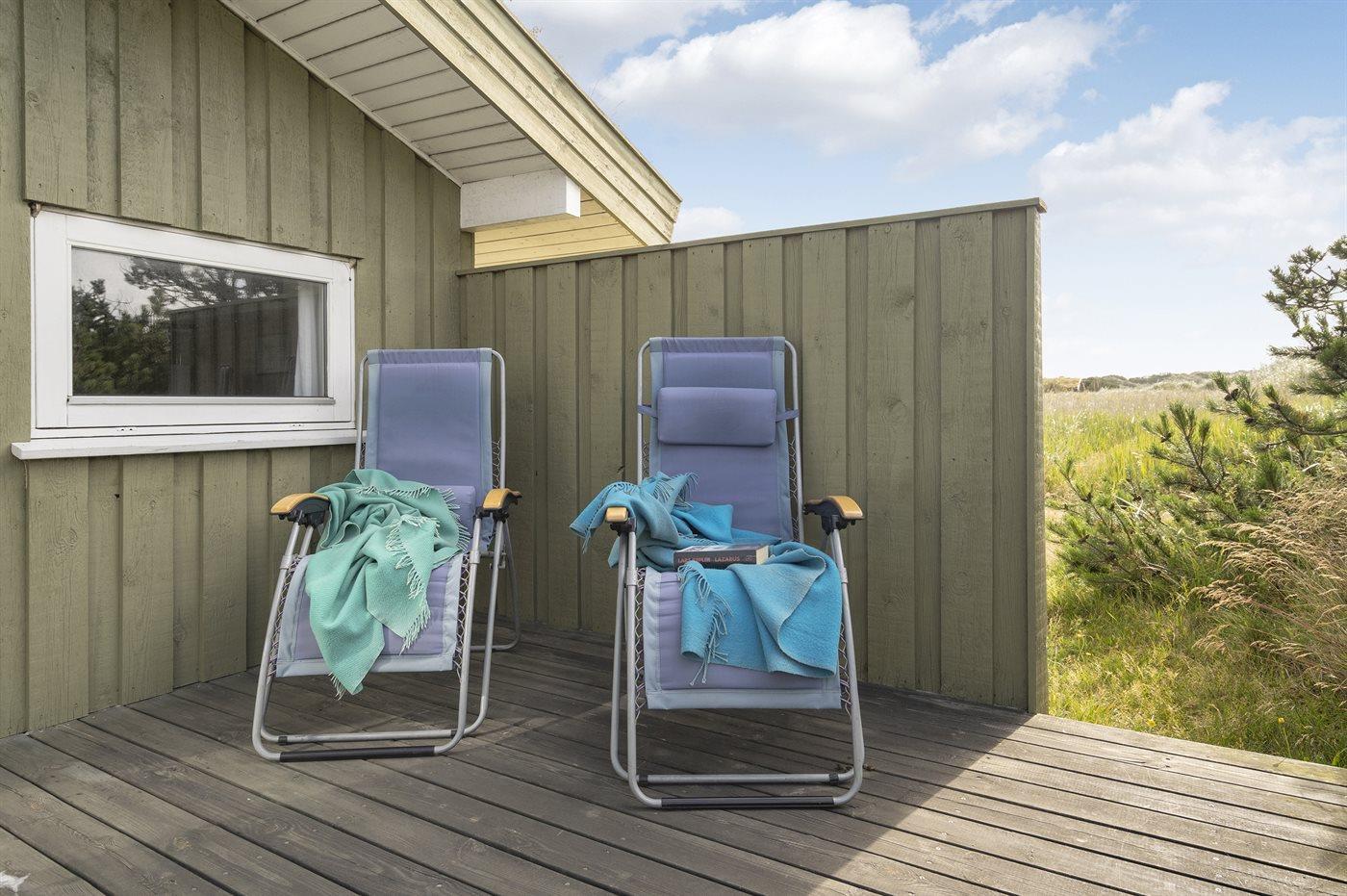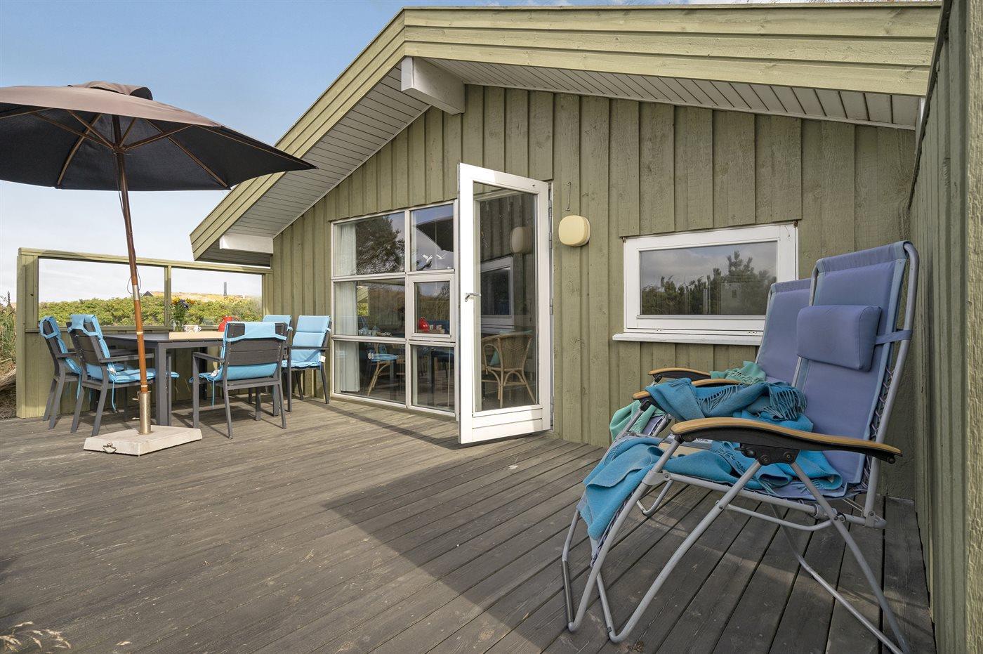 Hyggeligt, lille sommerhus beliggende tilbagetrukket på en kuperet grund i et naturskønt område bag klitterne til stranden og Vesterhavet.
