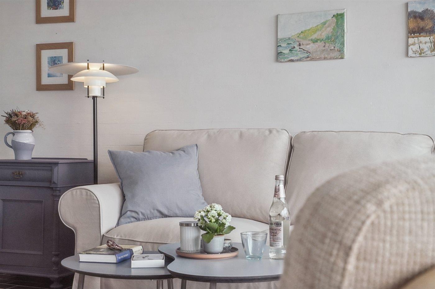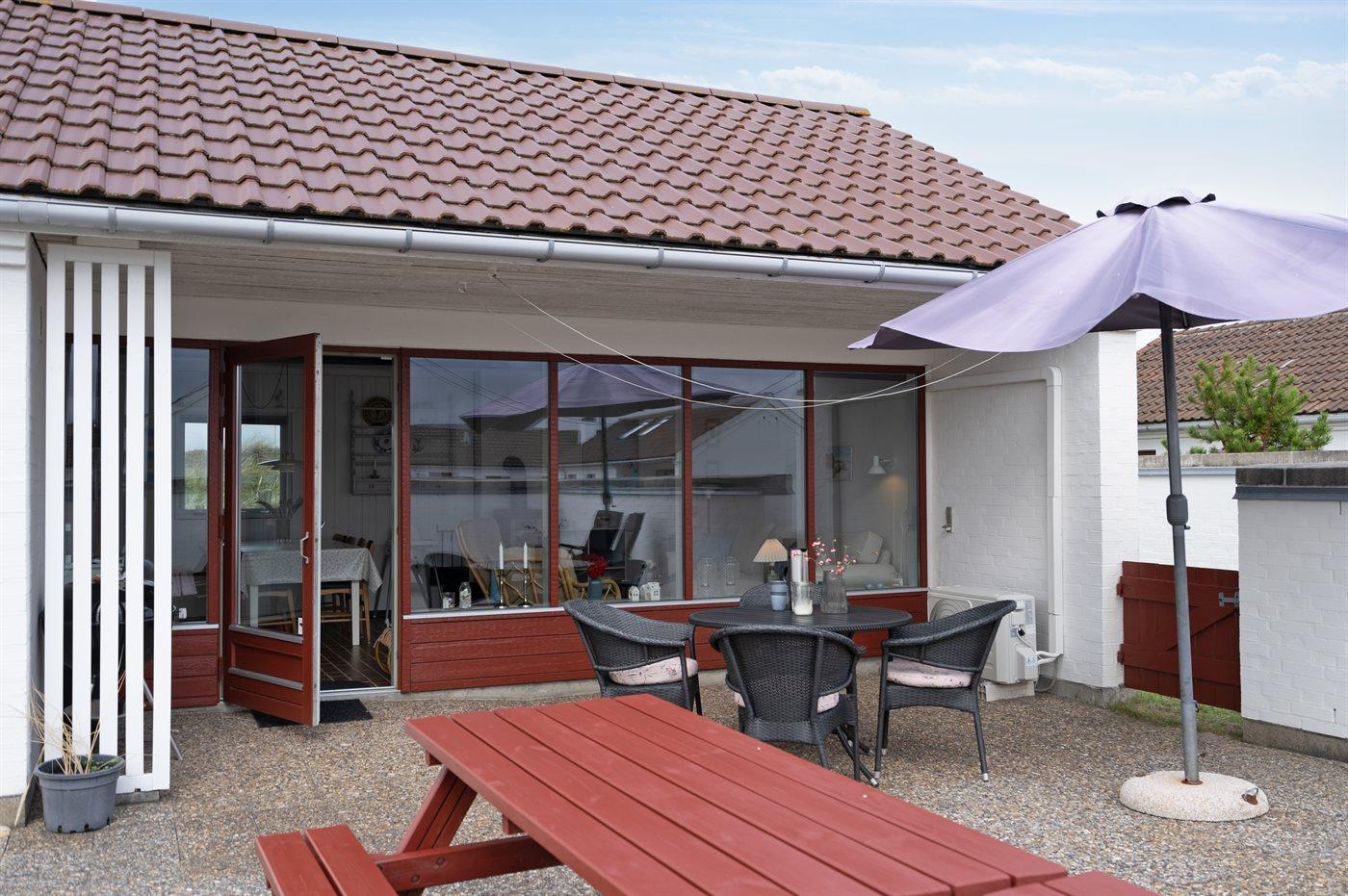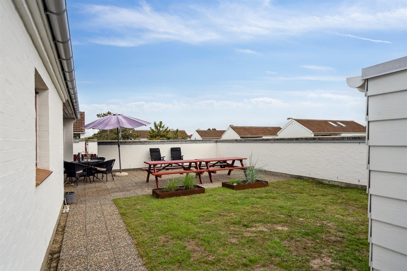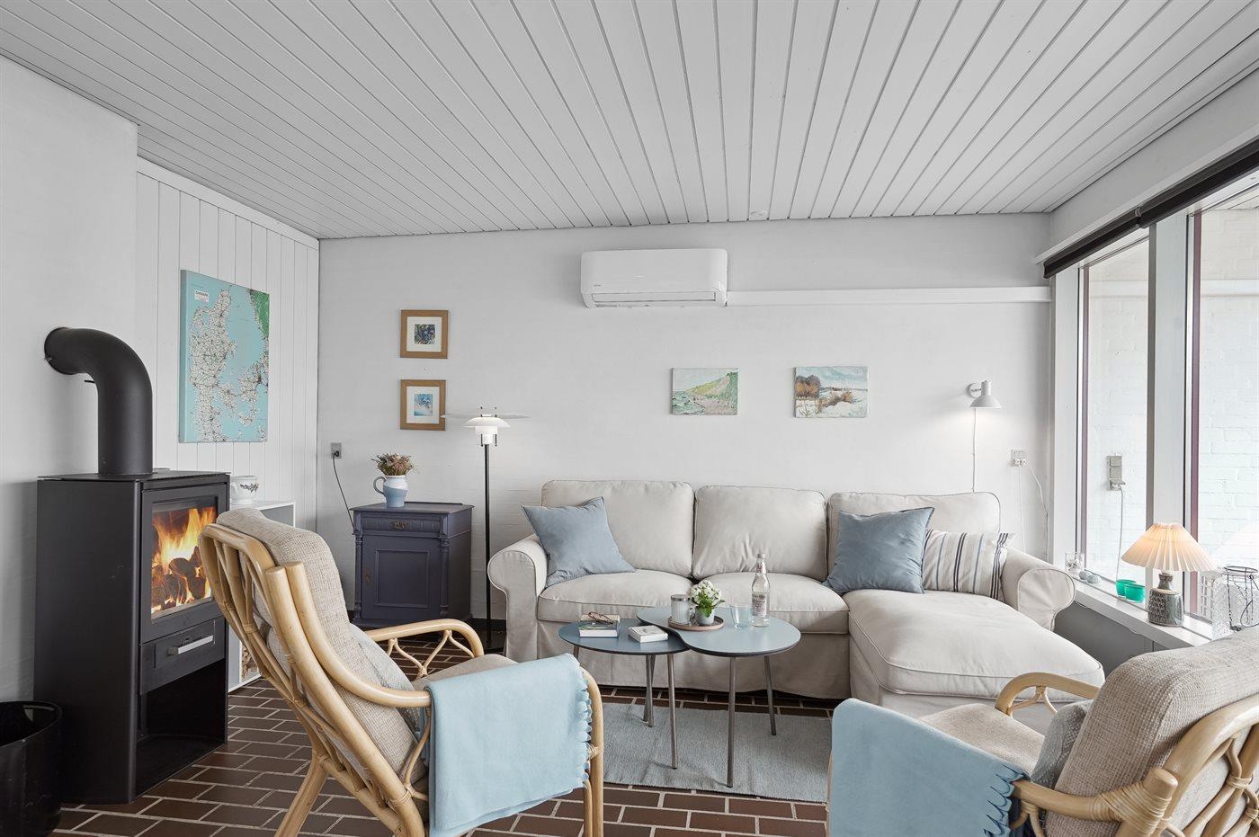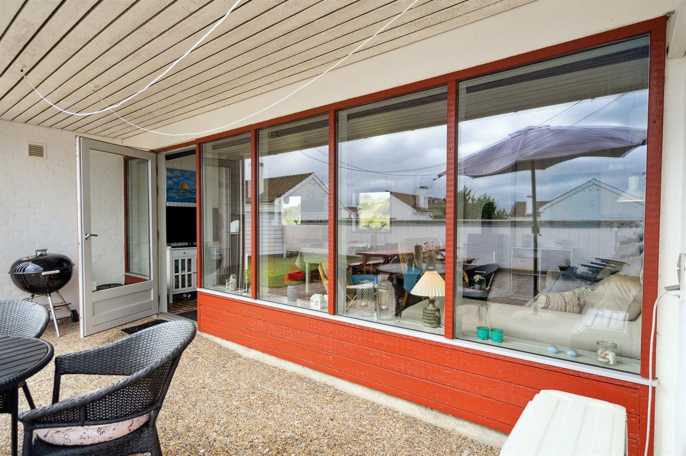 En hyggelig og lyst indrettet feriebolig beliggende i en ferieby lige bag klitterne til stranden og Vesterhavet - i et naturskønt og kuperet område.