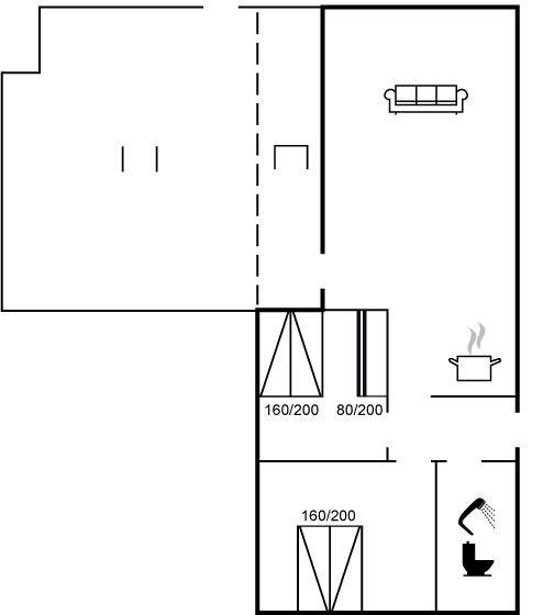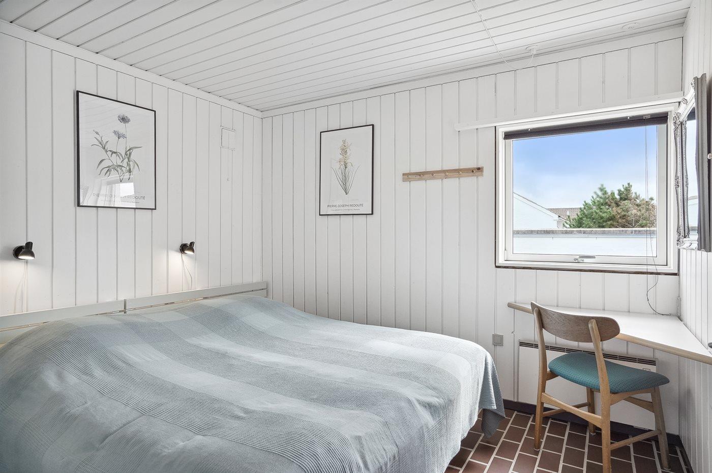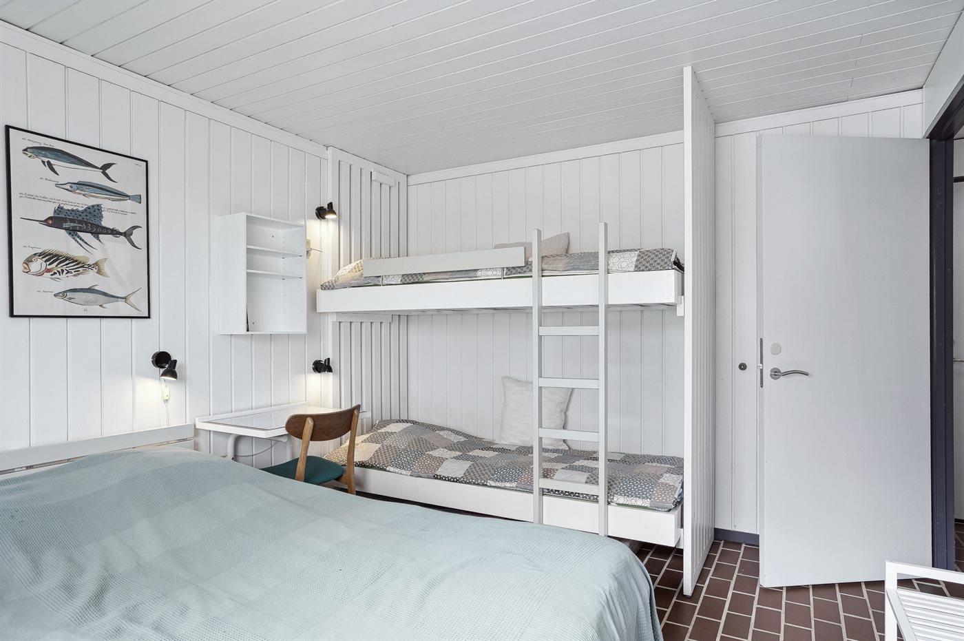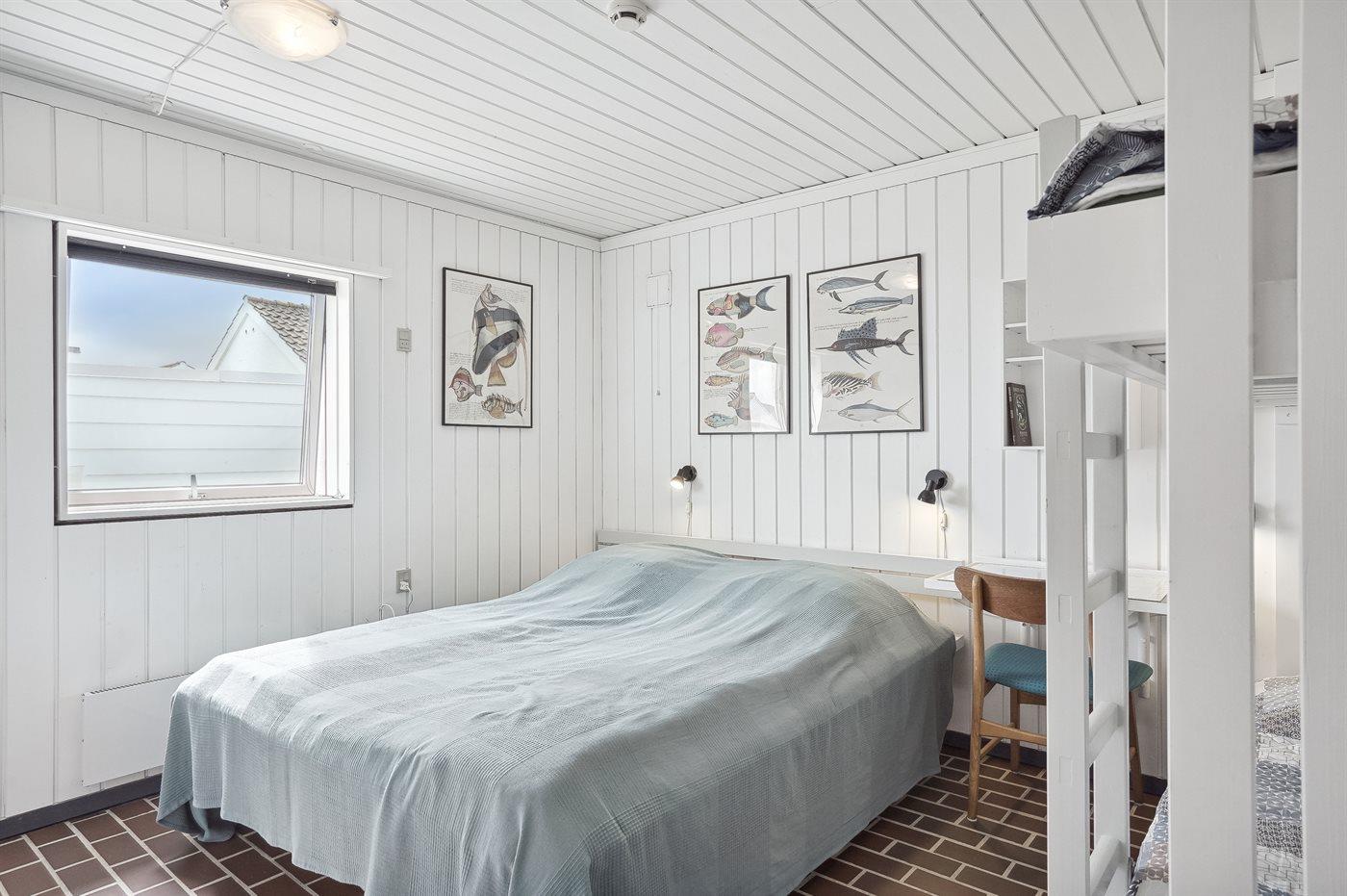 Der er i alt 2 soveværelser. Sovepladserne fordeler sig på: 4 sovepladser i dobbeltsenge. 2 sovepladser i køjeseng. 2 sovepladser på madrasser. 2 af disse sovepladser befinder sig på husets hems. Derudover er der 1 stk. barneseng.