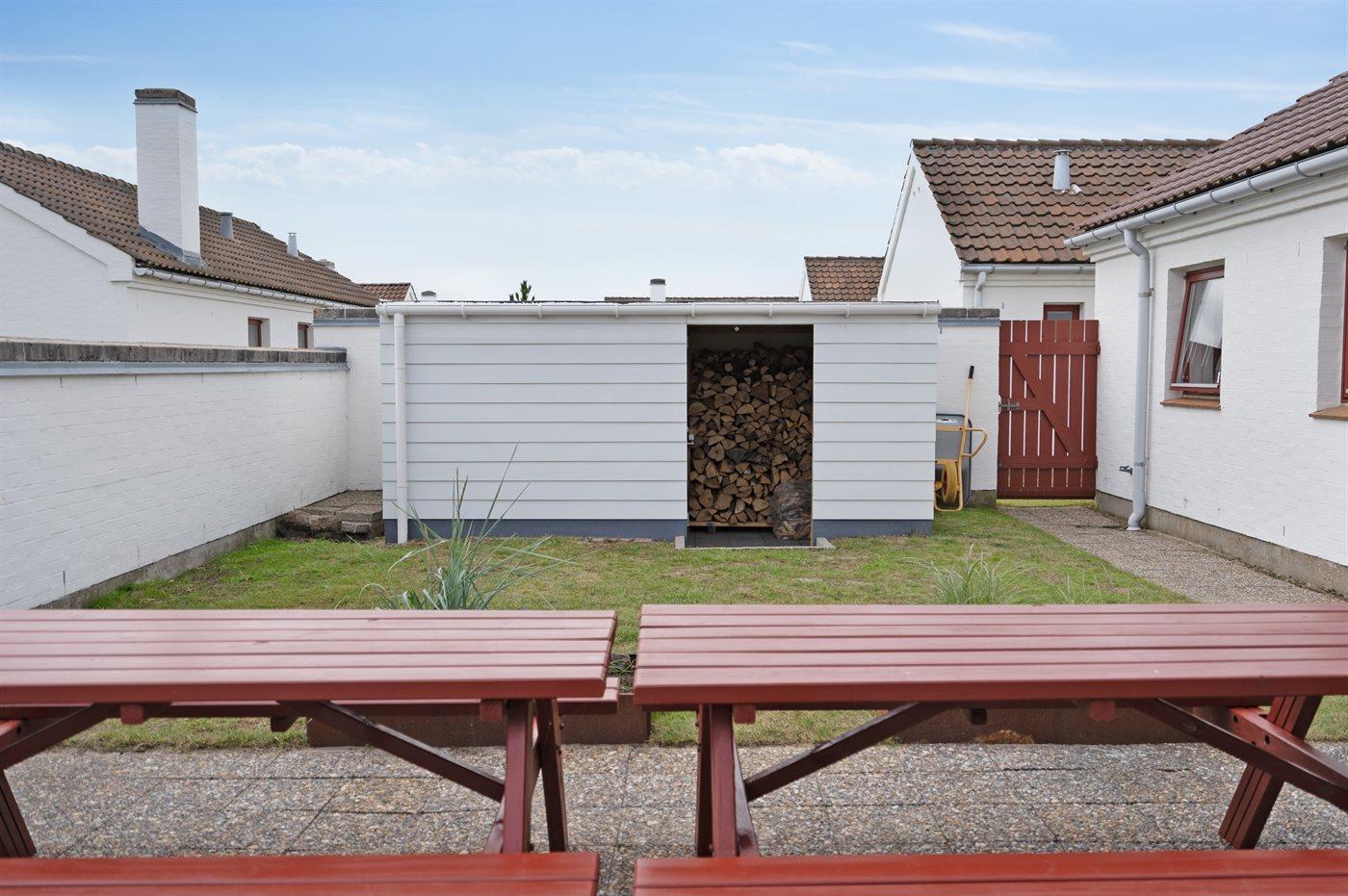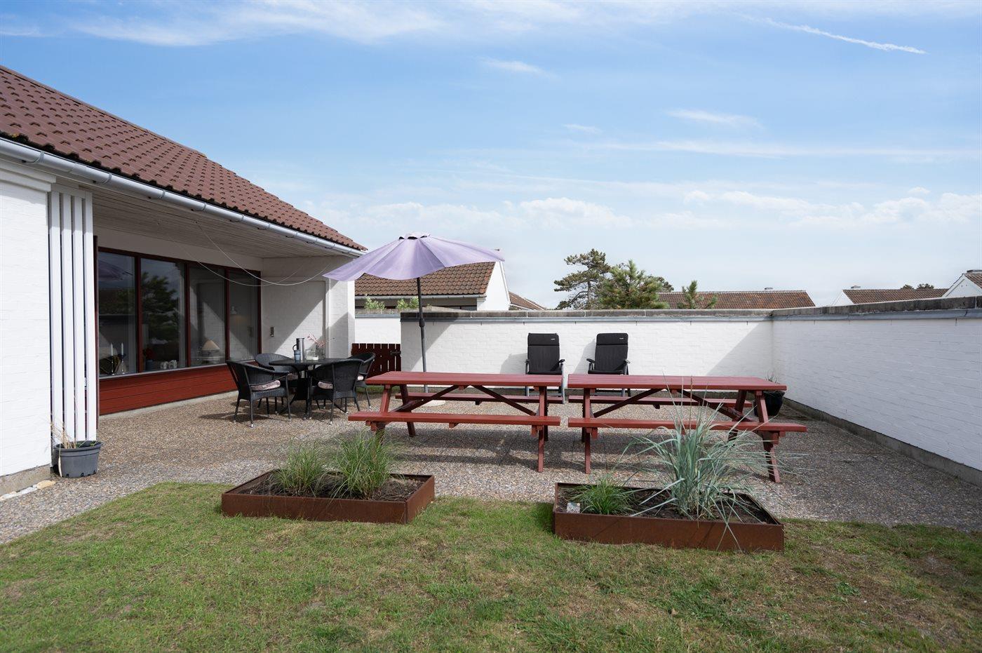 Ferieboligen er beliggende på en 130 m² stor havegrund. Grunden er indhegnet. Der er 900 m til havet. Nærmeste forretning er beliggende i en afstand af 7000 m. Til ferieboligen hører 25 m² terrasseareal. Til ferieboligen hører lukket terrasse og til dels overdækket terrasse. Der ligger en legeplads i en afstand af 10 m. Grill til rådighed. Parkering ved ferieboligen.