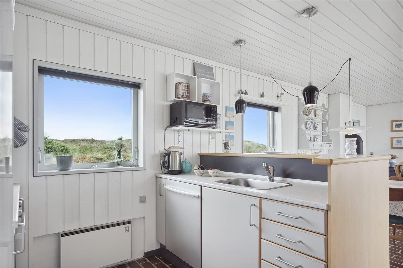 Køkkenet er udstyret med 1 køleskab. Der er 4 keramiske kogeplader, varmluftovn, mikrobølgeovn samt opvaskemaskine.