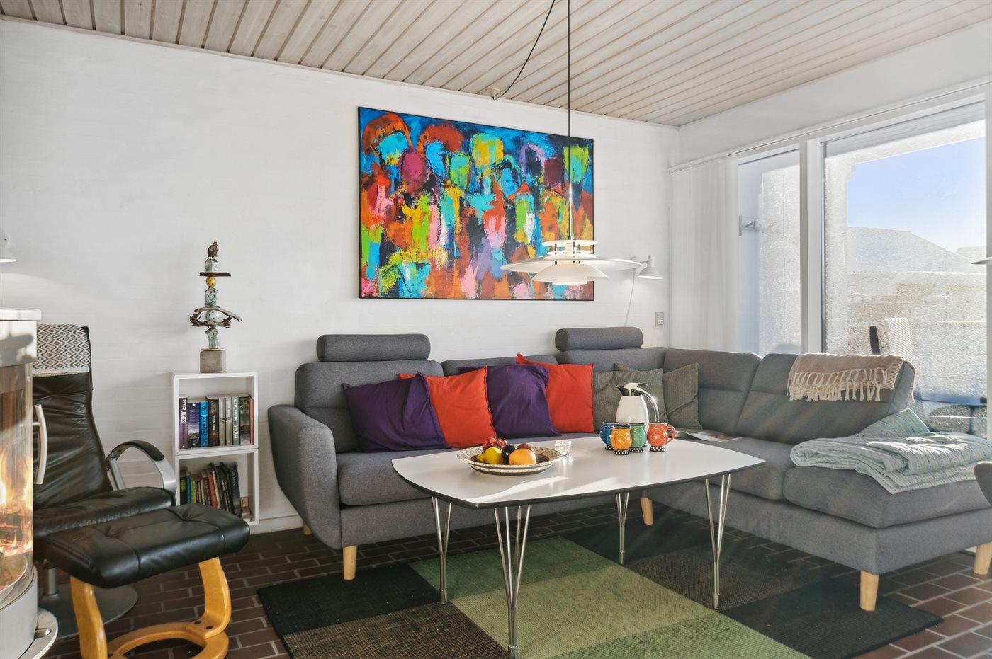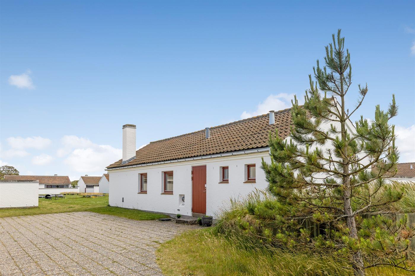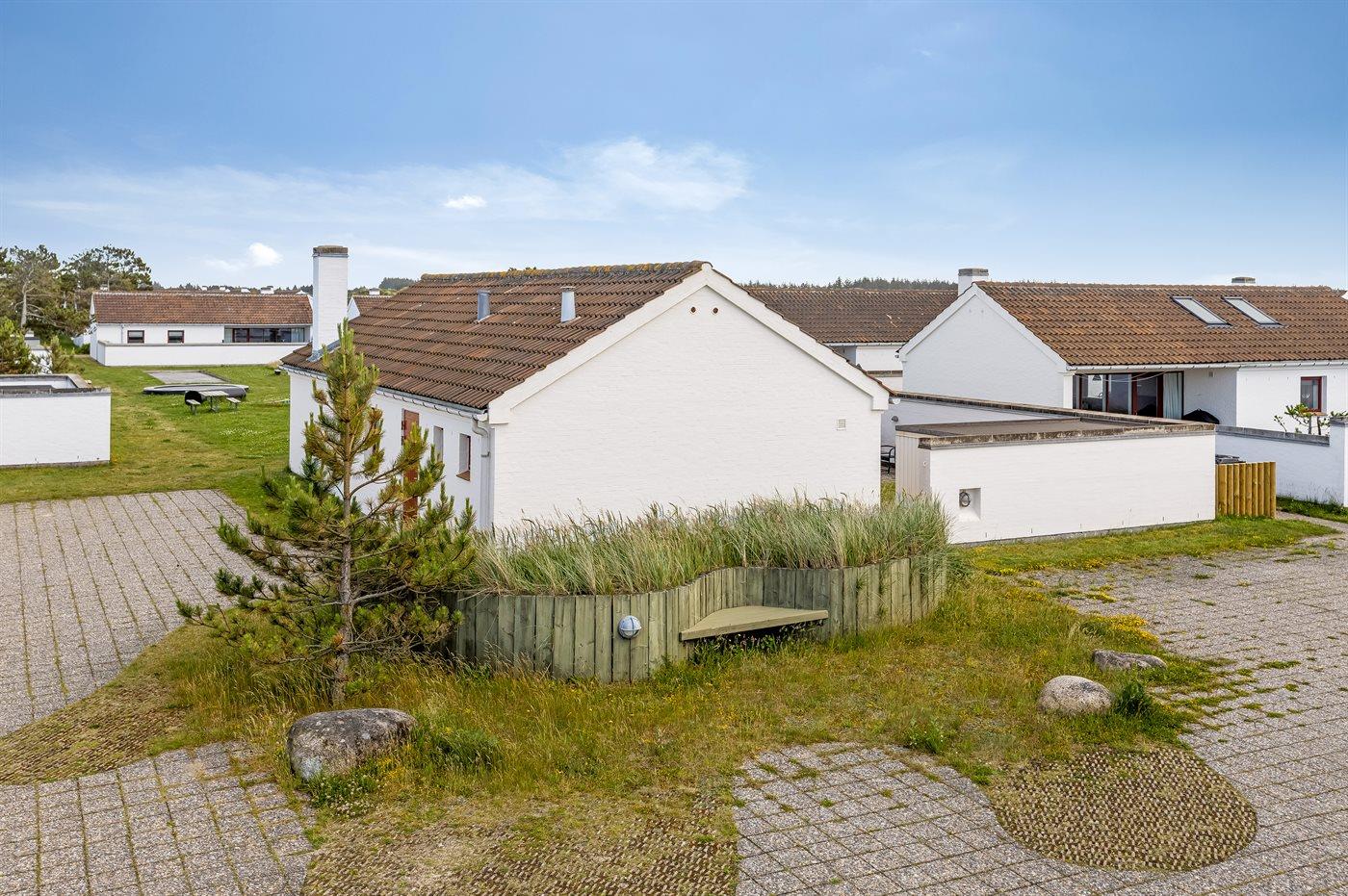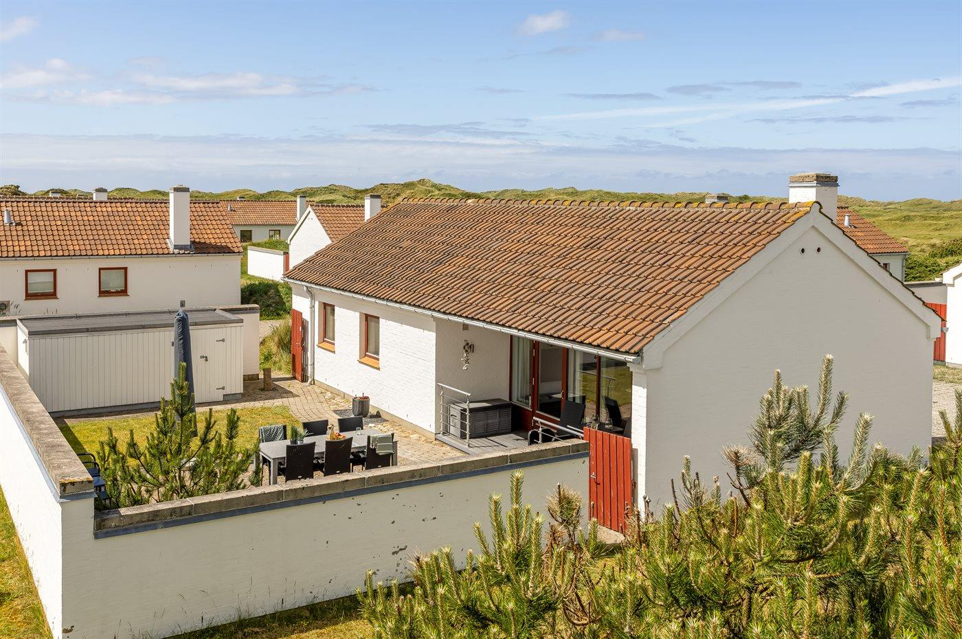 Hyggelig og lyst indrettet feriebolig beliggende i feriebyen lige bag klitterne til stranden og Vesterhavet i et naturskønt og kuperet område.