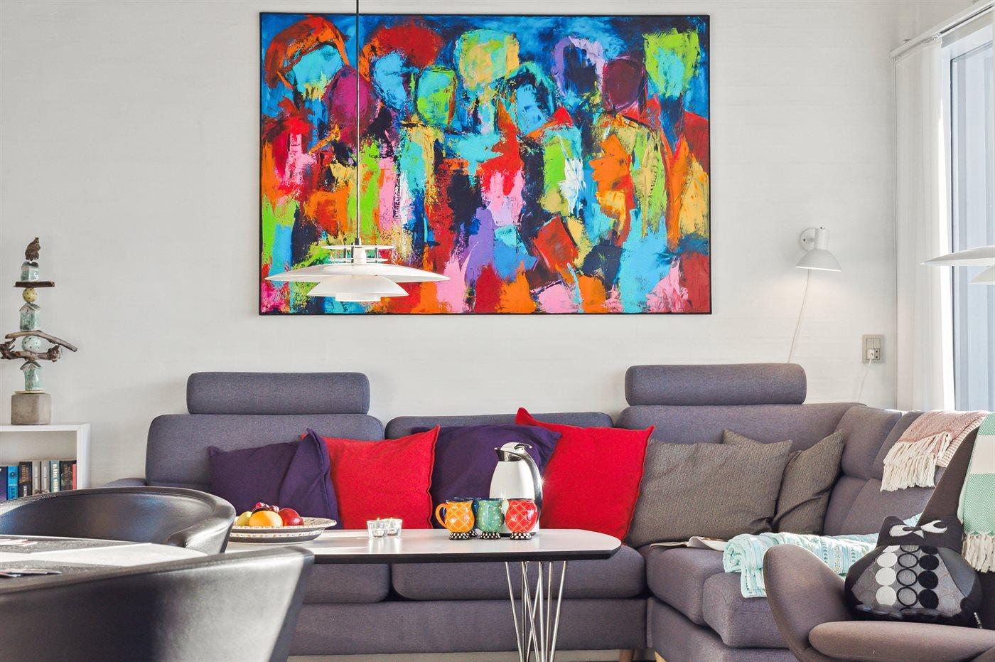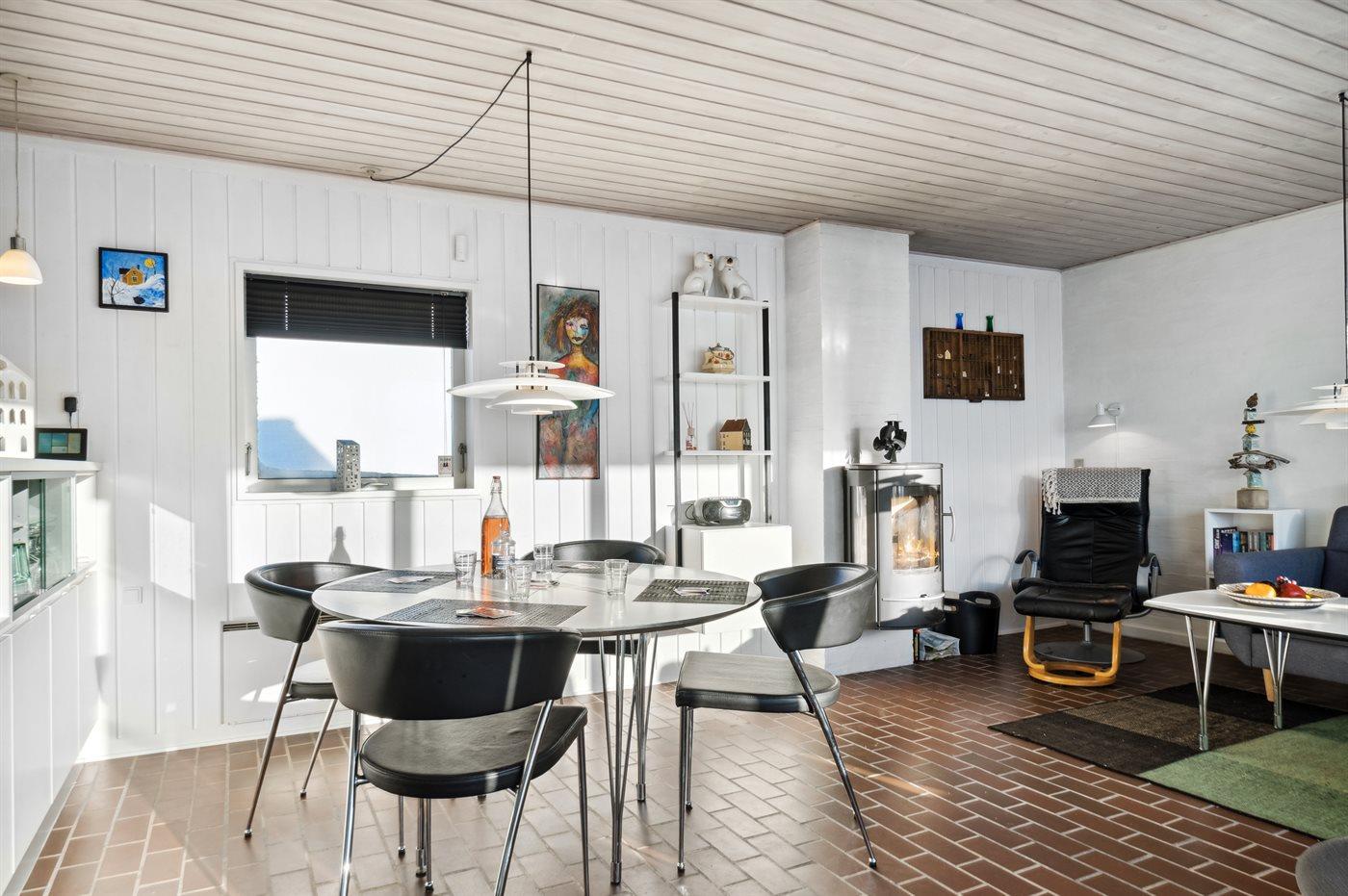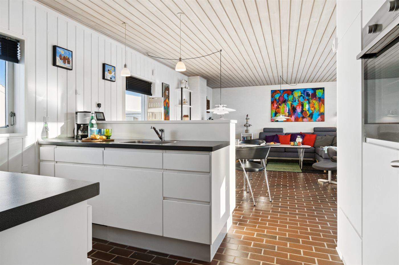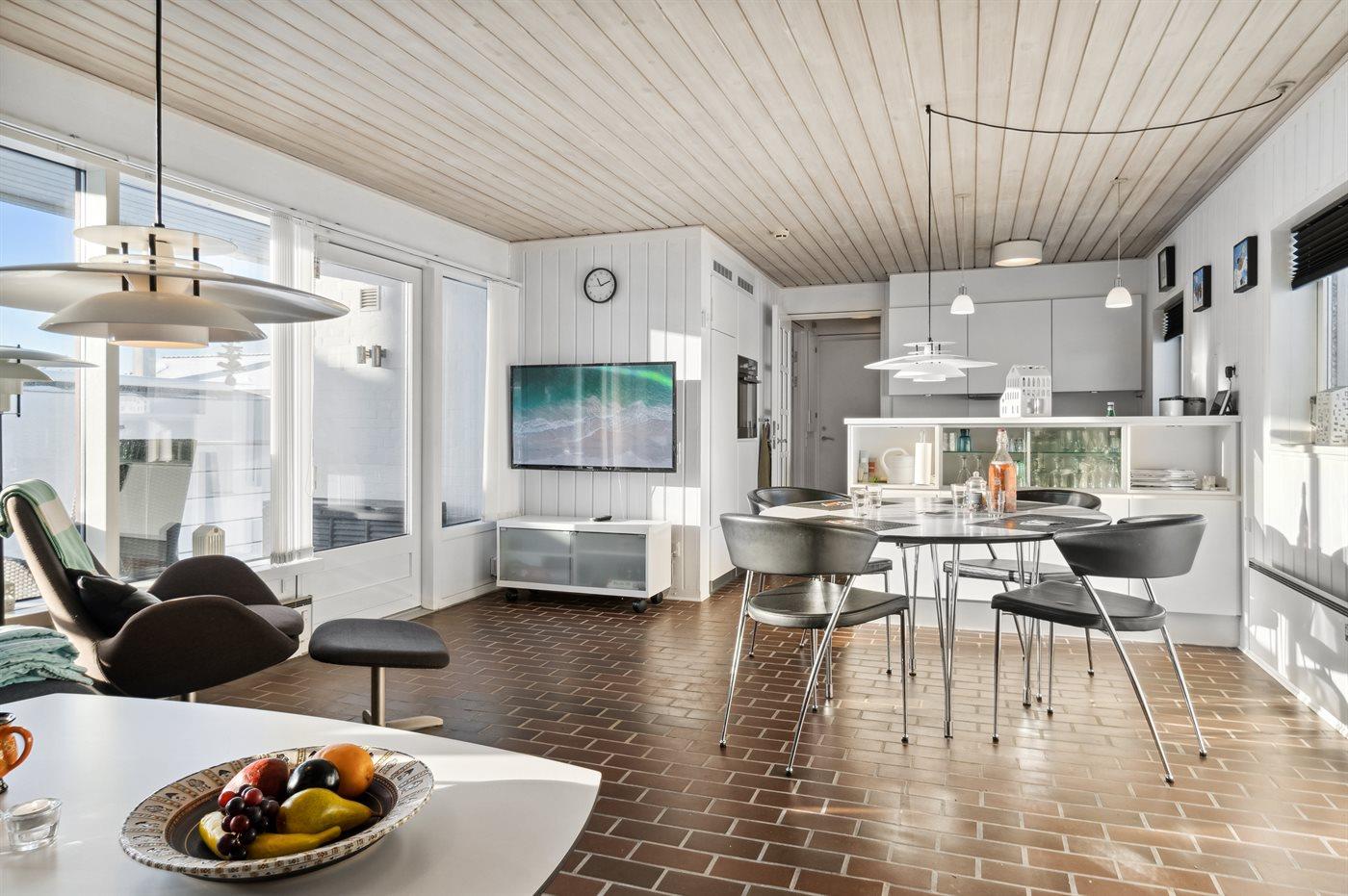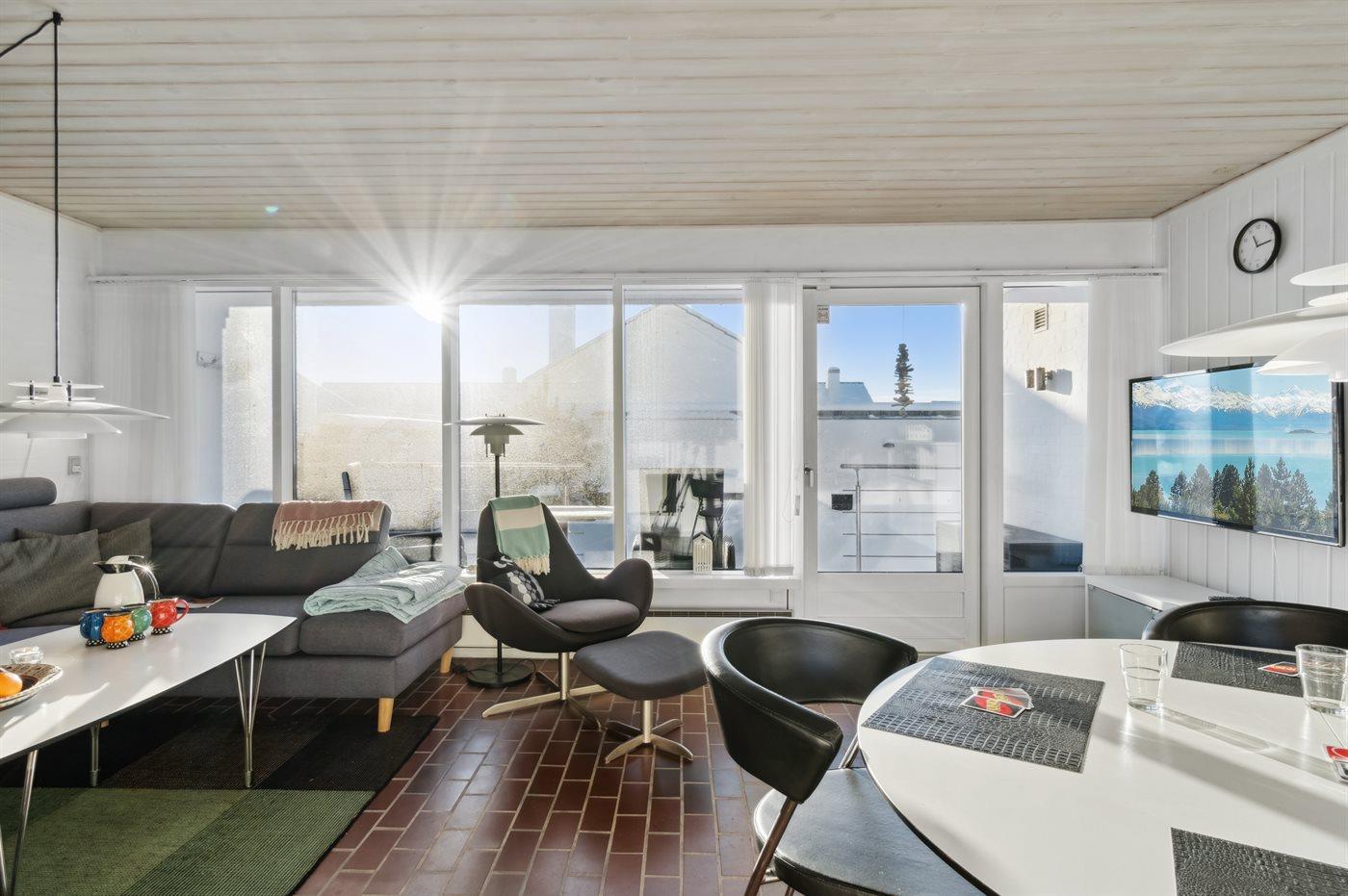 Hyggelig og lyst indrettet feriebolig beliggende i feriebyen lige bag klitterne til stranden og Vesterhavet i et naturskønt og kuperet område.