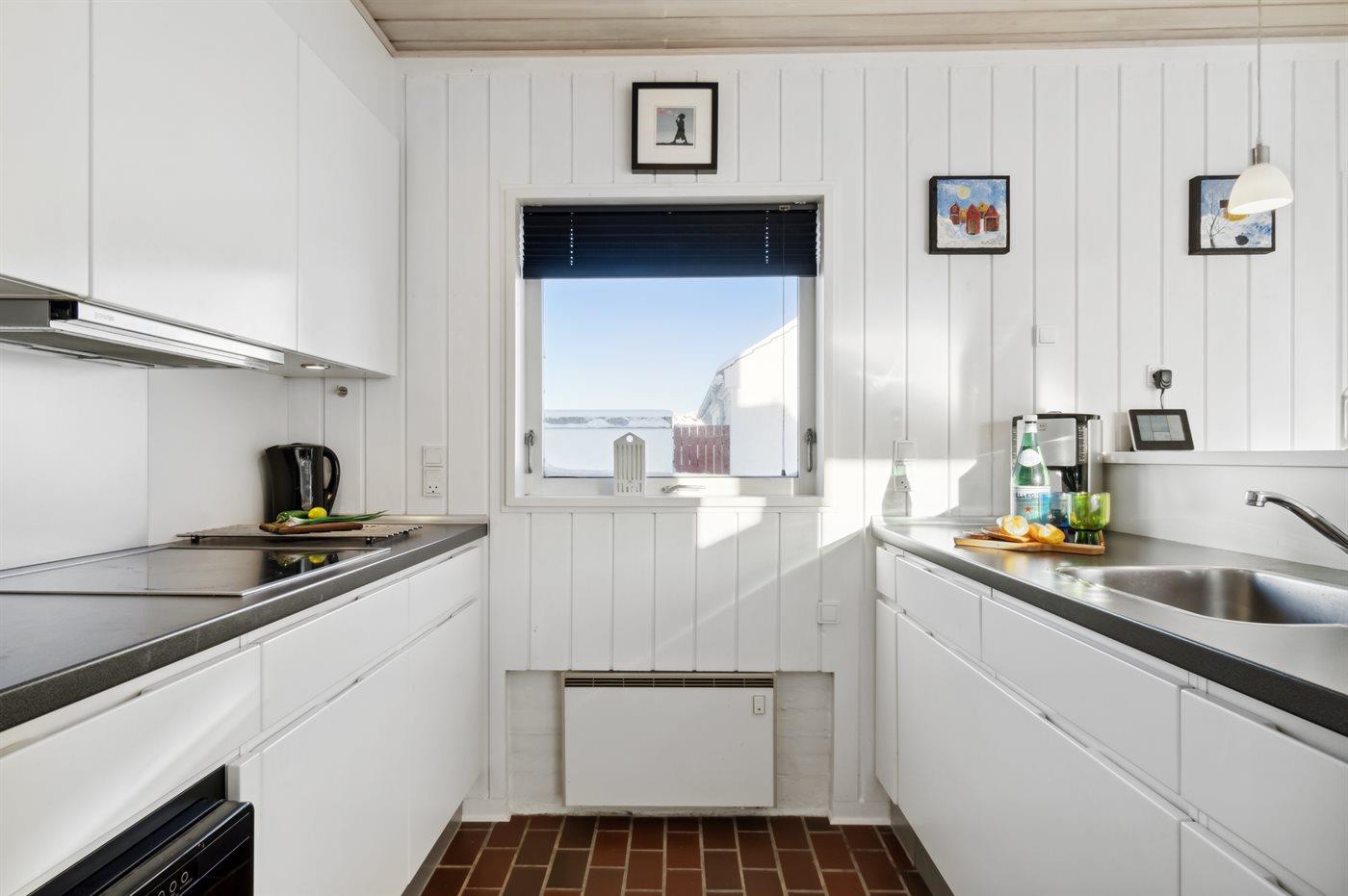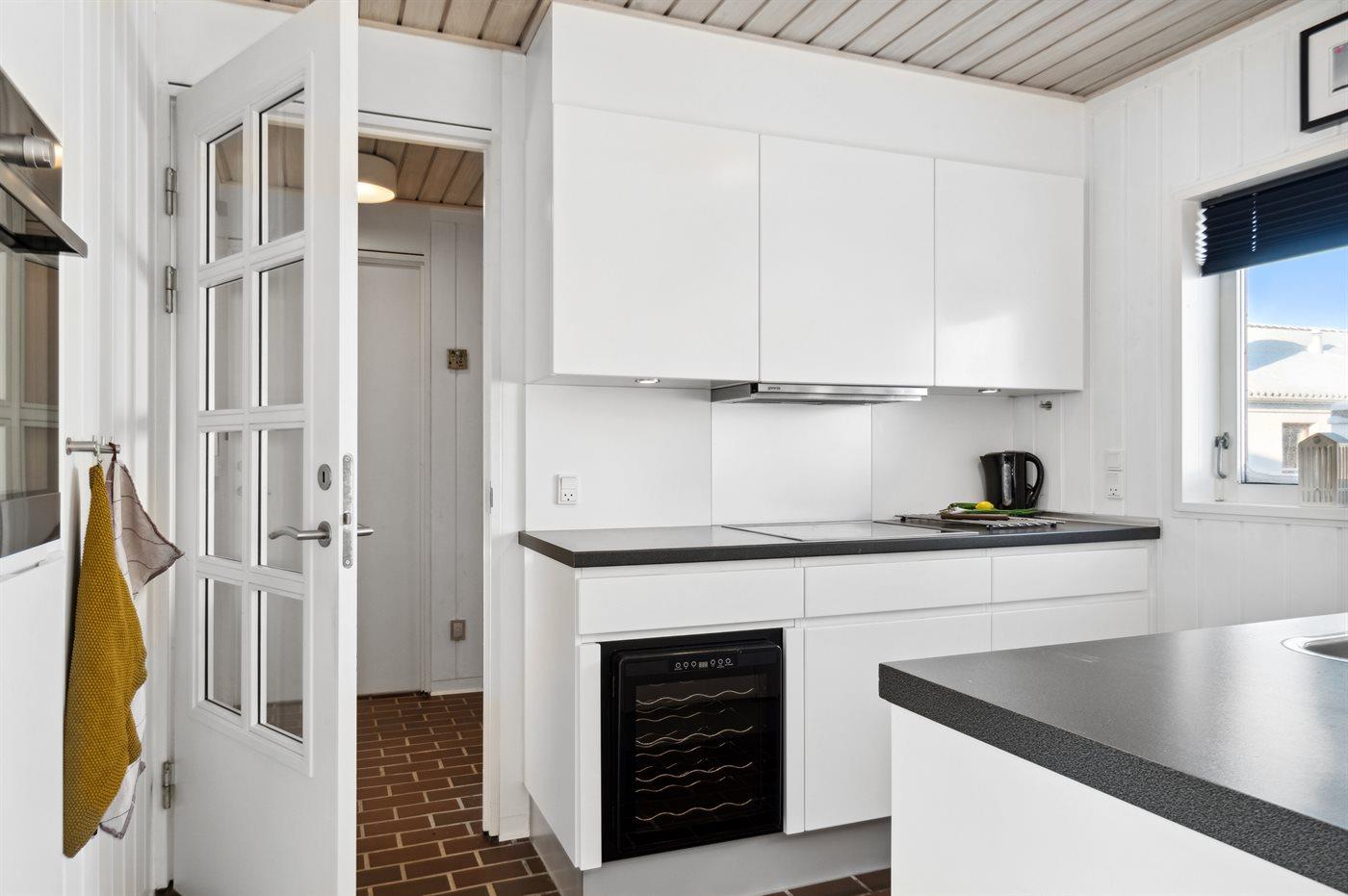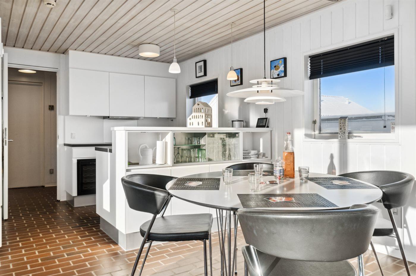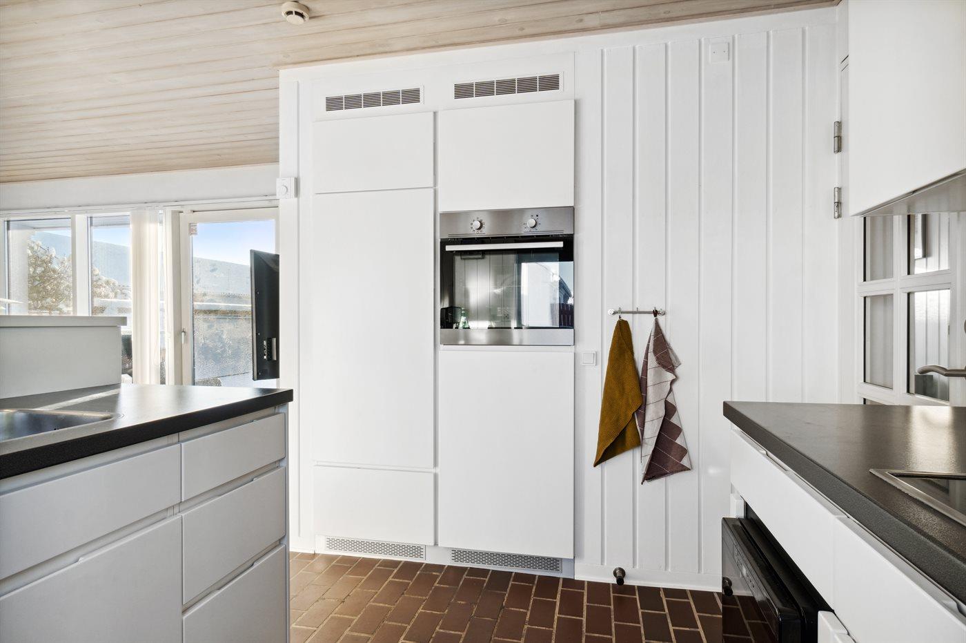 Køkkenet er udstyret med 1 køleskab. Der er 4 keramiske kogeplader, varmluftovn, mikrobølgeovn samt opvaskemaskine.