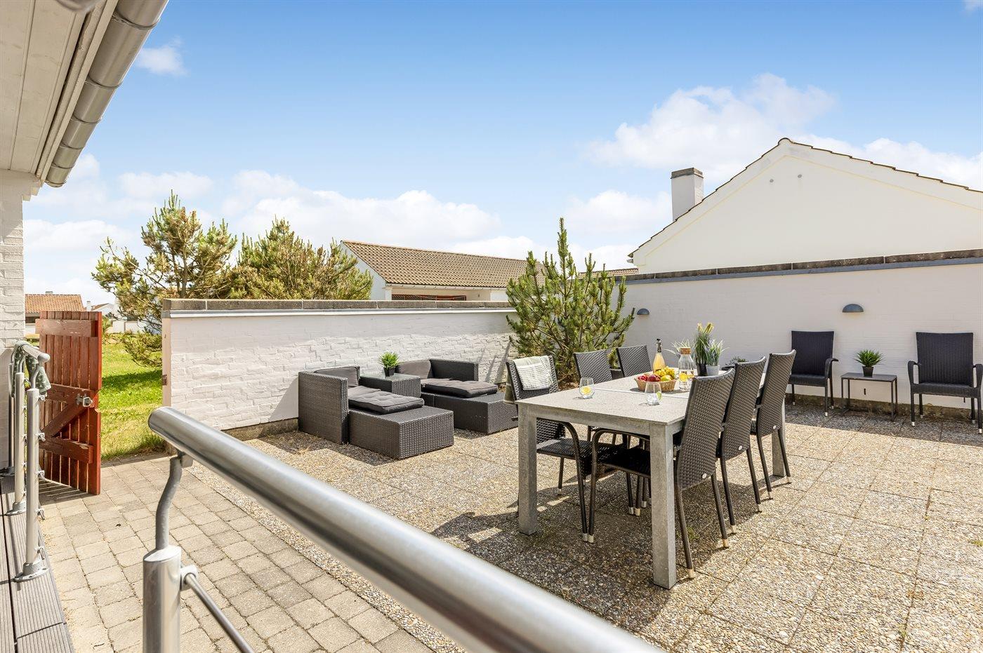 Ferieboligen er beliggende på en 150 m² stor naturgrund. Grunden er indhegnet. Der er 900 m til havet. Nærmeste forretning er beliggende i en afstand af 8000 m. Der er en golfbane i en afstand af 6000 m. Til ferieboligen hører 40 m² terrasseareal. Desuden er der 10 m² overdækket terrasse. Der er redskabsrum. Der ligger en legeplads i en afstand af 50 m. Grill til rådighed. Parkering ved ferieboligen.