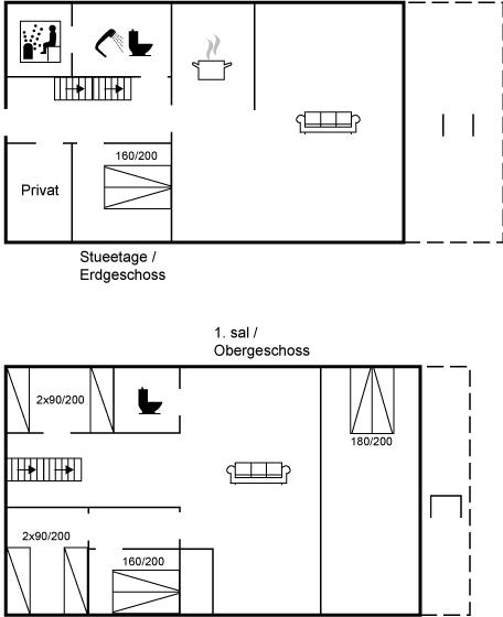 Der er i alt 5 soveværelser. Sovepladserne fordeler sig på: 6 sovepladser i dobbeltsenge. 3 sovepladser i enkeltsenge.