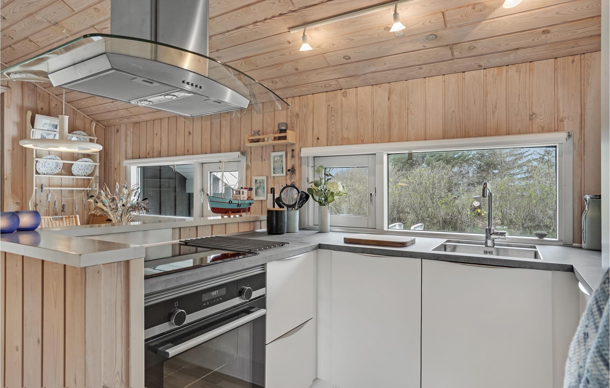 I vil føle jer hjemme, så snart I træder ind i huset. Åbent til kip i kombination med attraktiv indretning og trægulve, vægge- og lofter skaber en rendyrket sommerhusstemning. I det åbne køkken kan nogle af jer tilberede lækre feriemåltider, mens andre flader ud i sofaen foran fjernsynet.