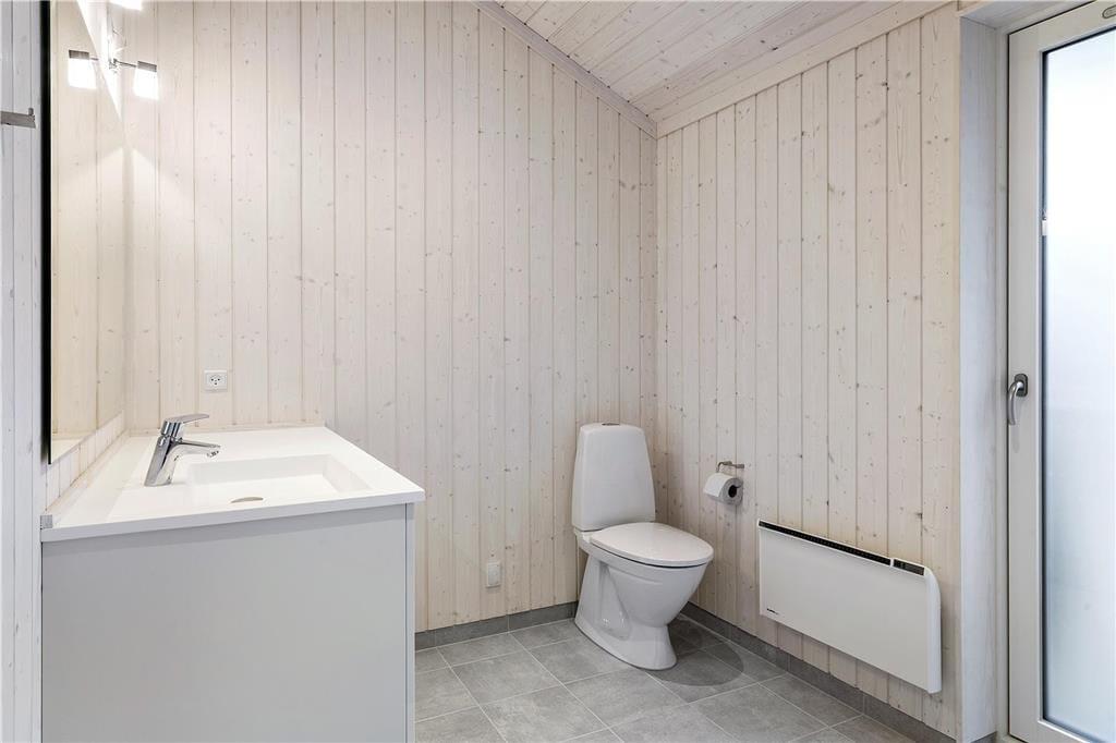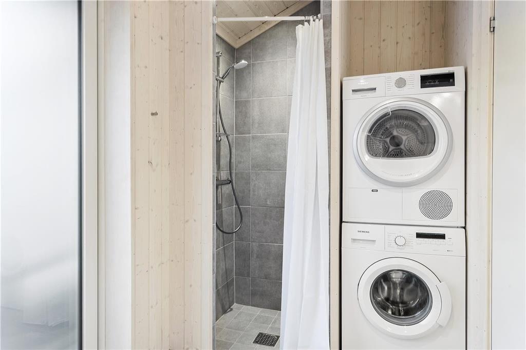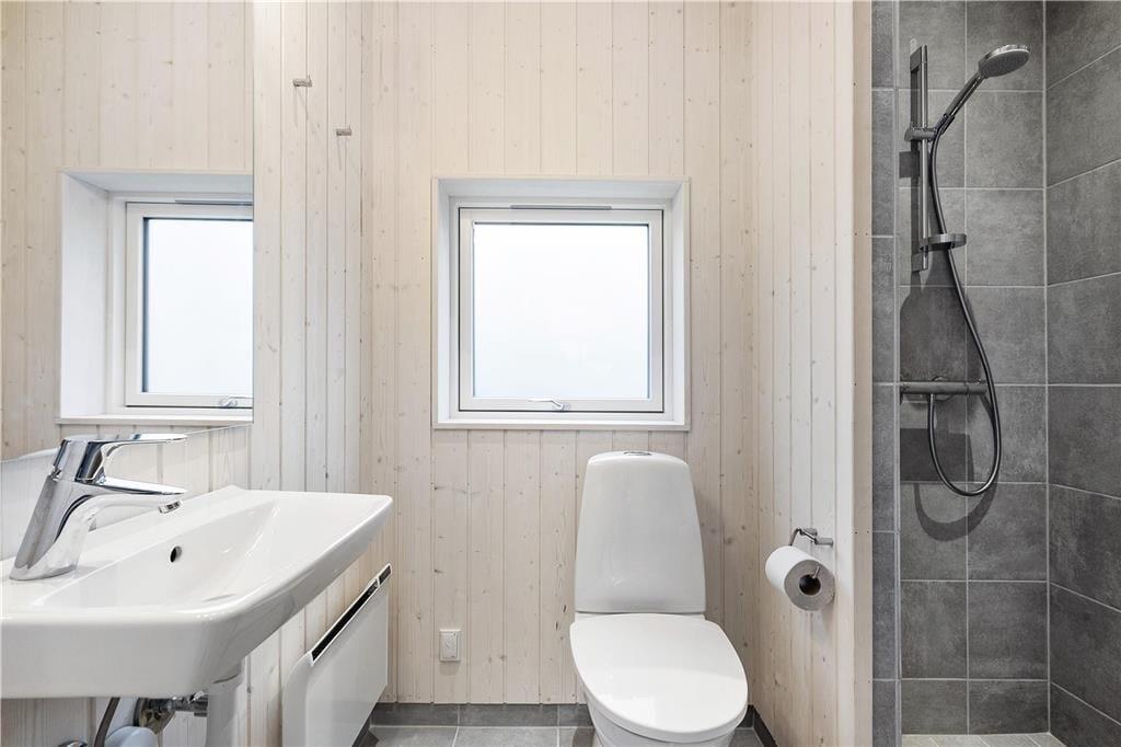 1 lækkert, stort badeværelse med bruseniche, toilet og håndvask. Vaskemaskine og tørretumbler. Fra badeværelse udgang til den vestvendte terrasse.