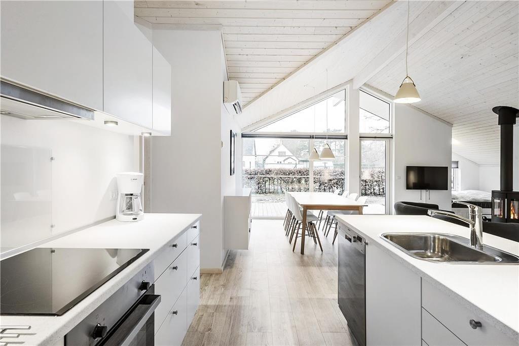 Rigtig lækkert køkken i åben forbindelse med hyggelig stue. I køkkenet er der 4 keramiske kogeplader og ovn, emhætte, køle/fryseskab, opvaskemaskine, kaffemaskine, elkedel samt alt øvrigt køkkengrej.