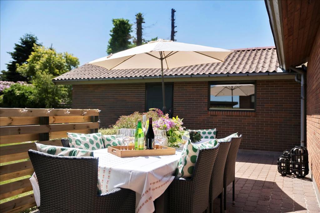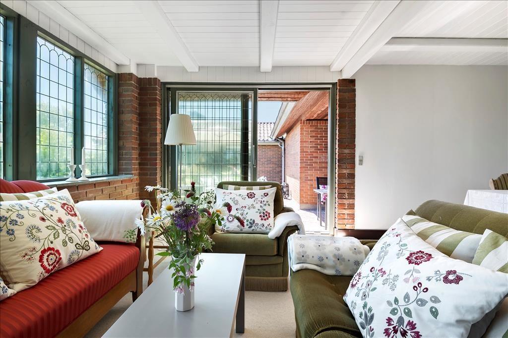 Stue med brændeovn, sofahjørne og spiseplads. TV & internet. Fra stuen er der udgang til terrassen.