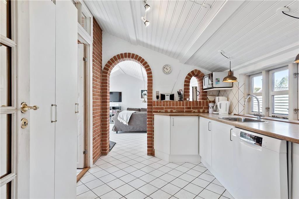 Pænt køkken med elkomfur med 4 kogeplader, mikroovn, elkedel, kaffemaskine, opvaskemaskine, køleskab samt alt øvrigt service og køkkengrej. Fryser i skur/udhus for enden af carporten.