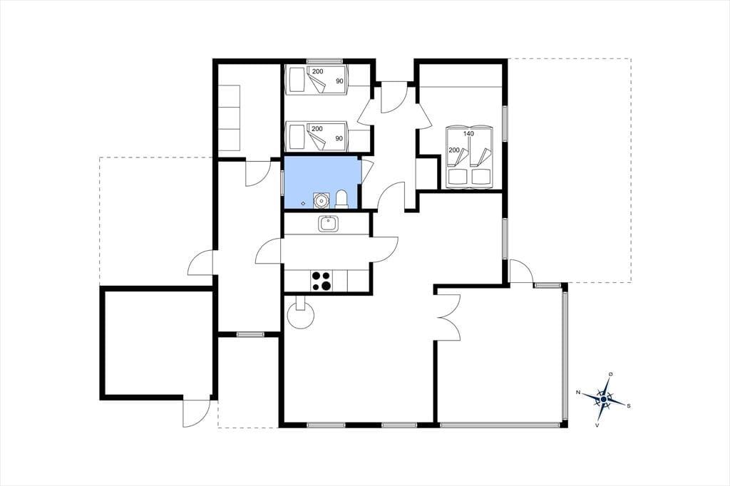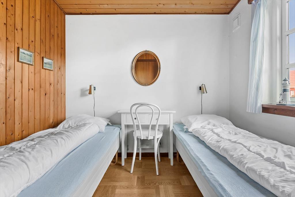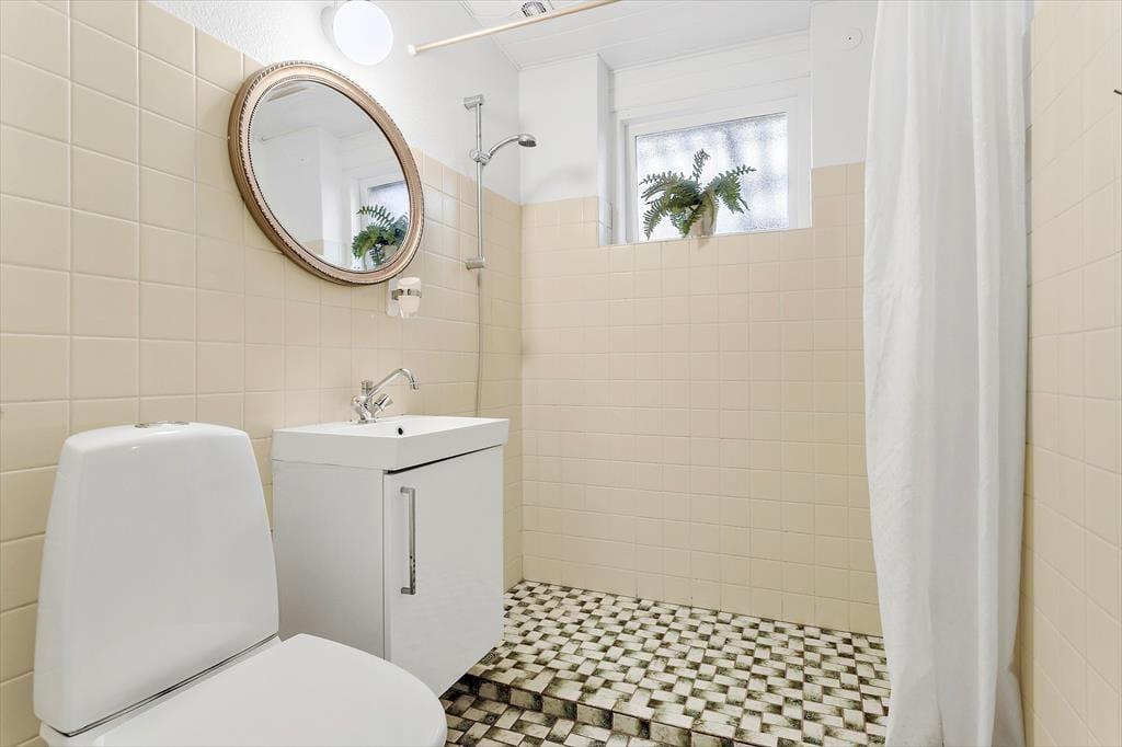 Badeværelse med toilet, håndvask og bruser. 2 værelser: 1 dobbeltseng og 2 enkeltsenge.