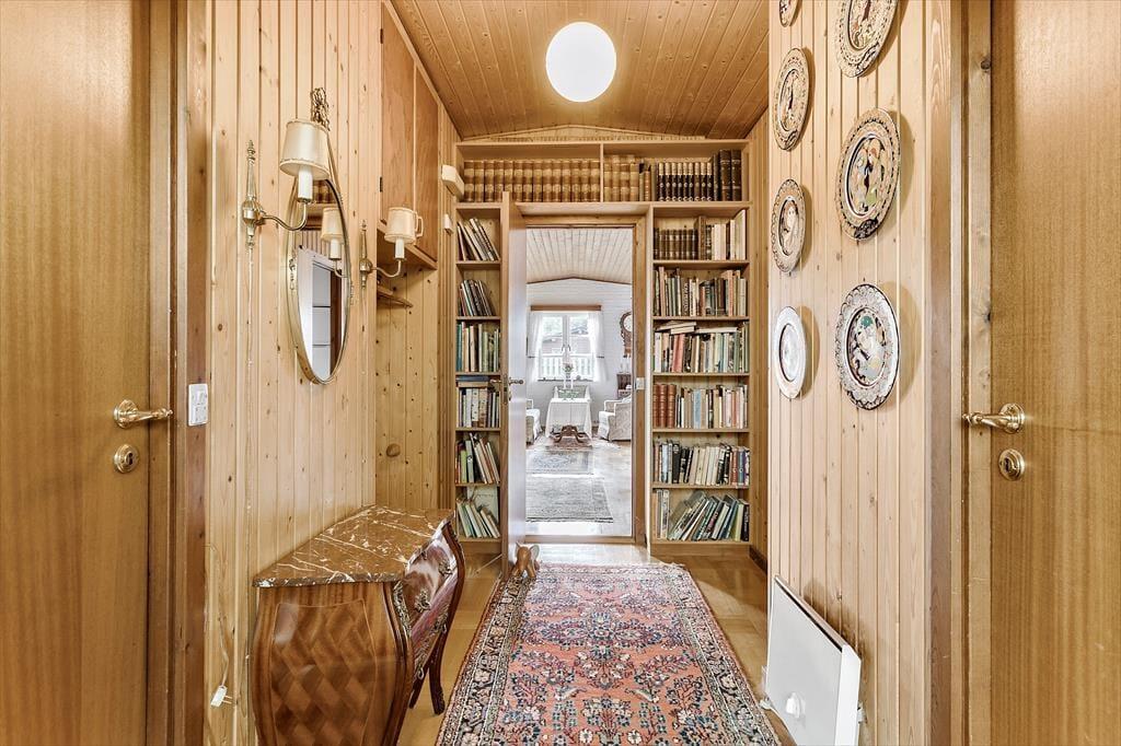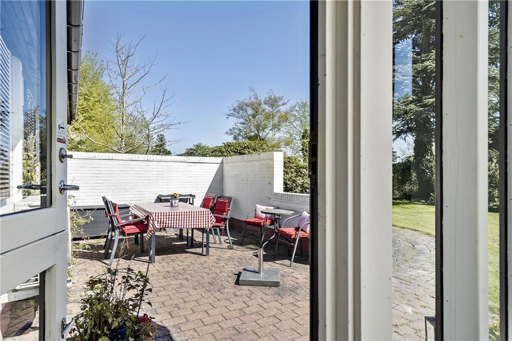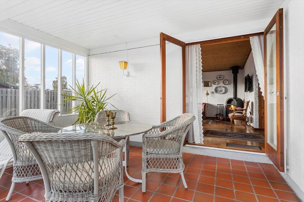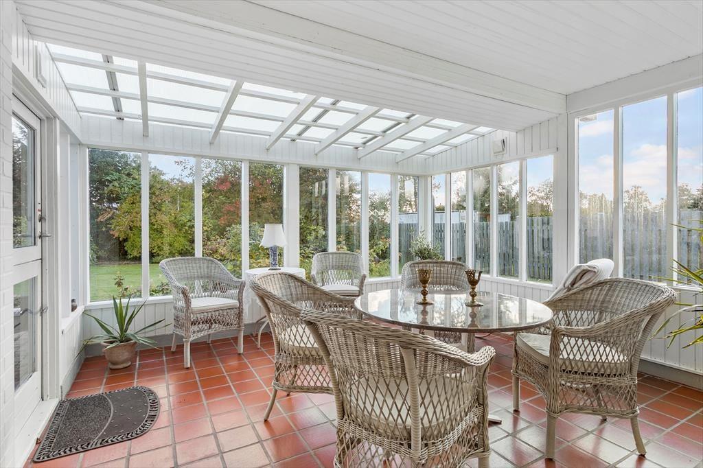 Fra stuen udgang til skøn, stor og lys udestue med bord og kurvestole.
