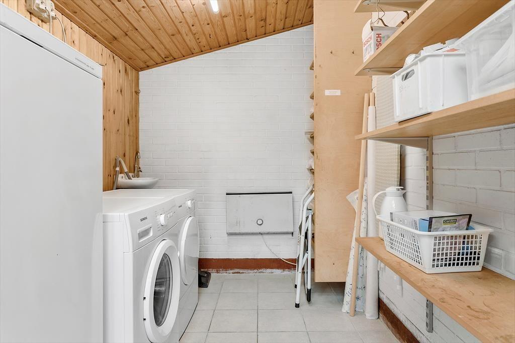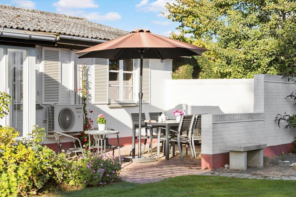 Fin lille lukket, overdækket gård med havebord og stole. Bryggers med vaskemaskine og tørretumbler.