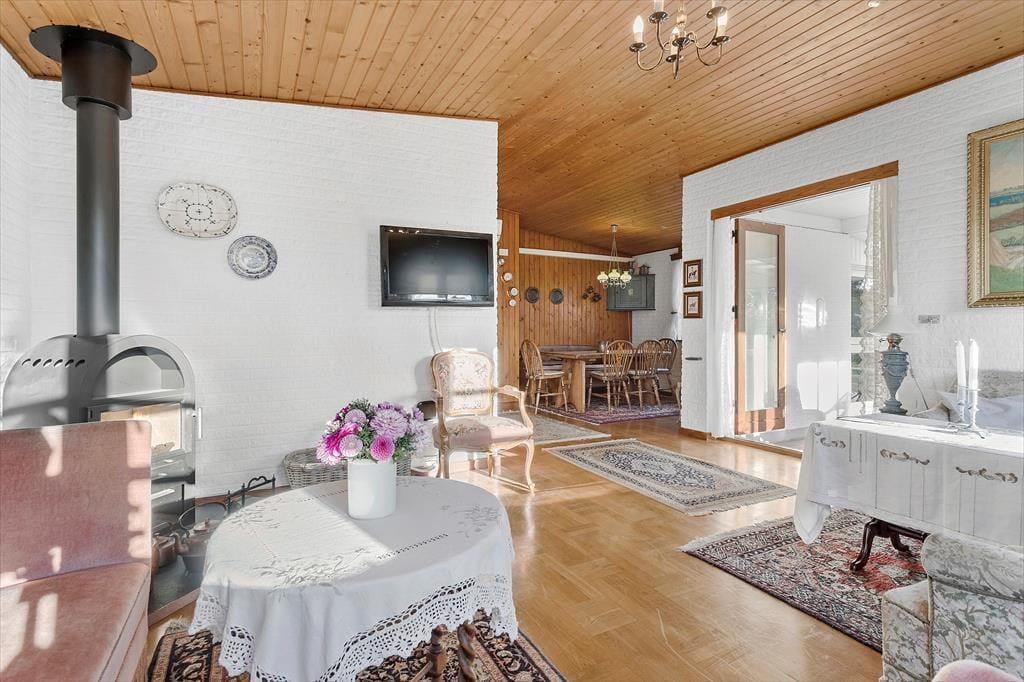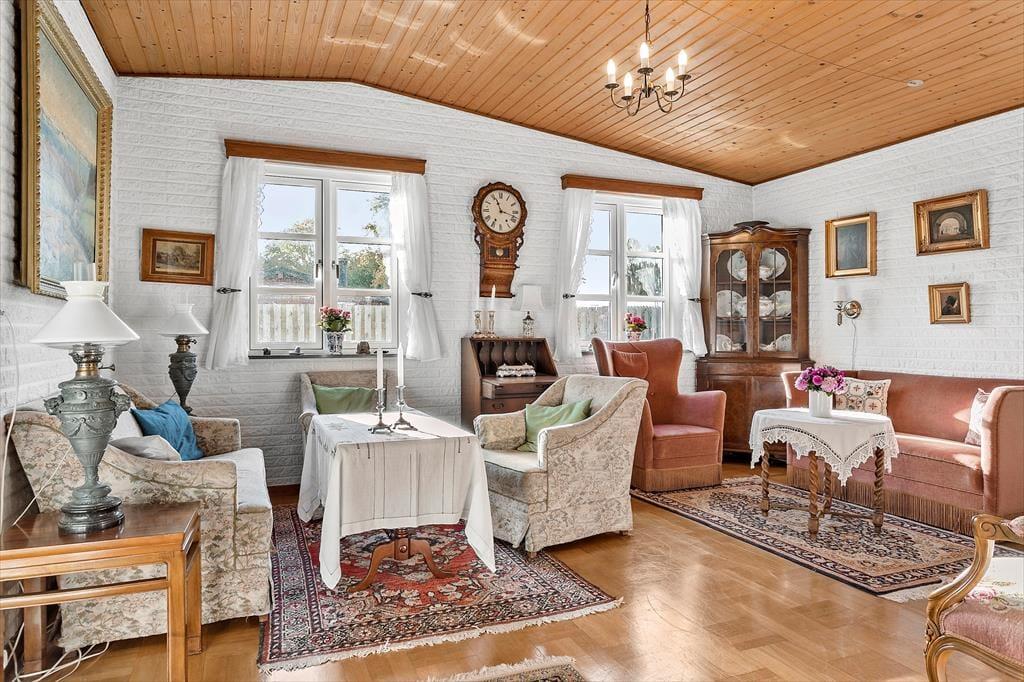 Dejlig stor stue med fin spisekrog, personligt indrettet med fine ældre møbler og rigtig hyggeligt inventar.