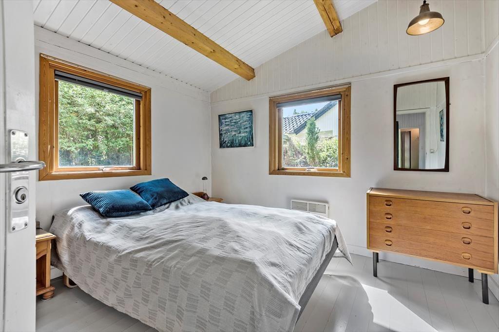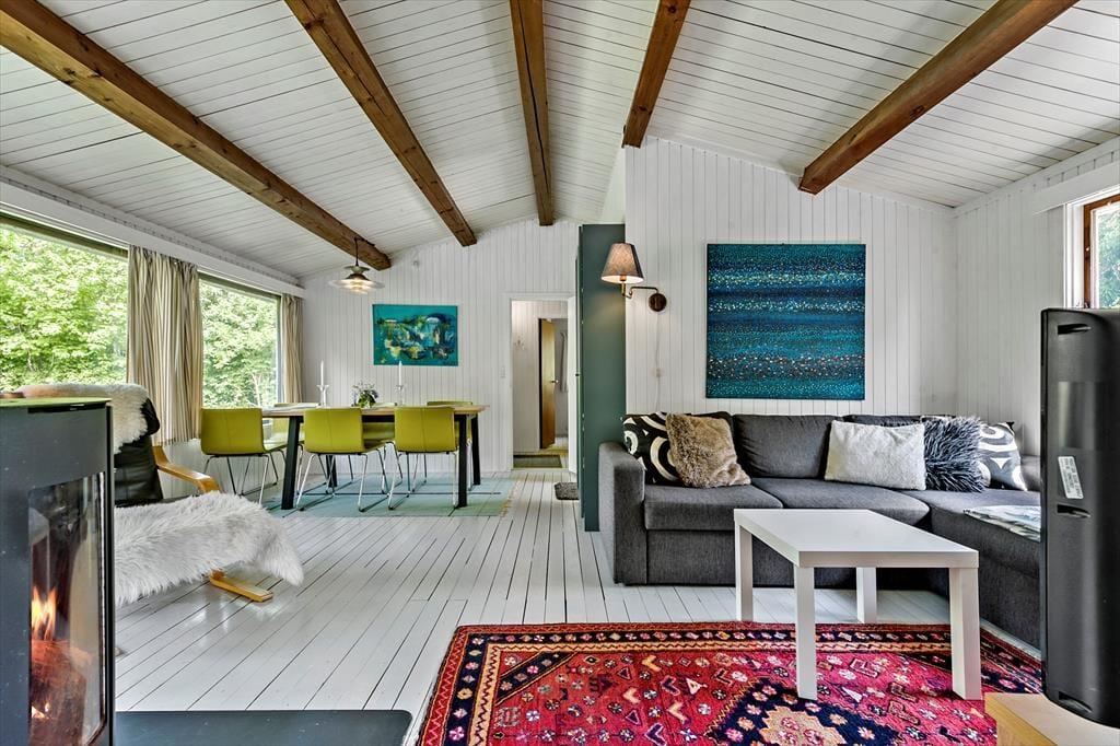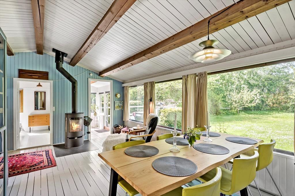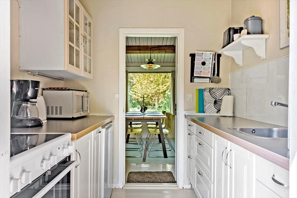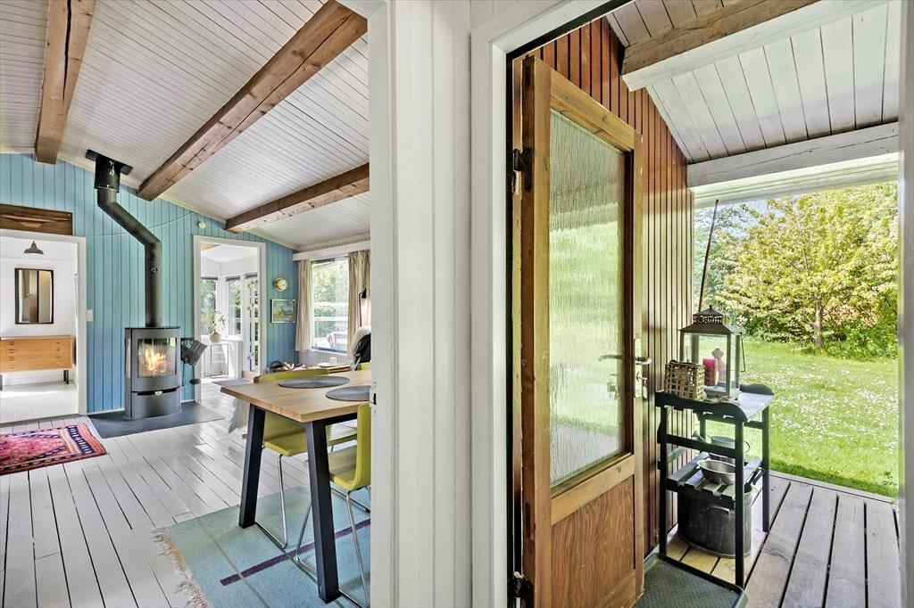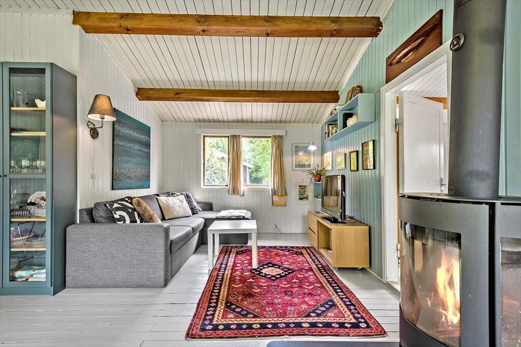 Indenfor finder du en hyggelig og funktionel indretning og 4 sengepladser. Her kan I nyde ferien og slappe af. I stuen kan du læse en bog eller se tv eller blot lytte til brændeovnens knitren, imens du nyder en kop kaffe og har udsigt til haven. Sommerhusets åbne lyse køkken har udgang direkte til en træterrasse, hvor I kan være sammen om at nyde dagens måltider. I den lyse havestue kan I sidde og nyde en stille stund og mærke en brise fra den åbne havedør.