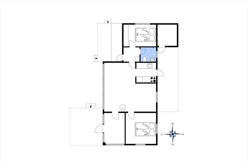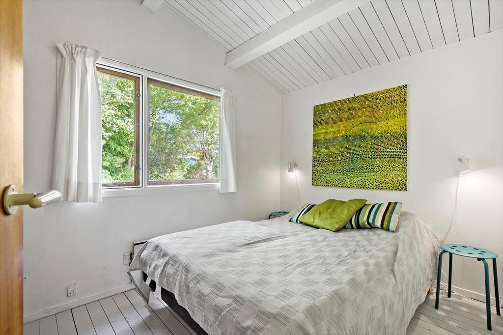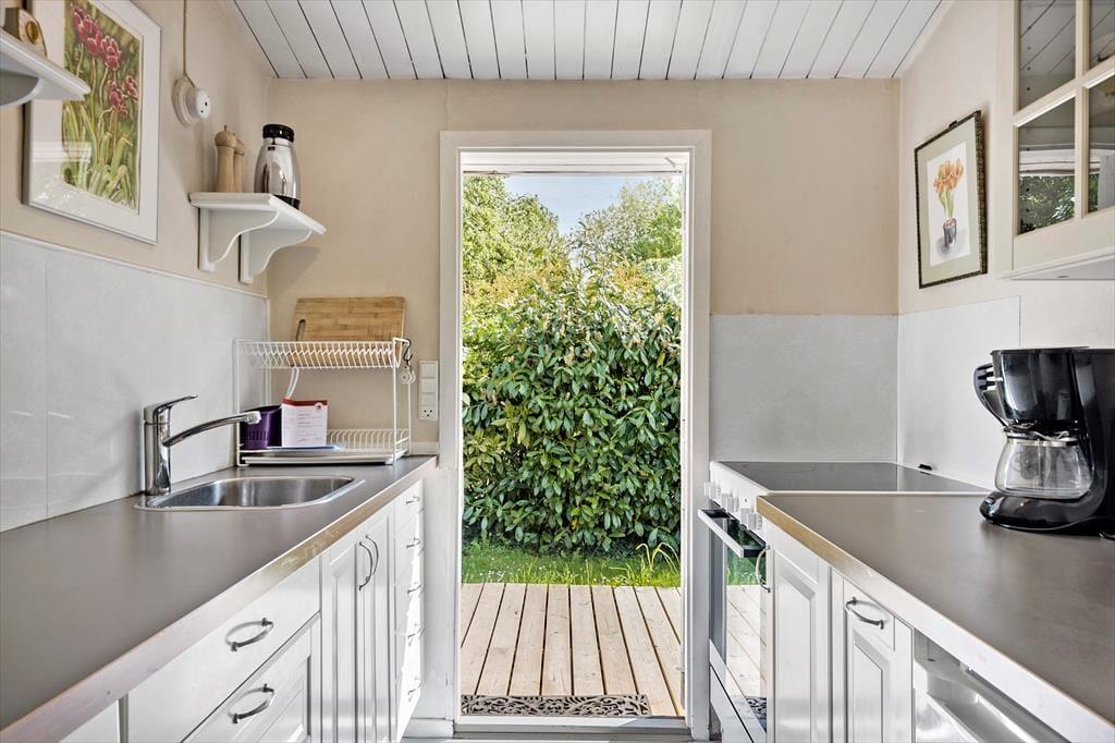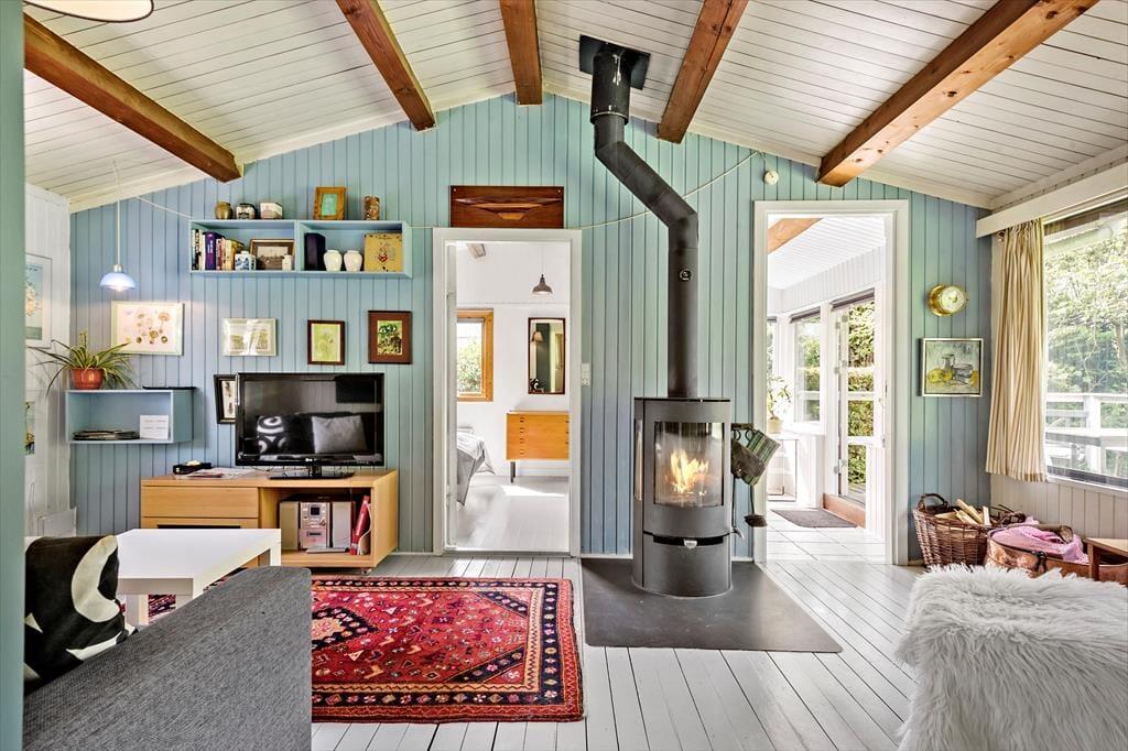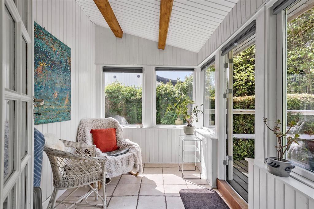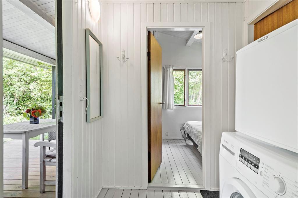 Indenfor finder du en hyggelig og funktionel indretning og 4 sengepladser. Her kan I nyde ferien og slappe af. I stuen kan du læse en bog eller se tv eller blot lytte til brændeovnens knitren, imens du nyder en kop kaffe og har udsigt til haven. Sommerhusets åbne lyse køkken har udgang direkte til en træterrasse, hvor I kan være sammen om at nyde dagens måltider. I den lyse havestue kan I sidde og nyde en stille stund og mærke en brise fra den åbne havedør.