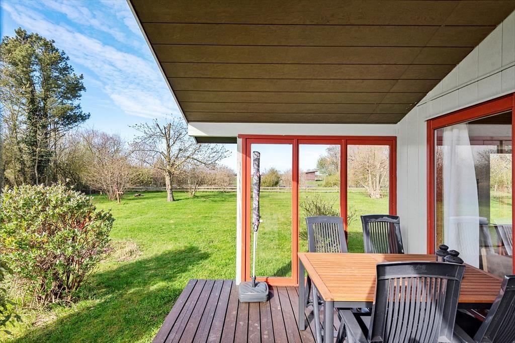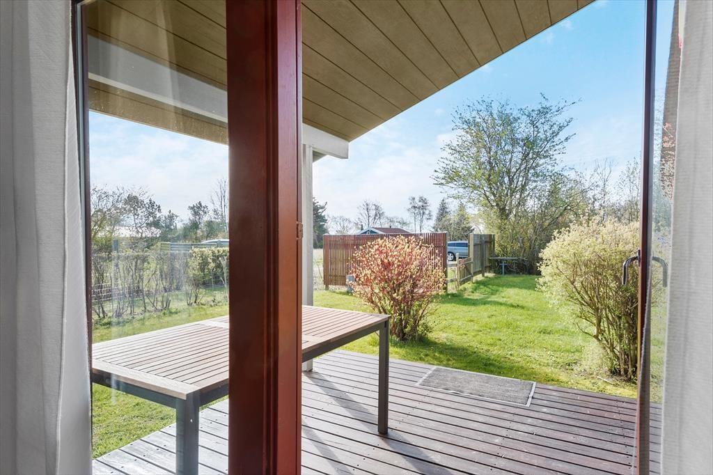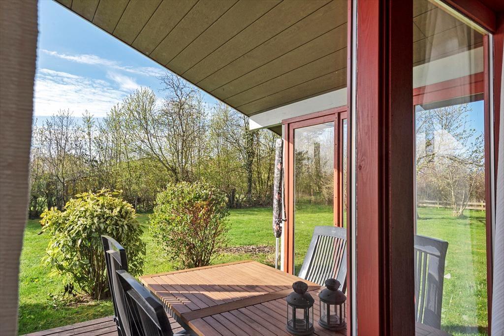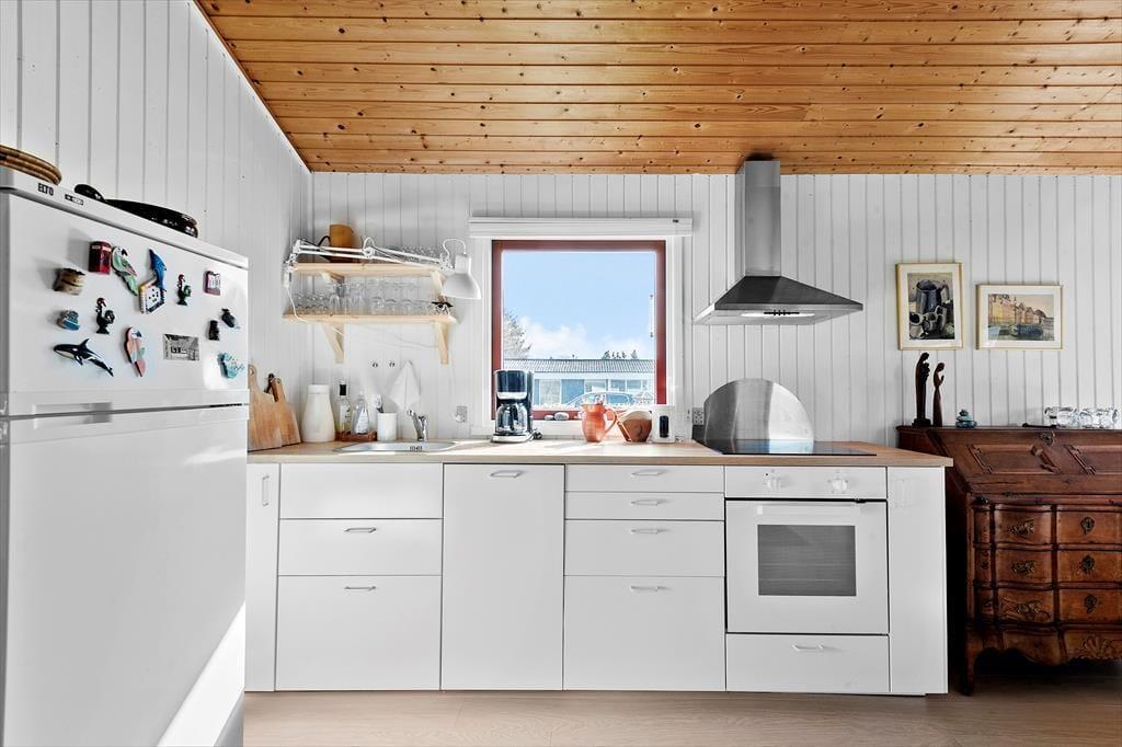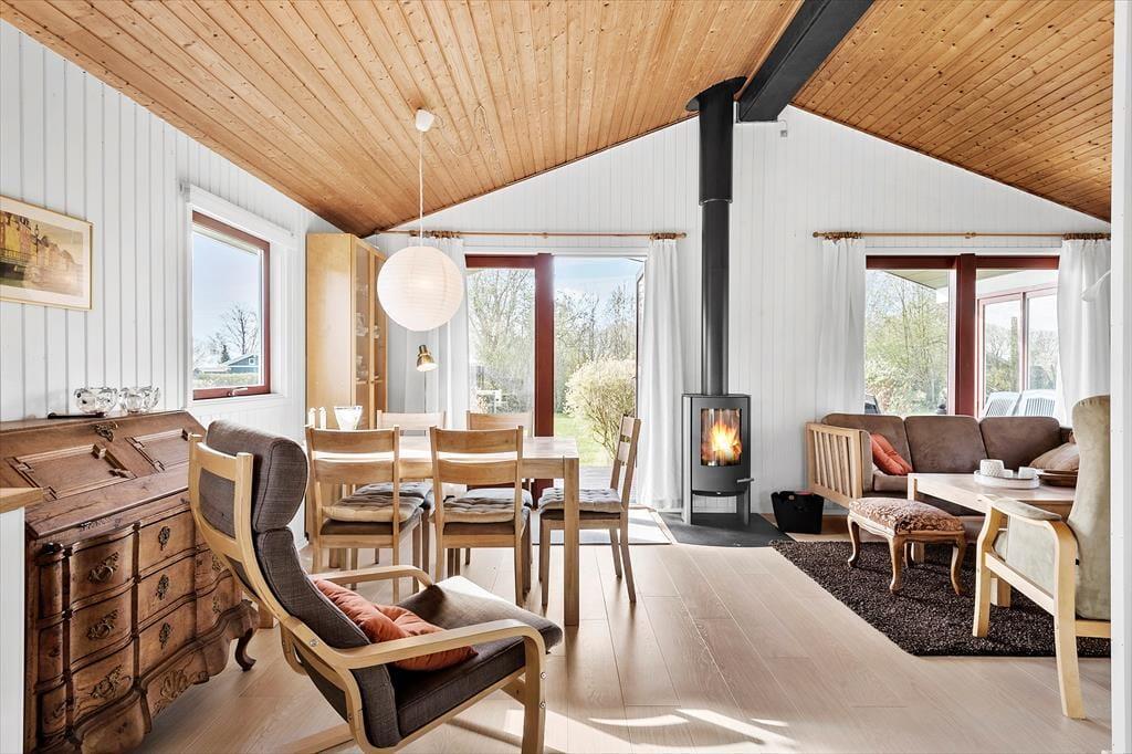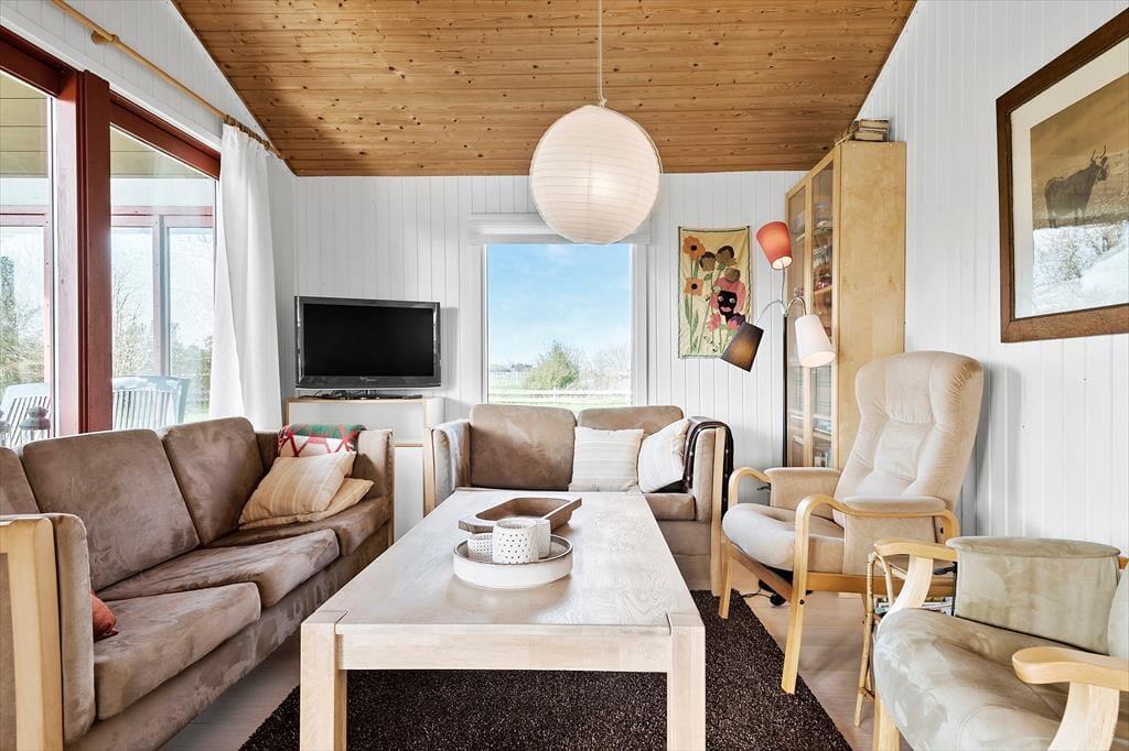I stuen er der spiseplads, brændeovn, sofaarrangement, TV med DR1 og DR2 og udgang til en skøn overdækket træterrasse.
