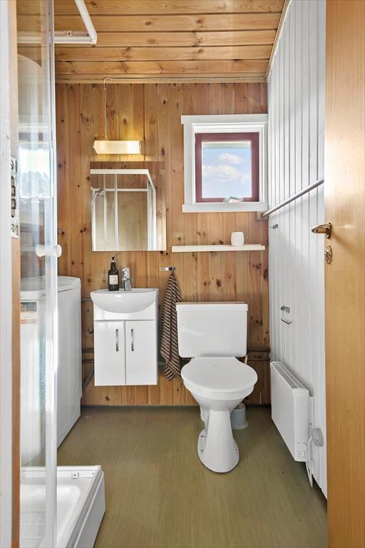 Til venstre er et badeværelse med bruseniche, toilet og håndvask, samt topbetjent vaskemaskine.