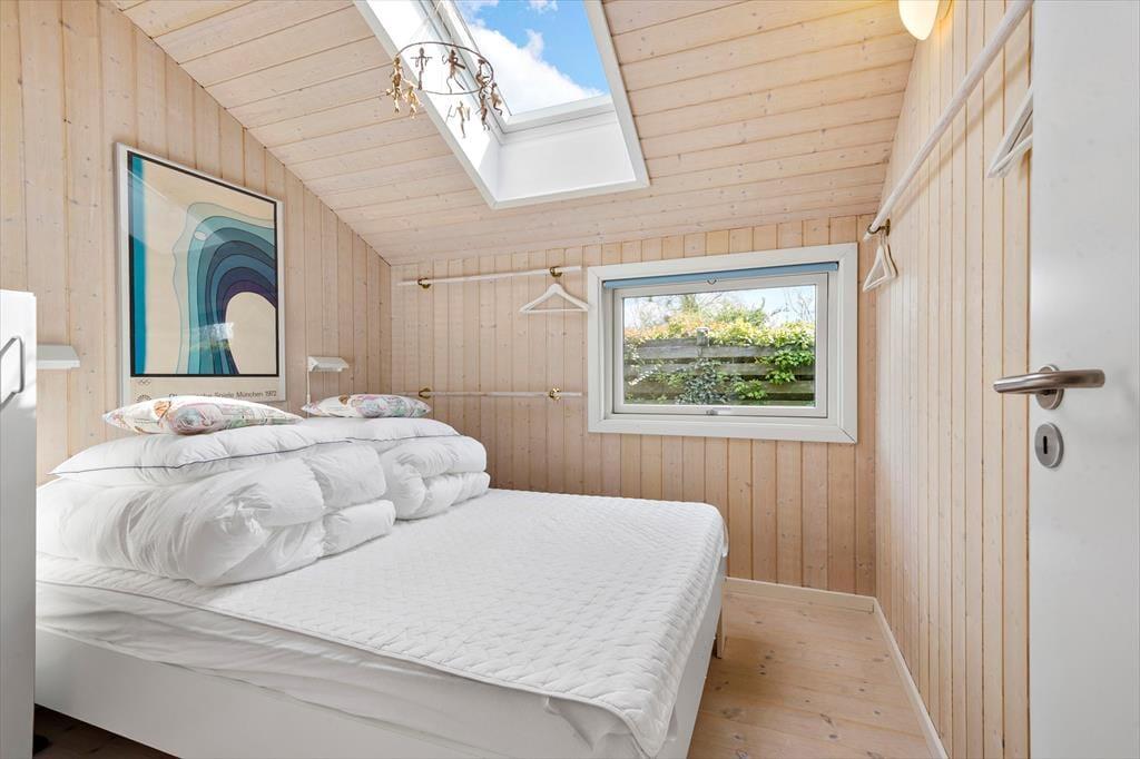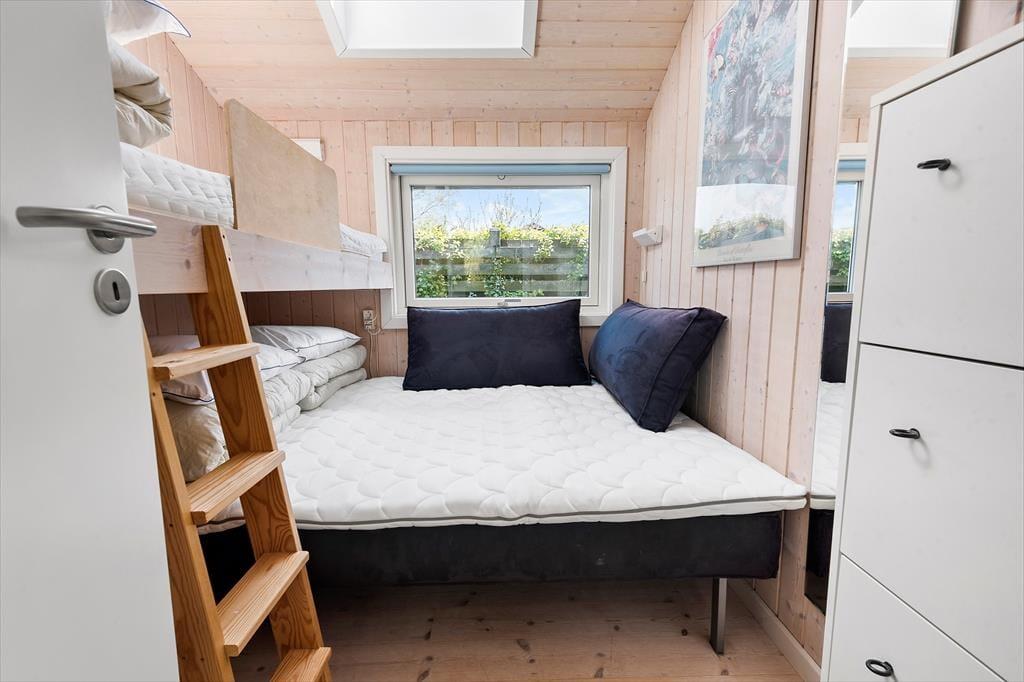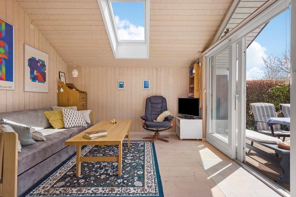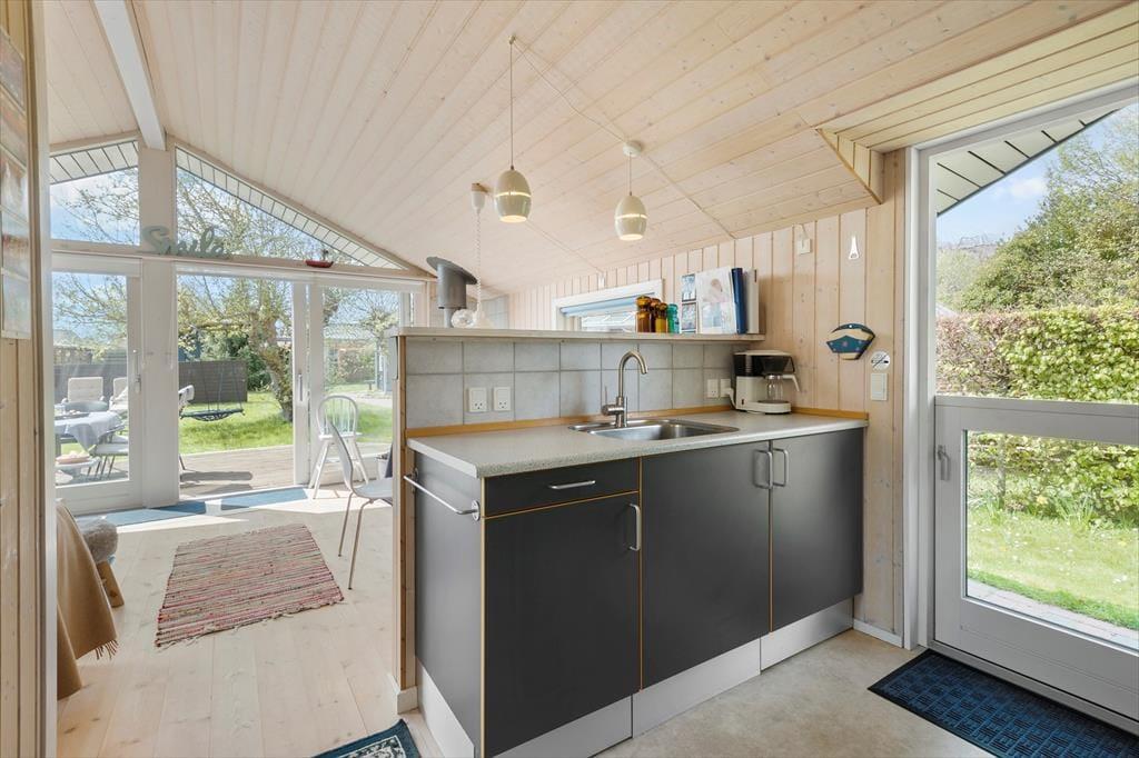 Her træder du direkte ind i køkkenet som har en åben planløsning til stuen. Køkkenet har alle fornødenheder som blandt andet el-kedel, kaffemaskine og opvaskemaskine. Her kan I være sammen som familie alt imens dagens måltider bliver lavet og de små måske tegner eller spiller brætspil ved sofa- eller spisebordet. Huset har et fint og rummeligt badeværelse med toilet, håndvask og bruseniche, samt vaskemaskine. 2 fine lyse soveværelser, hvor af det ene er til 3 personer. På kølige dage kan I tænde op i brændeovnen og nyde varmen fra sofaen. Det store vinduesparti i stuen kan åbnes op ud mod den dejlige terrasse.