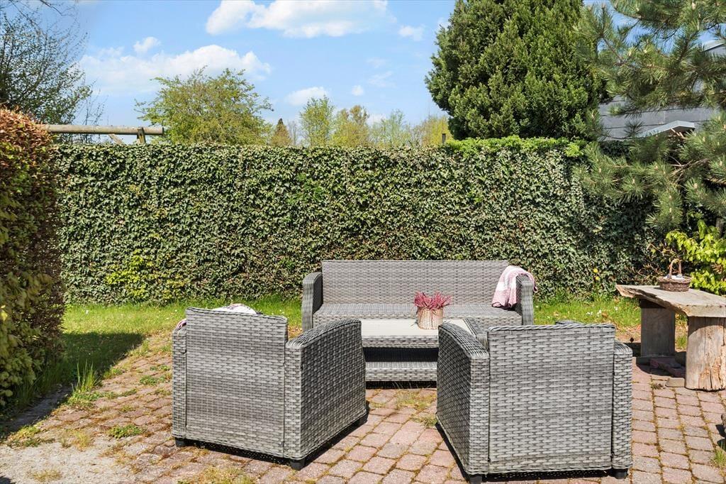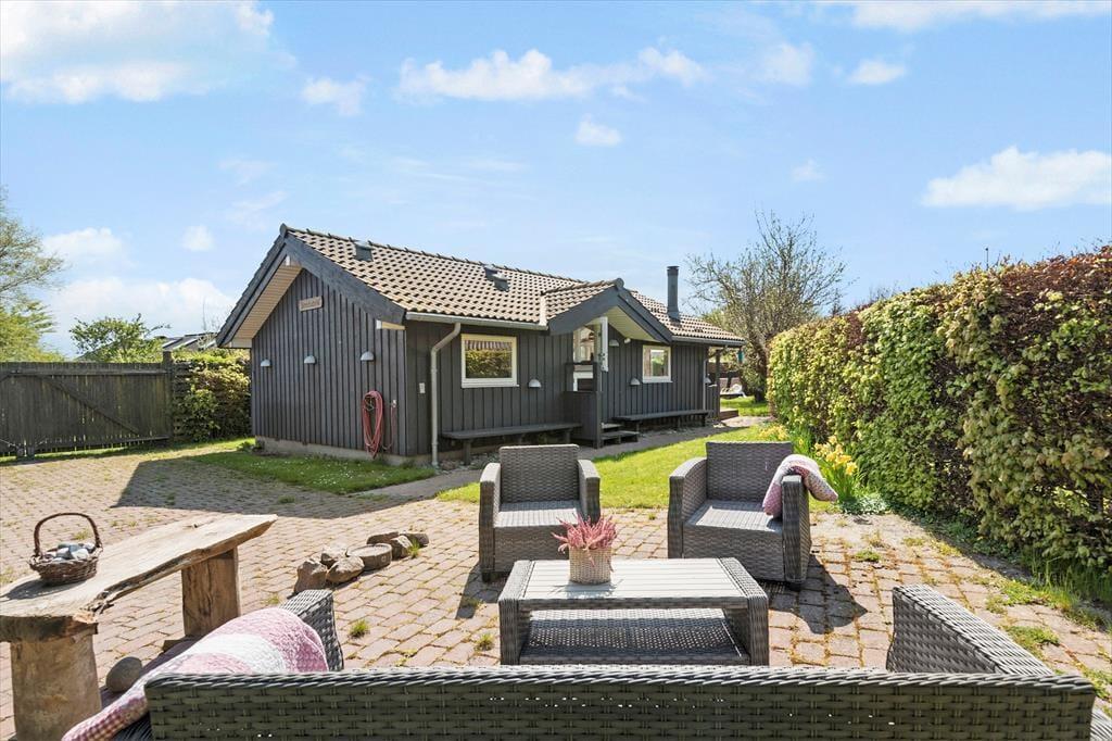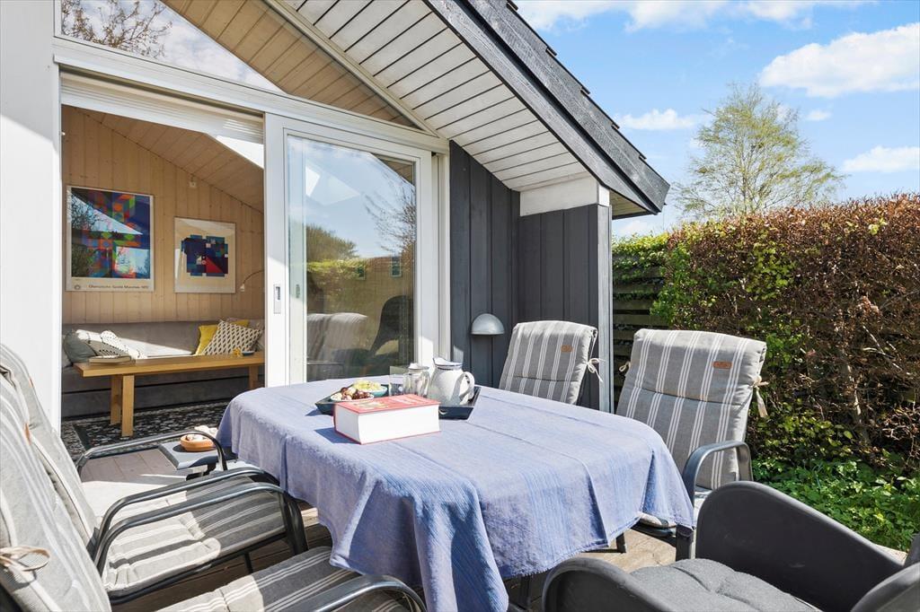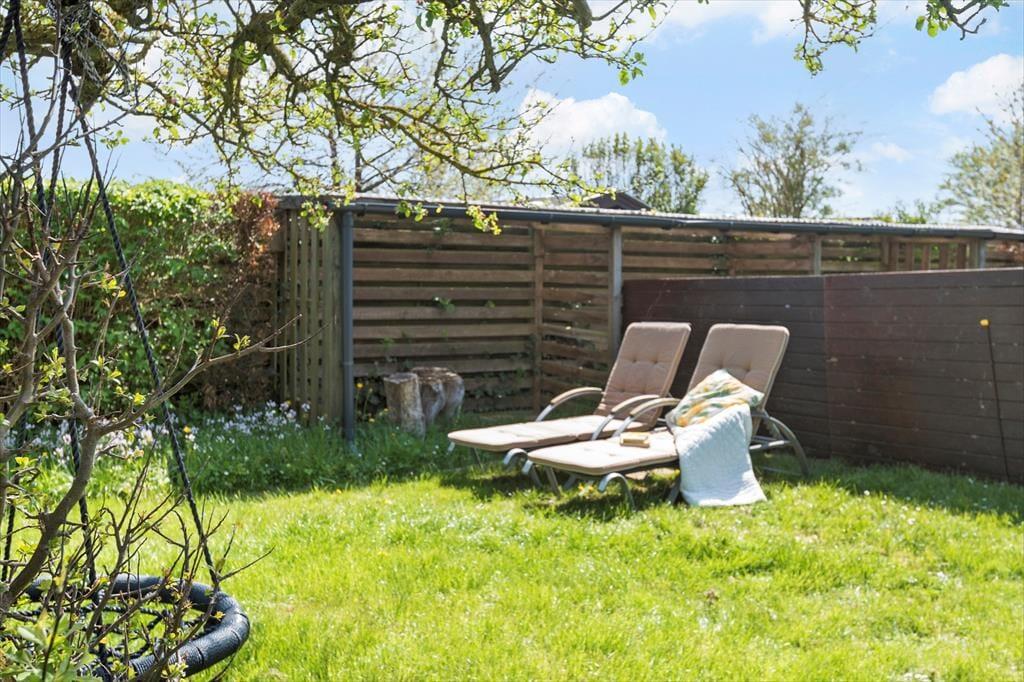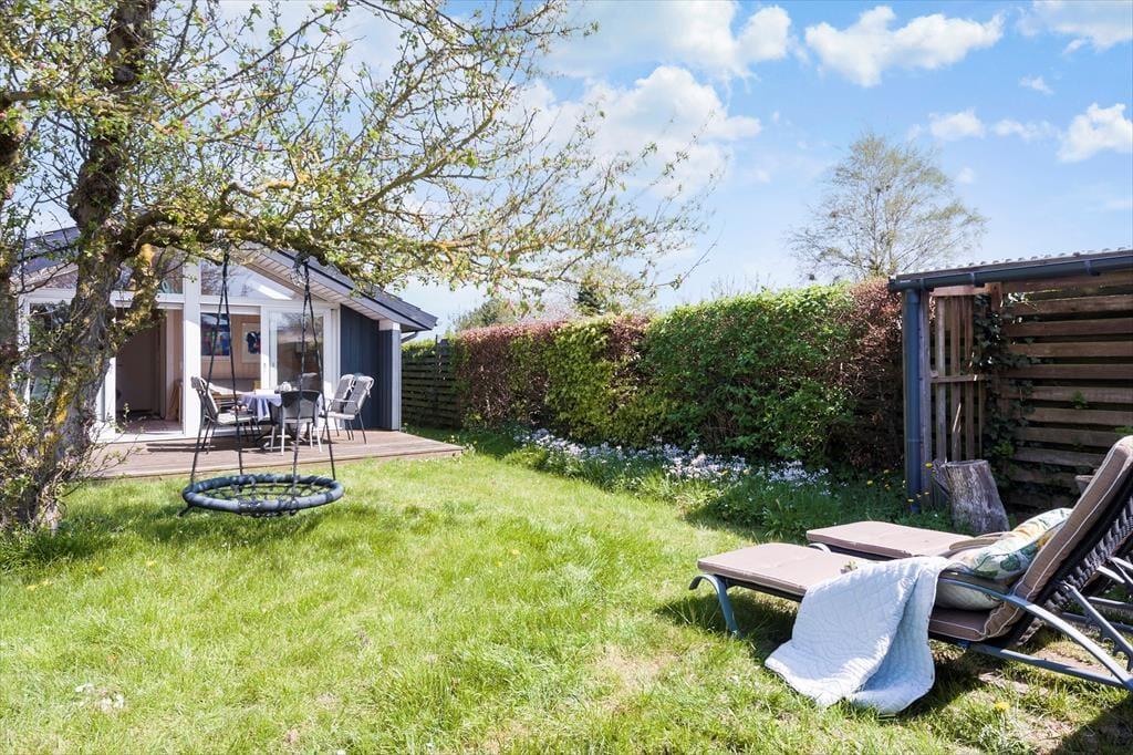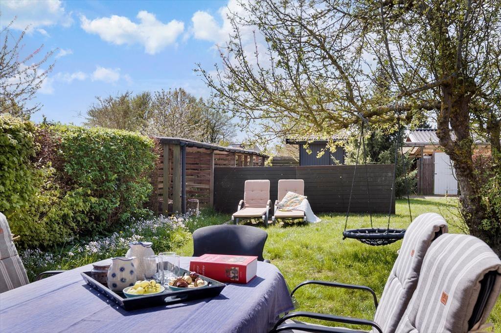 Fra stuen træder man direkte ud på en dejlig træterrasse med gode havemøbler. Her kan I begynde dagen med morgenmad til fuglenes sang og planlægge dagen i ro og mag. Haven er afskærmet og er der noget bedre end muligheden for en lur i skyggen af æbletræet eller et glas vin på terrassen når mørket sænker sig. Haven byder på flere siddepladsmuligheder og her kan du trække dig tilbage med en god bog.