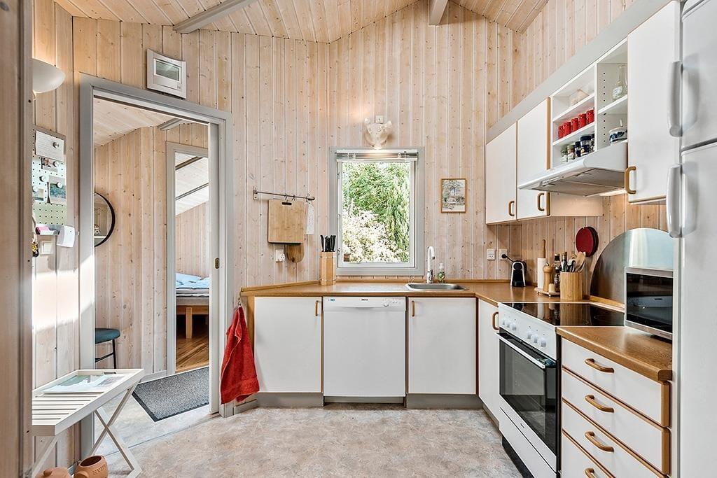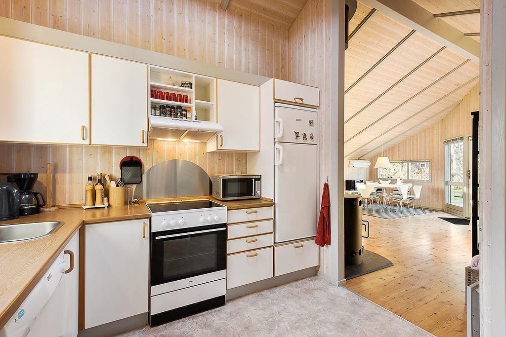 Pænt køkken med opvaskemaskine, komfur med ovn, mikroovn, køleskab/fryser, samt kaffemaskine og elkedel.