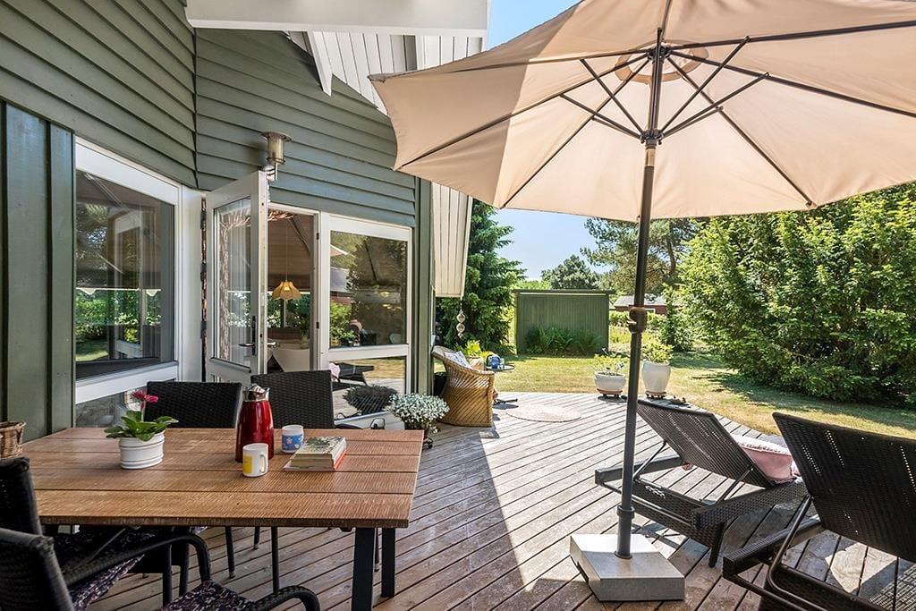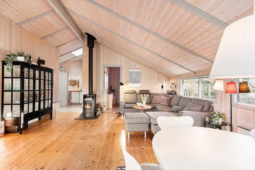 Dejlig stue med spiseplads, en stor sofa og TV og wifi, samt varmepumpe og brændeovn. Fra stuen er der udgang til en skøn træterrasse med havemøbler som er delvis overdækket.