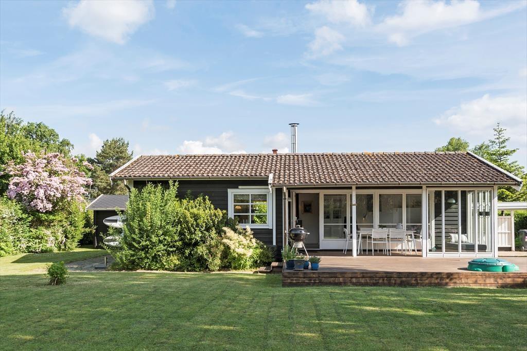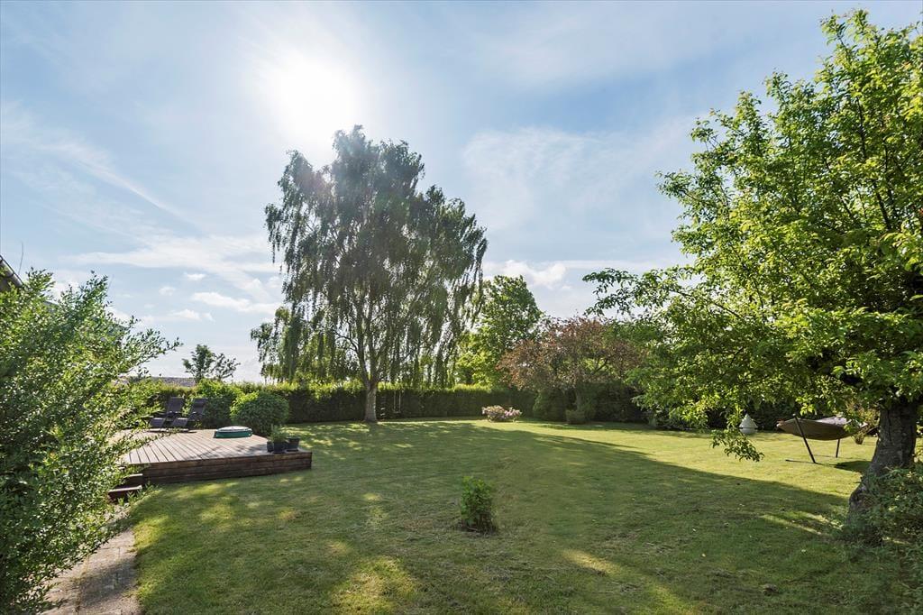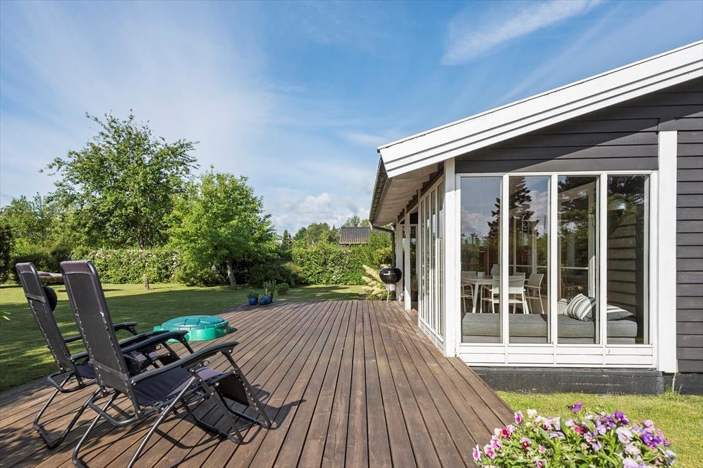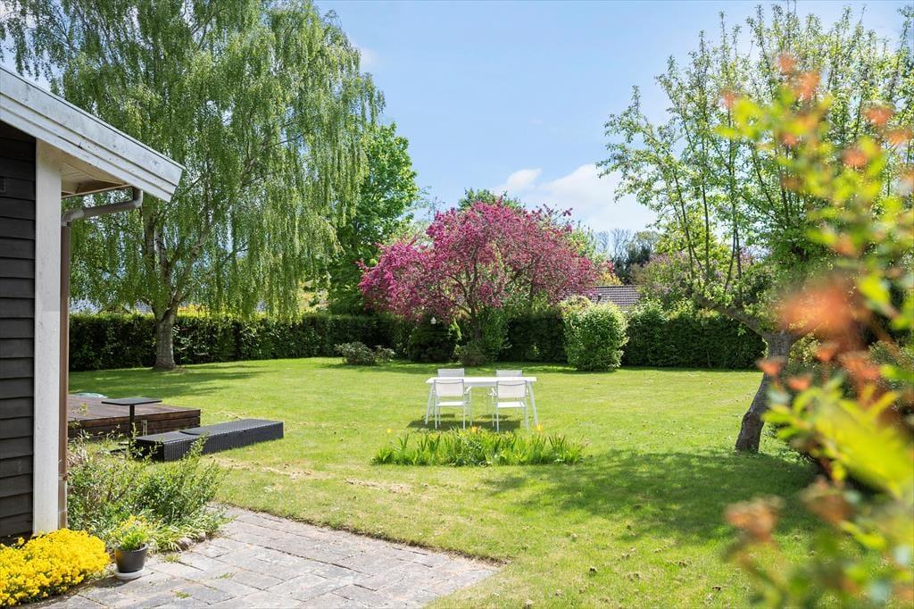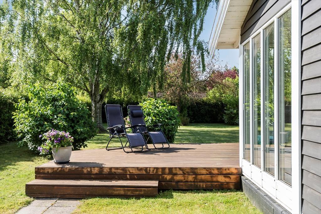 Fra stuen kan I træde direkte ud på en fin træterrasse og nyde solen her eller på af de andre hyggekroge i haven. Haven har en fin beplantning og er lukket og ugenert, her er også en sandkasse til de små. Hvis aftenerne bliver kølige, kan I trække ind i på den afskærmede del af træterrassen og er der noget bedre end at sidde og nyde roen sænke sig med et glas vin eller en god kop te eller kaffe? Her finder I både plads til hygge, afslapning og masser af natureventyr. Fra huset har I kun 200 meter til stranden via stisystem.