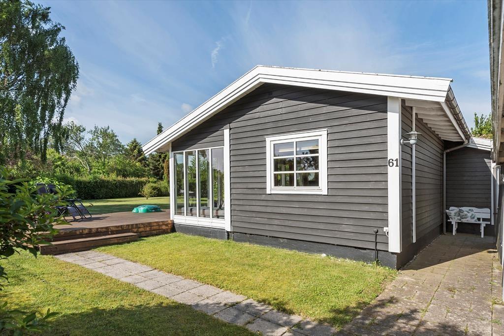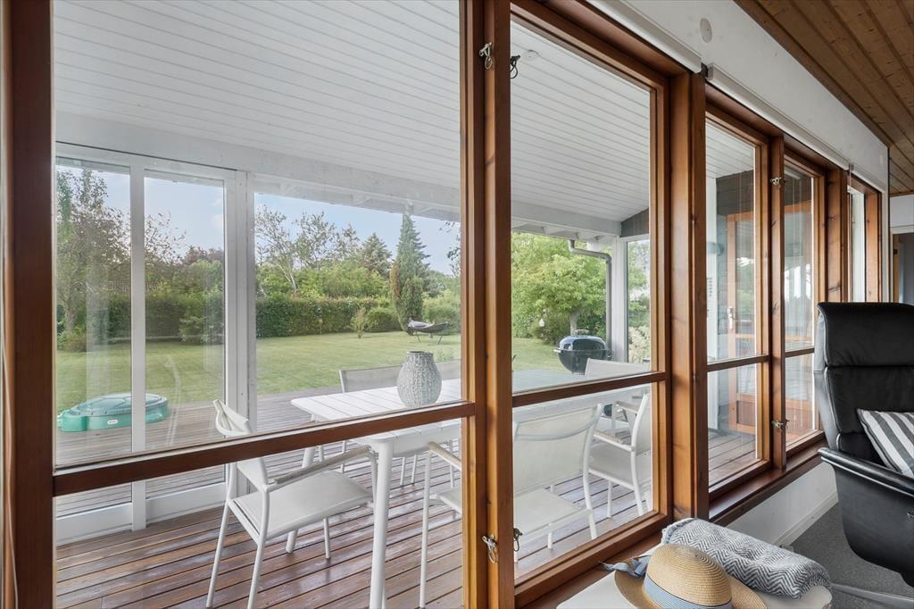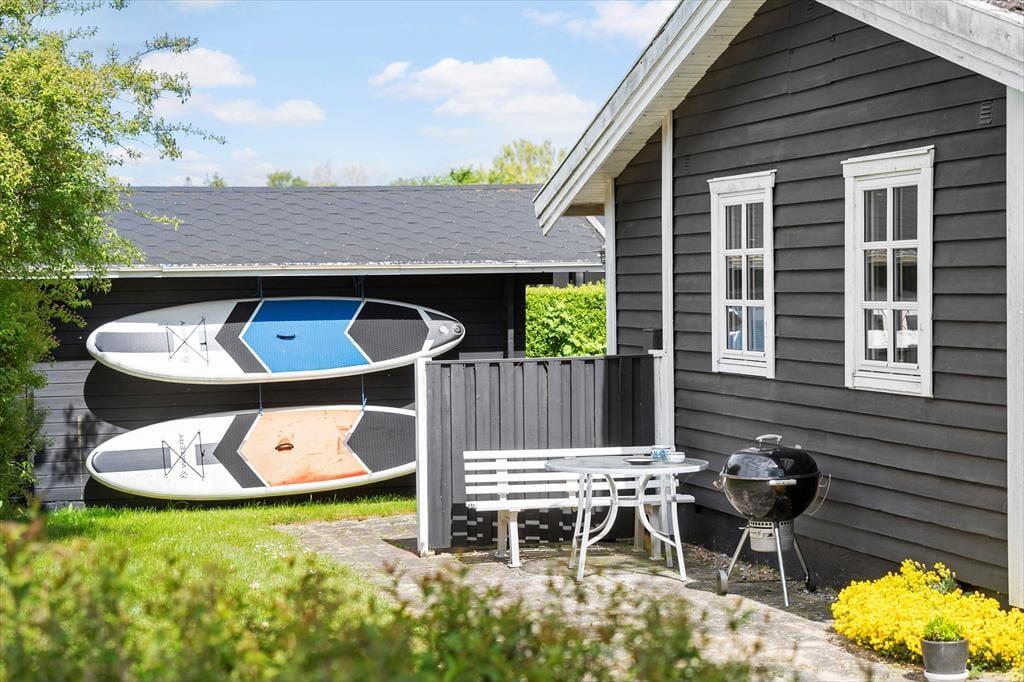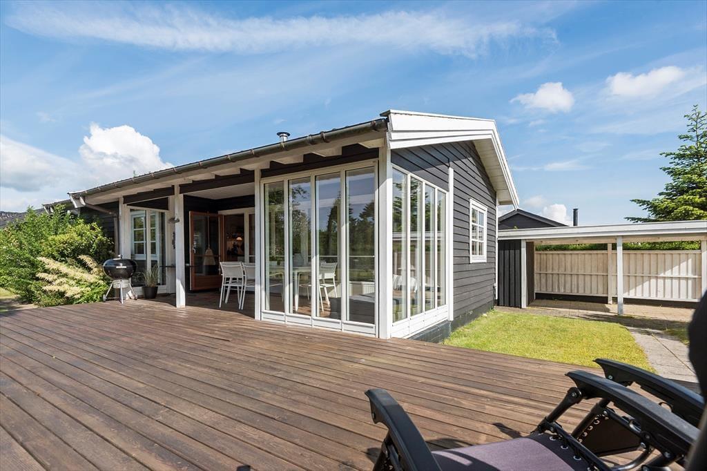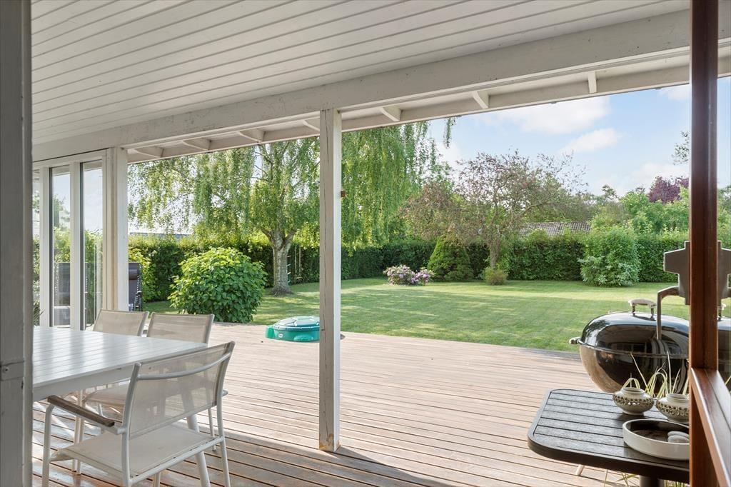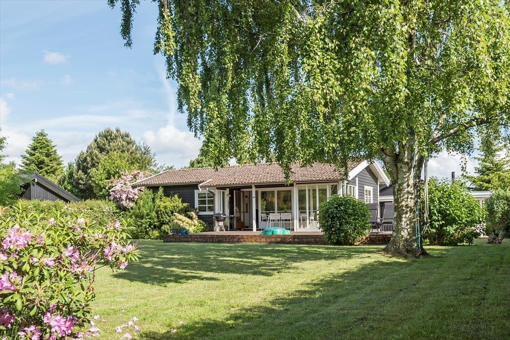 Fra stuen kan I træde direkte ud på en fin træterrasse og nyde solen her eller på af de andre hyggekroge i haven. Haven har en fin beplantning og er lukket og ugenert, her er også en sandkasse til de små. Hvis aftenerne bliver kølige, kan I trække ind i på den afskærmede del af træterrassen og er der noget bedre end at sidde og nyde roen sænke sig med et glas vin eller en god kop te eller kaffe? Her finder I både plads til hygge, afslapning og masser af natureventyr. Fra huset har I kun 200 meter til stranden via stisystem.